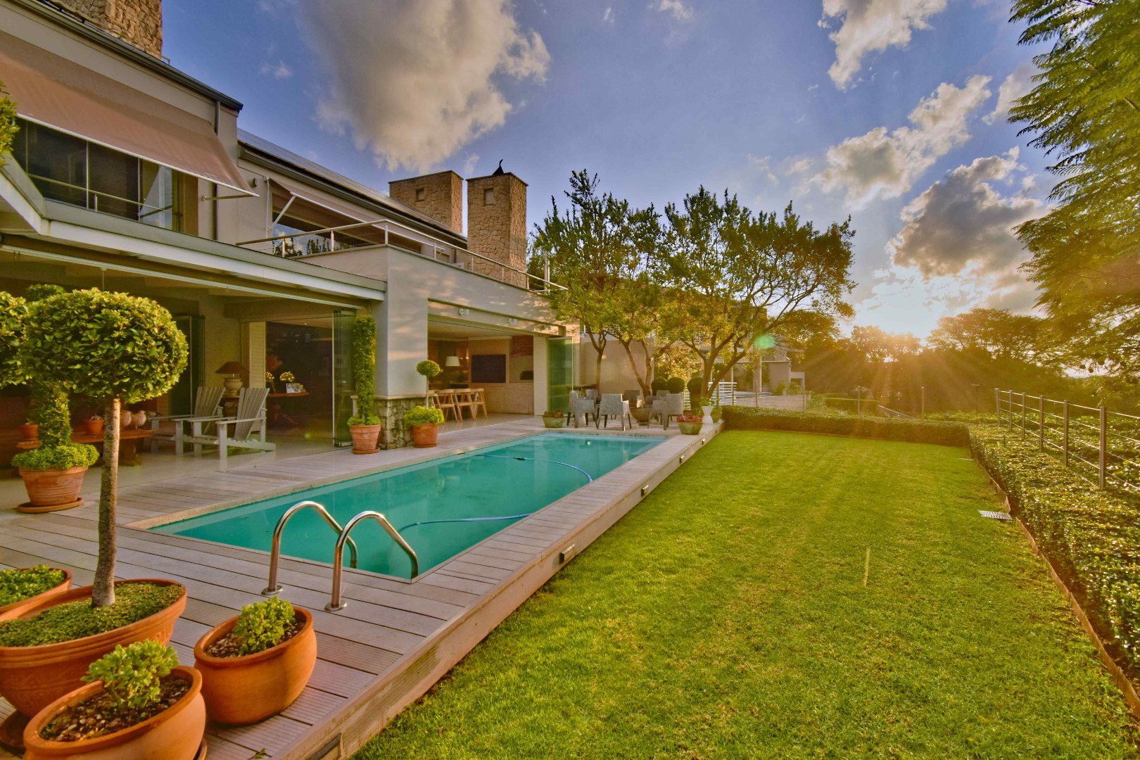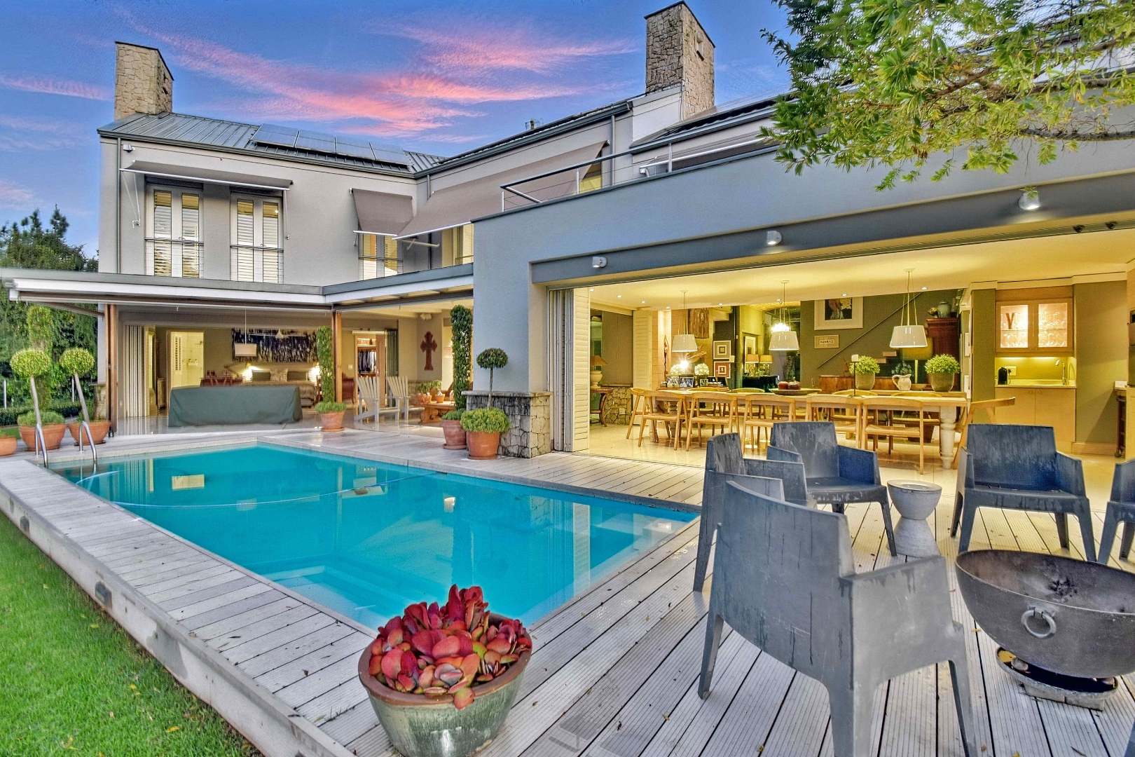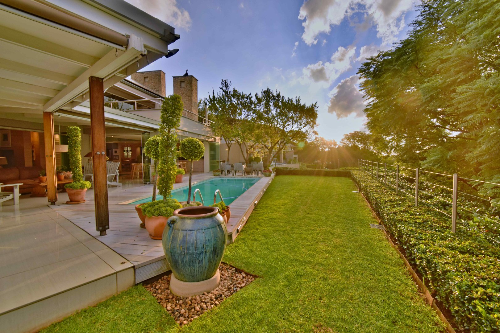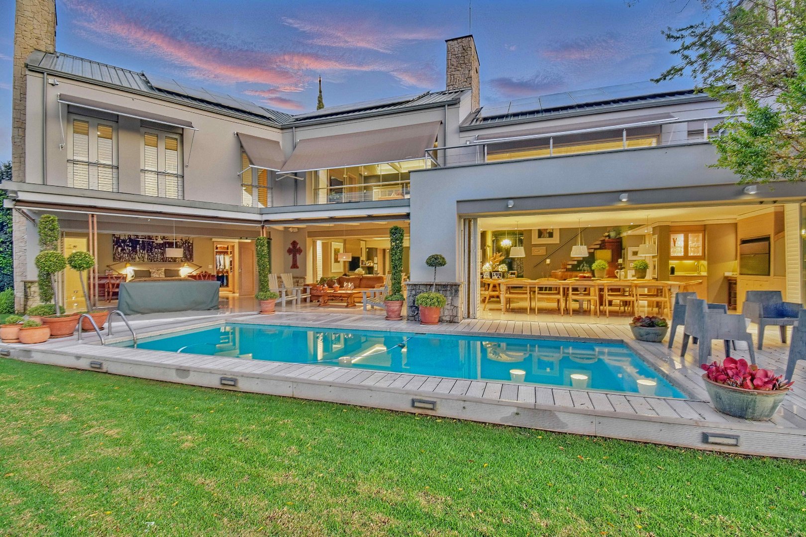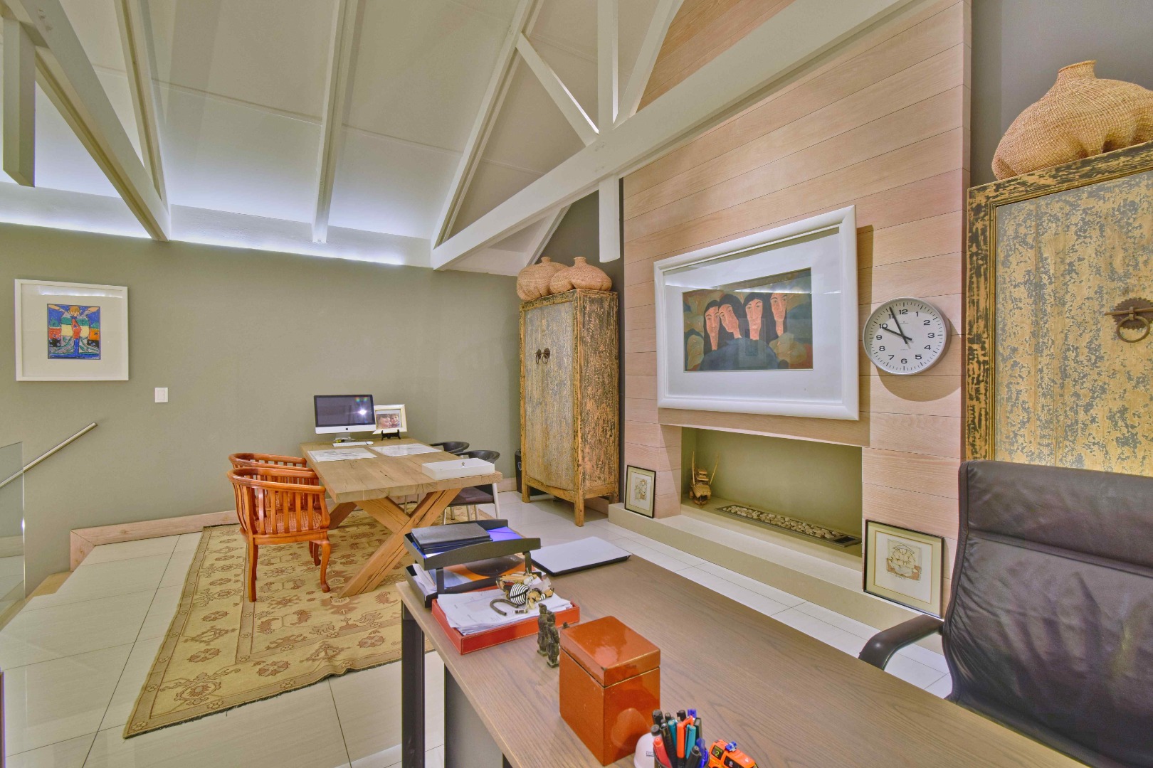 Inside, expansive open-plan living areas are filled with natural light, seamlessly connecting to the landscaped garden and entertainment spaces through frameless glass doors. A striking glass-walled wine cellar complements the dining area, while informal gatherings centre around the fire pit or built-in pizza oven. The designer kitchen blends beauty with practicality, featuring a scullery with space for three appliances, ample storage, and premium finishes. The ground-floor main suite is an opulent retreat with a walk-in closet and indulgent en suite bathroom with a steam shower. Upstairs, two pajama lounges with fireplaces and balconies create cozy family retreats, complemented by two spacious en suite bedrooms. A private flatlet with kitchenette and bathroom, a versatile study or creative studio, and well-equipped staff quarters complete the home.