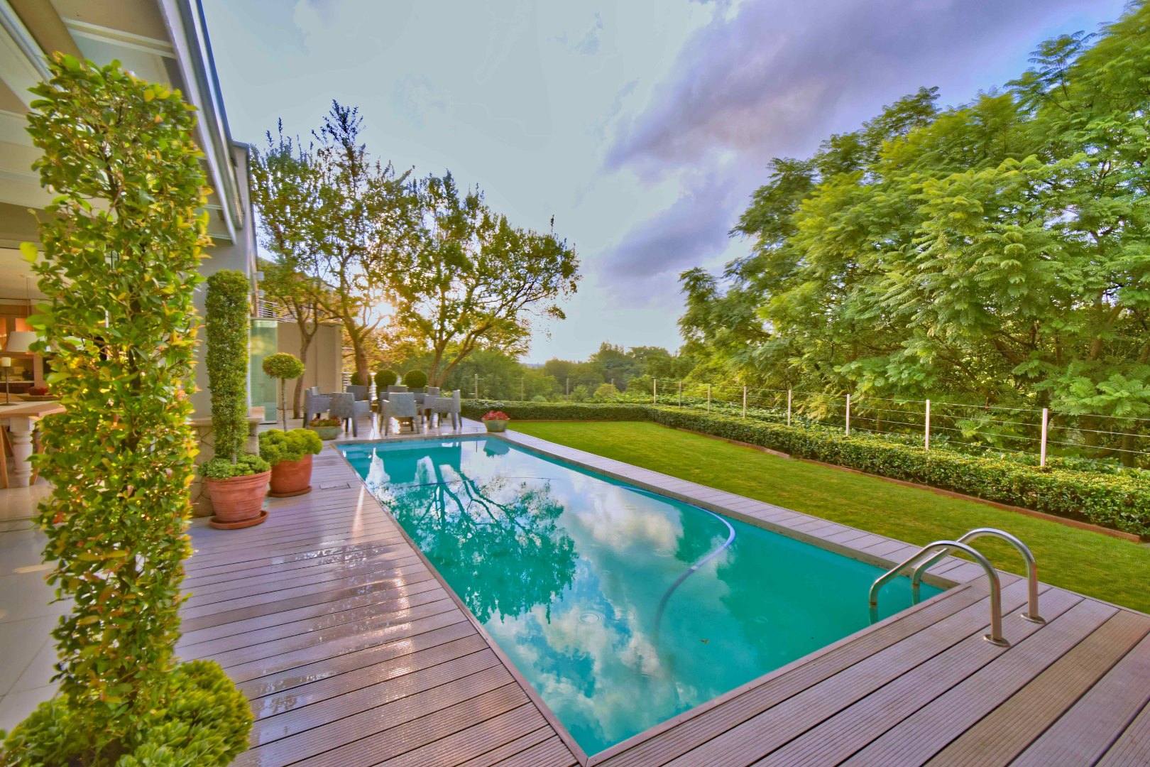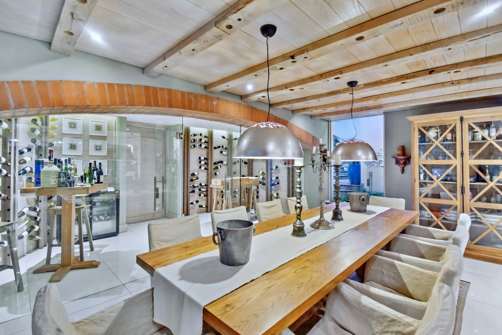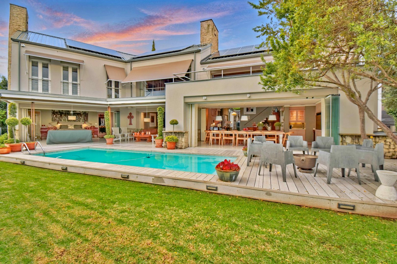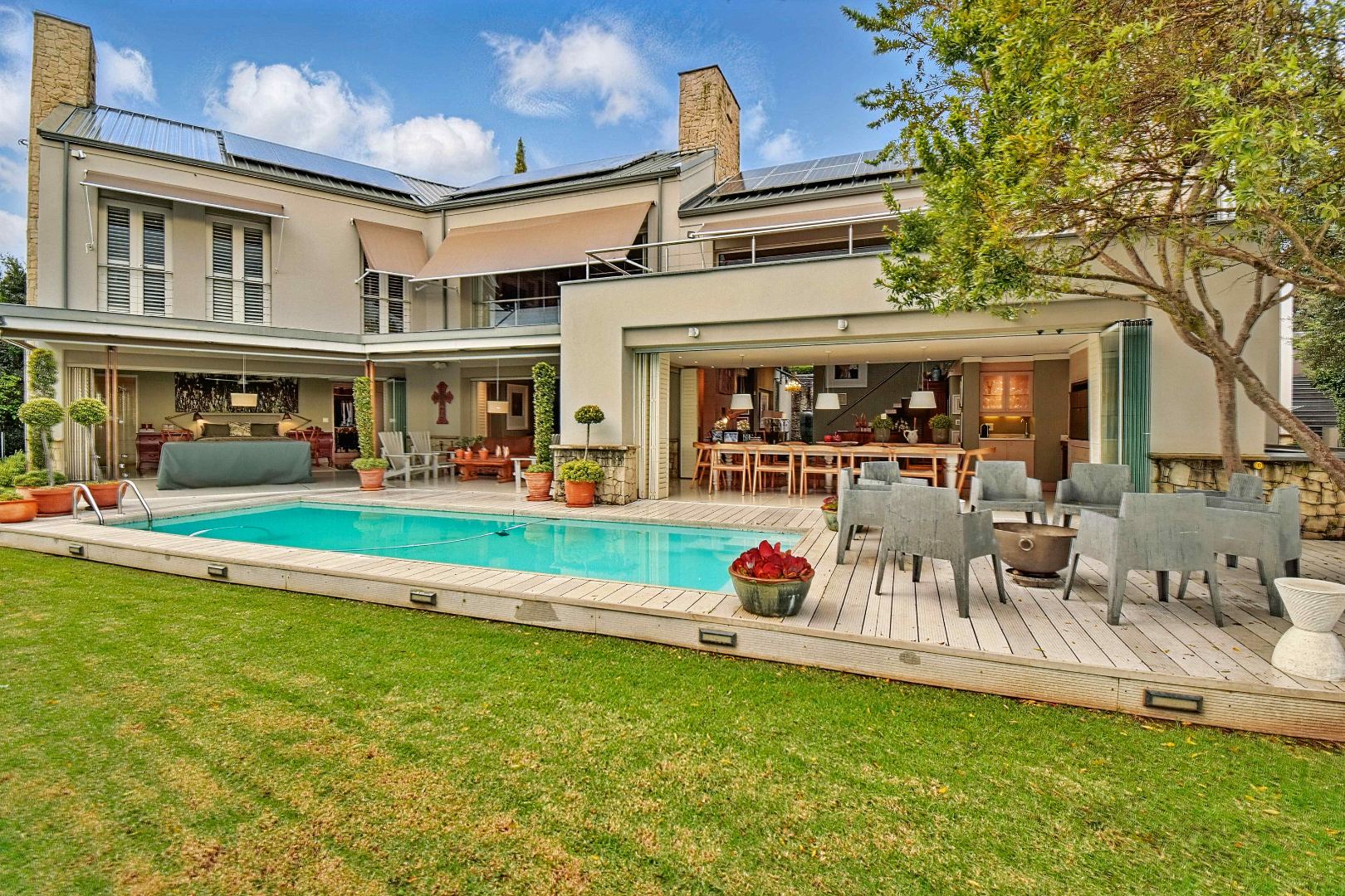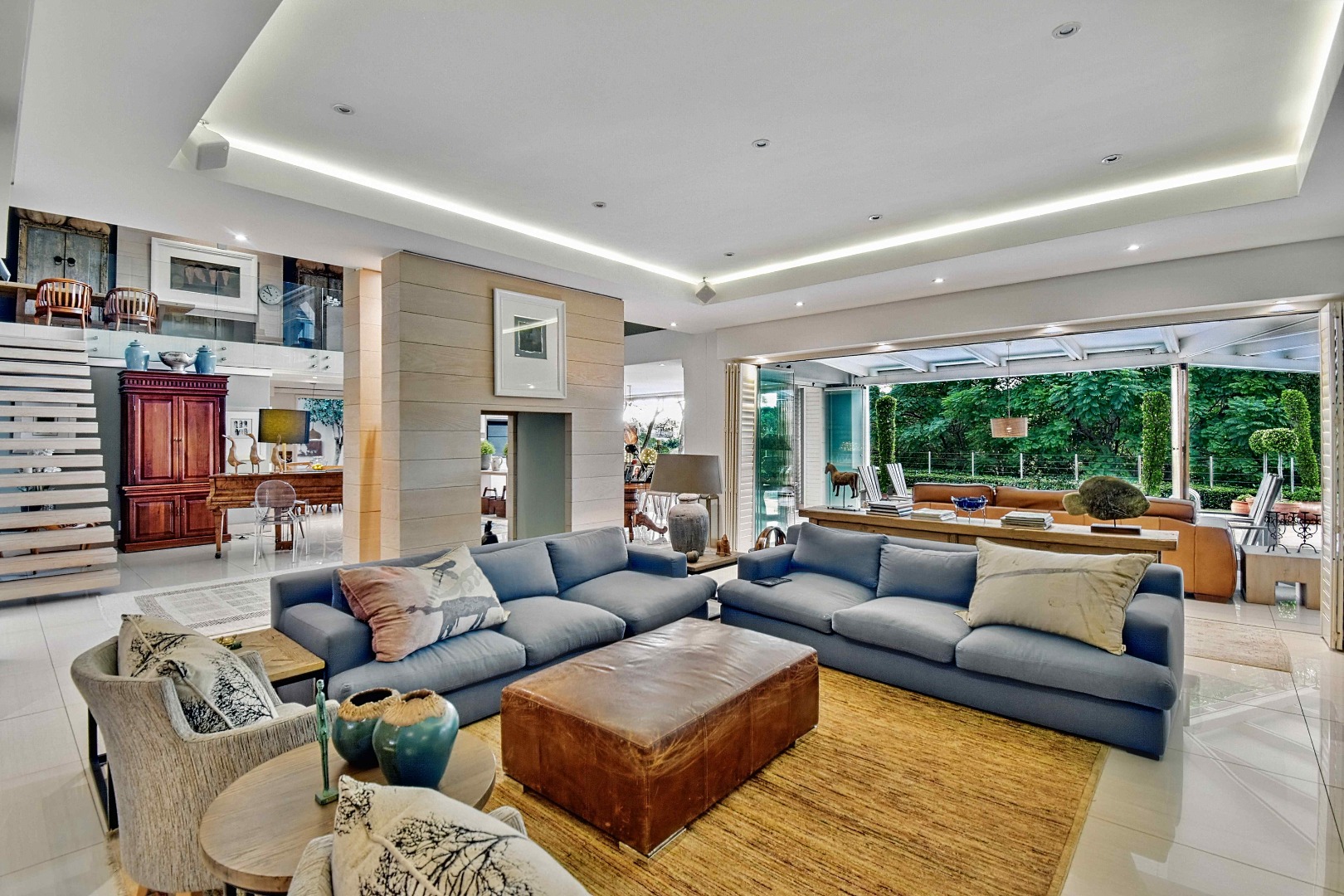 Inside, expansive open-plan living areas are filled with natural light, seamlessly connecting to the landscaped garden and entertainment spaces through frameless glass doors. A striking glass-walled wine cellar complements the dining area, while informal gatherings centre around the fire pit or built-in pizza oven. The designer kitchen blends beauty with practicality, featuring a scullery with space for three appliances, ample storage, and premium finishes. The ground-floor main suite is an opulent retreat with a walk-in closet and indulgent en suite bathroom with a steam shower. Upstairs, two pajama lounges with fireplaces and balconies create cozy family retreats, complemented by two spacious en suite bedrooms. A private flatlet with kitchenette and bathroom, a versatile study or creative studio, and well-equipped staff quarters complete the home.
