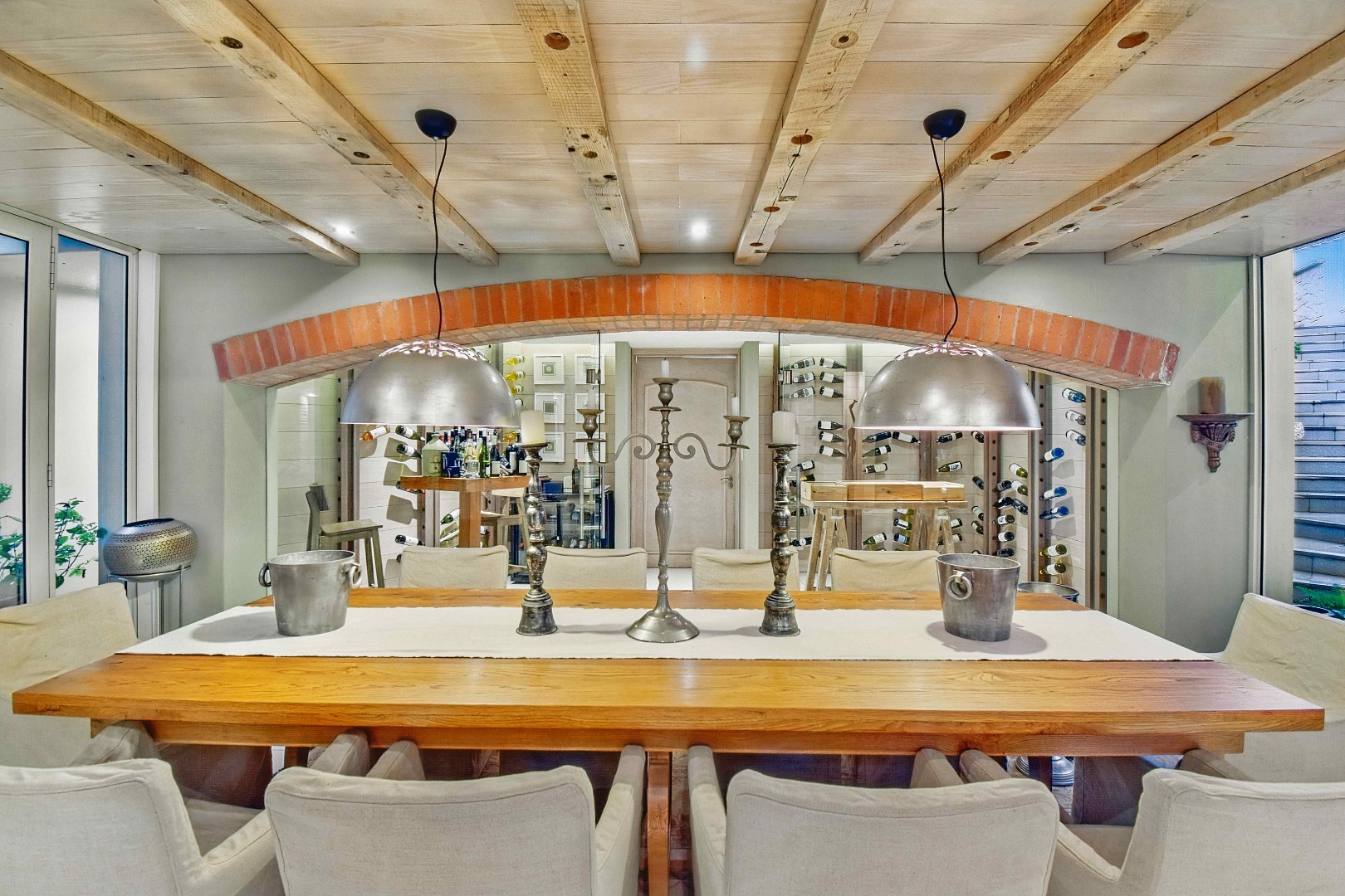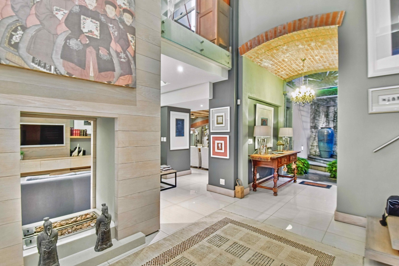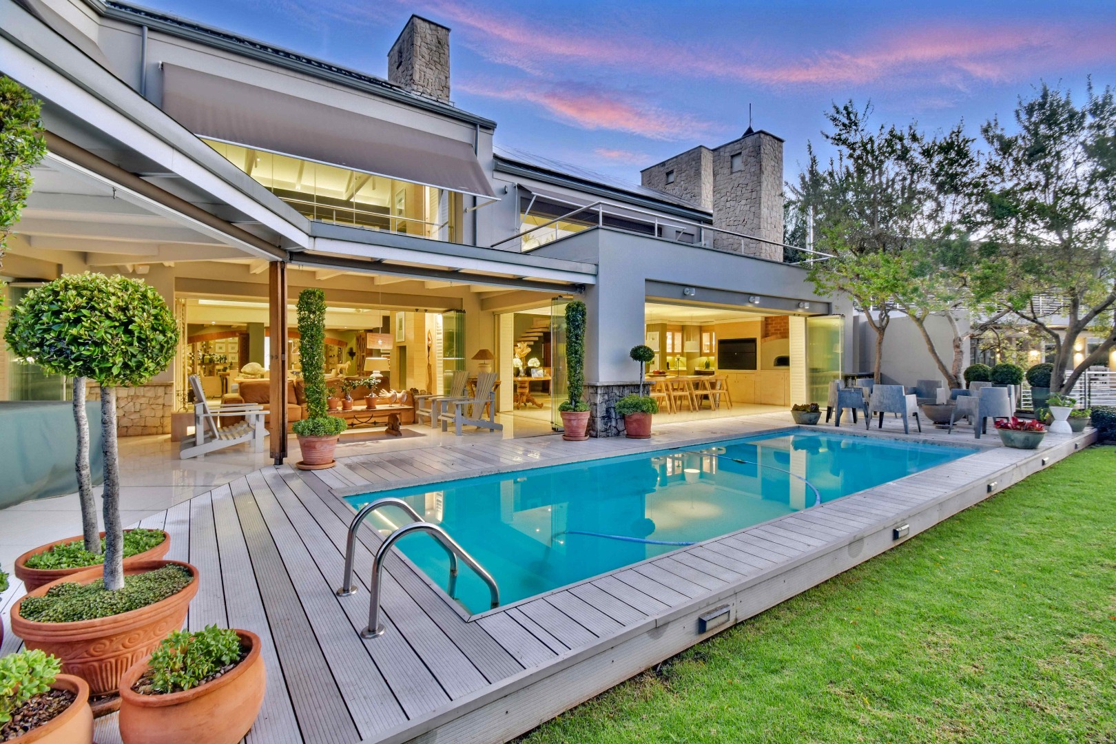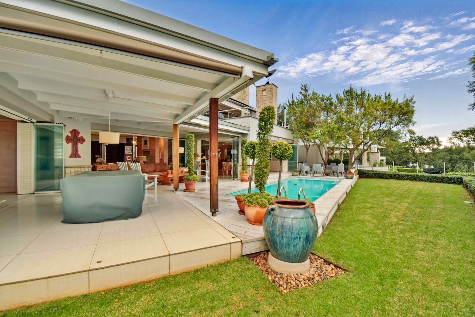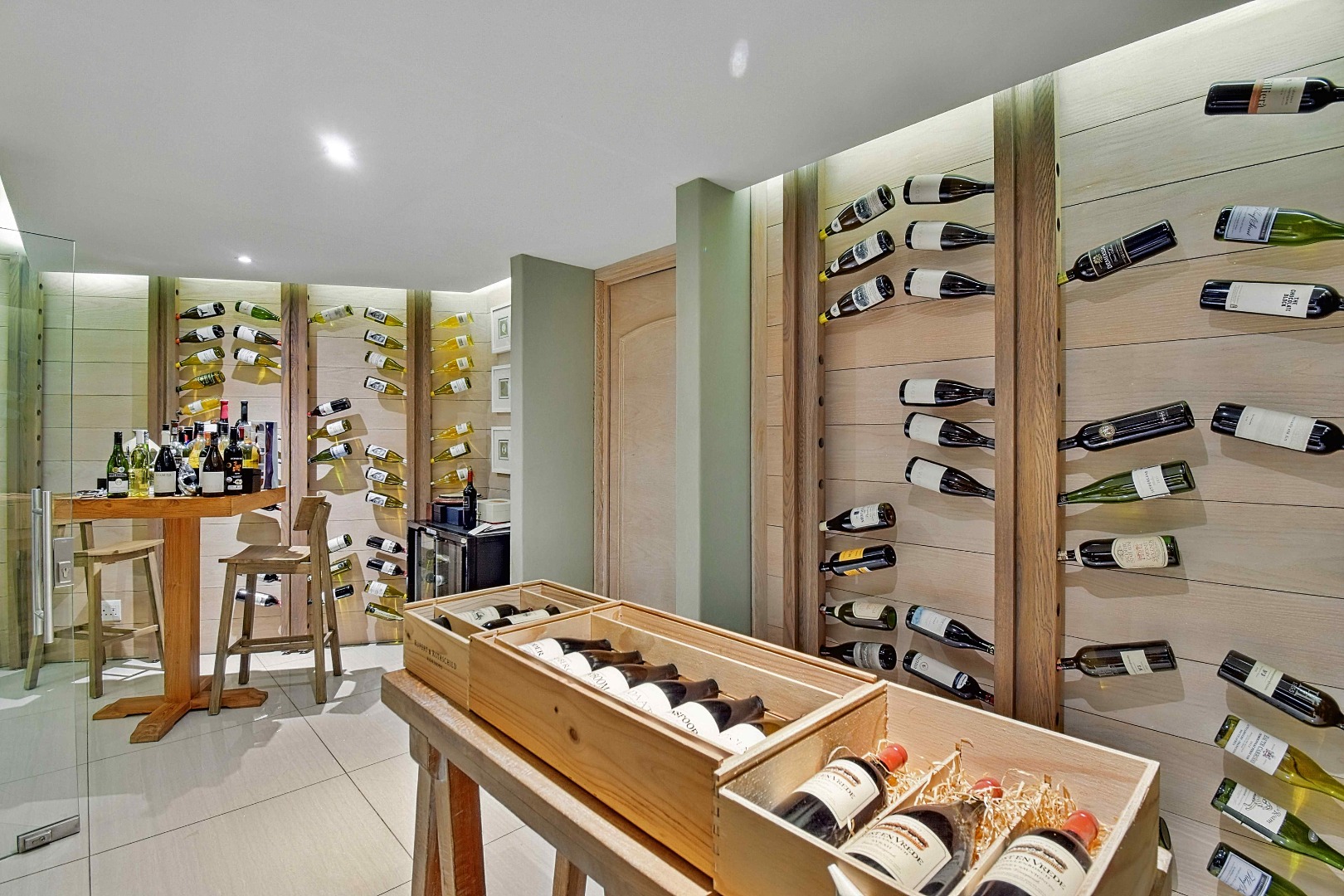 Inside, expansive open-plan living areas are filled with natural light, seamlessly connecting to the landscaped garden and entertainment spaces through frameless glass doors. A striking glass-walled wine cellar complements the dining area, while informal gatherings centre around the fire pit or built-in pizza oven. The designer kitchen blends beauty with practicality, featuring a scullery with space for three appliances, ample storage, and premium finishes. The ground-floor main suite is an opulent retreat with a walk-in closet and indulgent en suite bathroom with a steam shower. Upstairs, two pajama lounges with fireplaces and balconies create cozy family retreats, complemented by two spacious en suite bedrooms. A private flatlet with kitchenette and bathroom, a versatile study or creative studio, and well-equipped staff quarters complete the home.