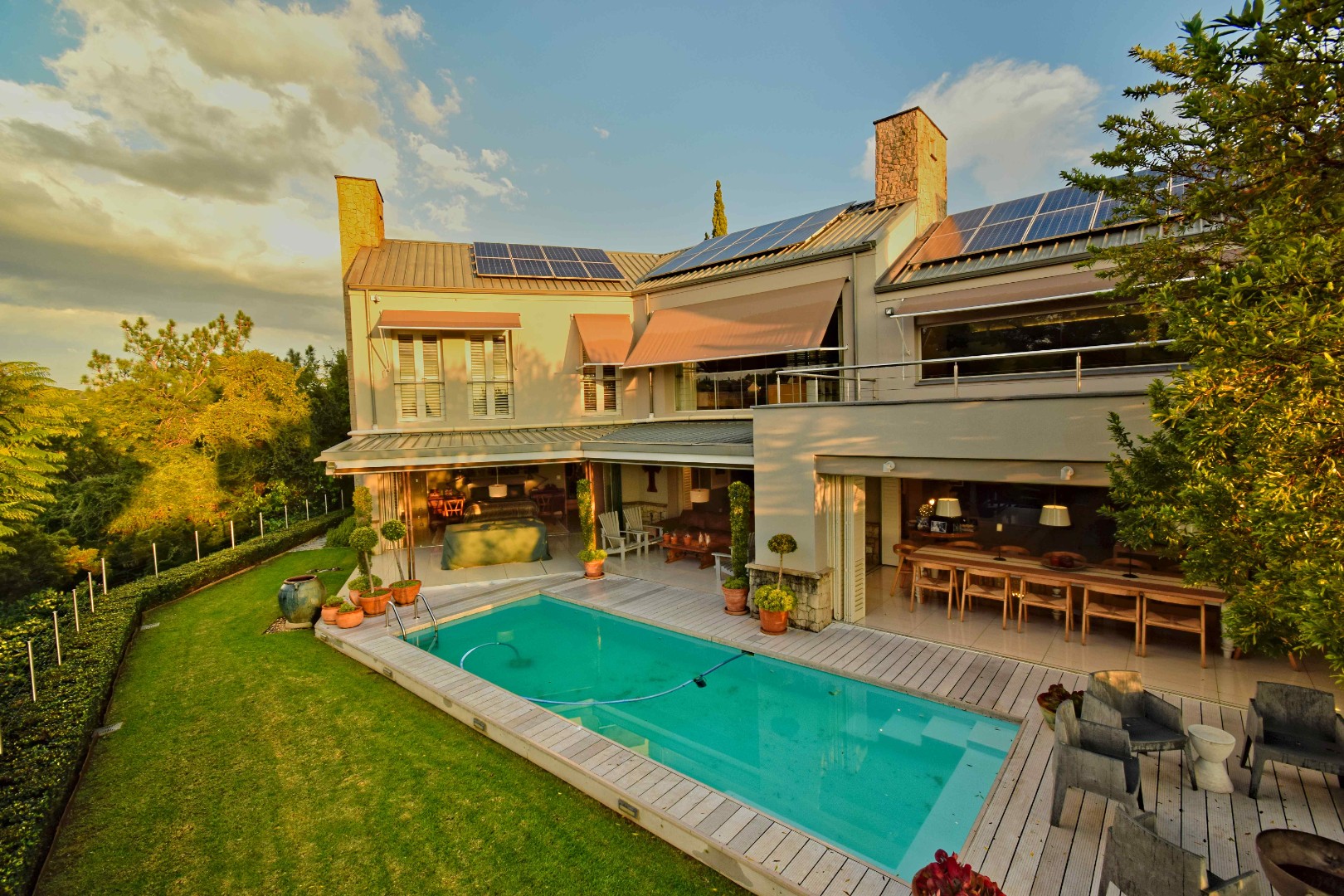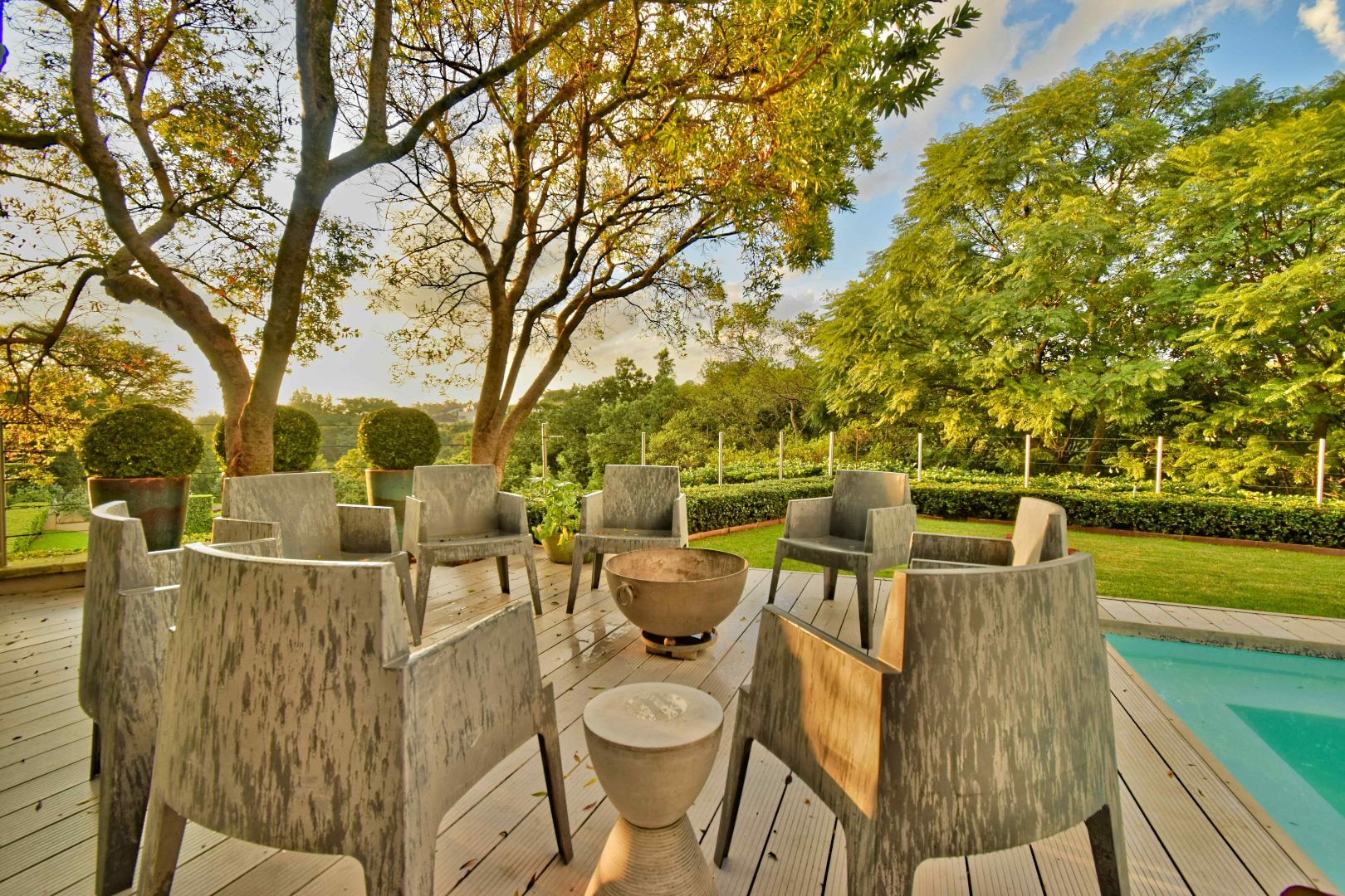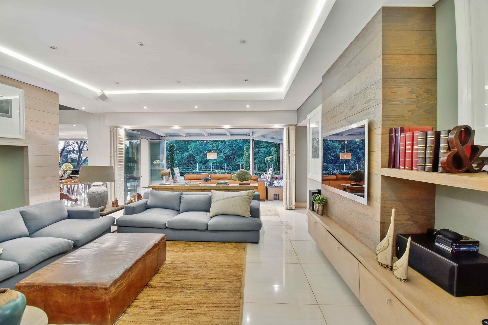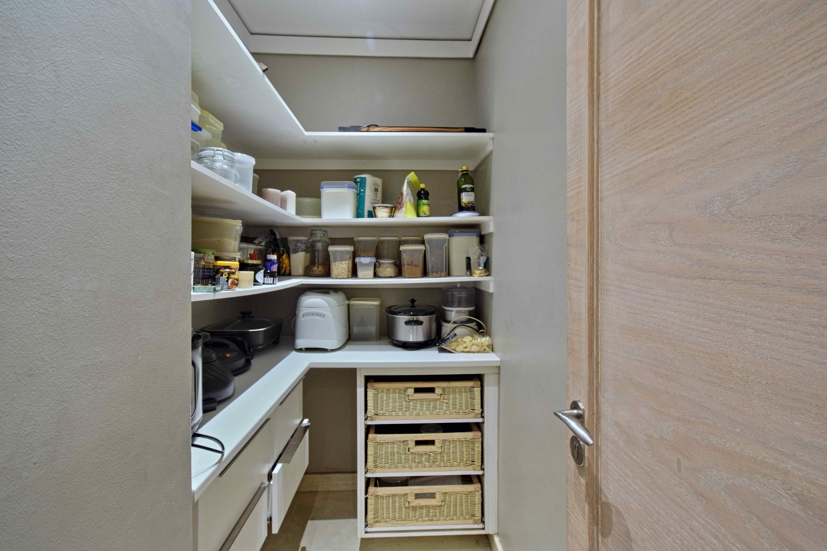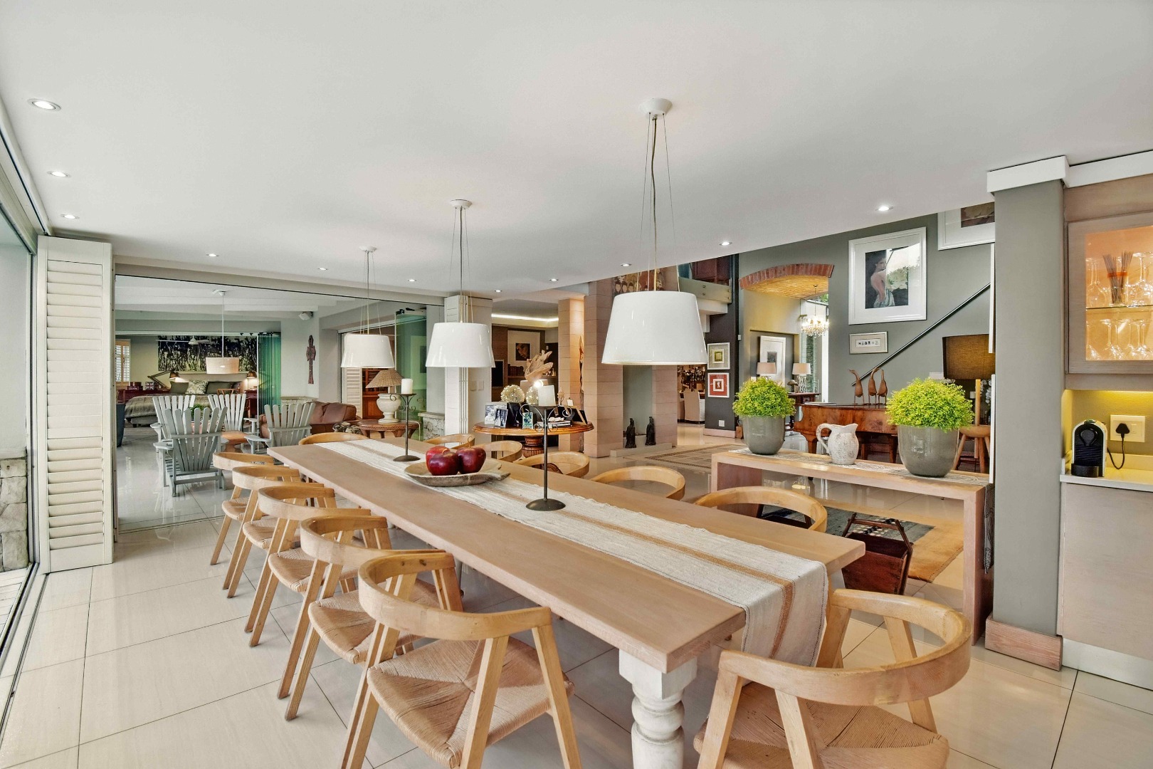 Inside, expansive open-plan living areas are filled with natural light, seamlessly connecting to the landscaped garden and entertainment spaces through frameless glass doors. A striking glass-walled wine cellar complements the dining area, while informal gatherings centre around the fire pit or built-in pizza oven. The designer kitchen blends beauty with practicality, featuring a scullery with space for three appliances, ample storage, and premium finishes. The ground-floor main suite is an opulent retreat with a walk-in closet and indulgent en suite bathroom with a steam shower. Upstairs, two pajama lounges with fireplaces and balconies create cozy family retreats, complemented by two spacious en suite bedrooms. A private flatlet with kitchenette and bathroom, a versatile study or creative studio, and well-equipped staff quarters complete the home.