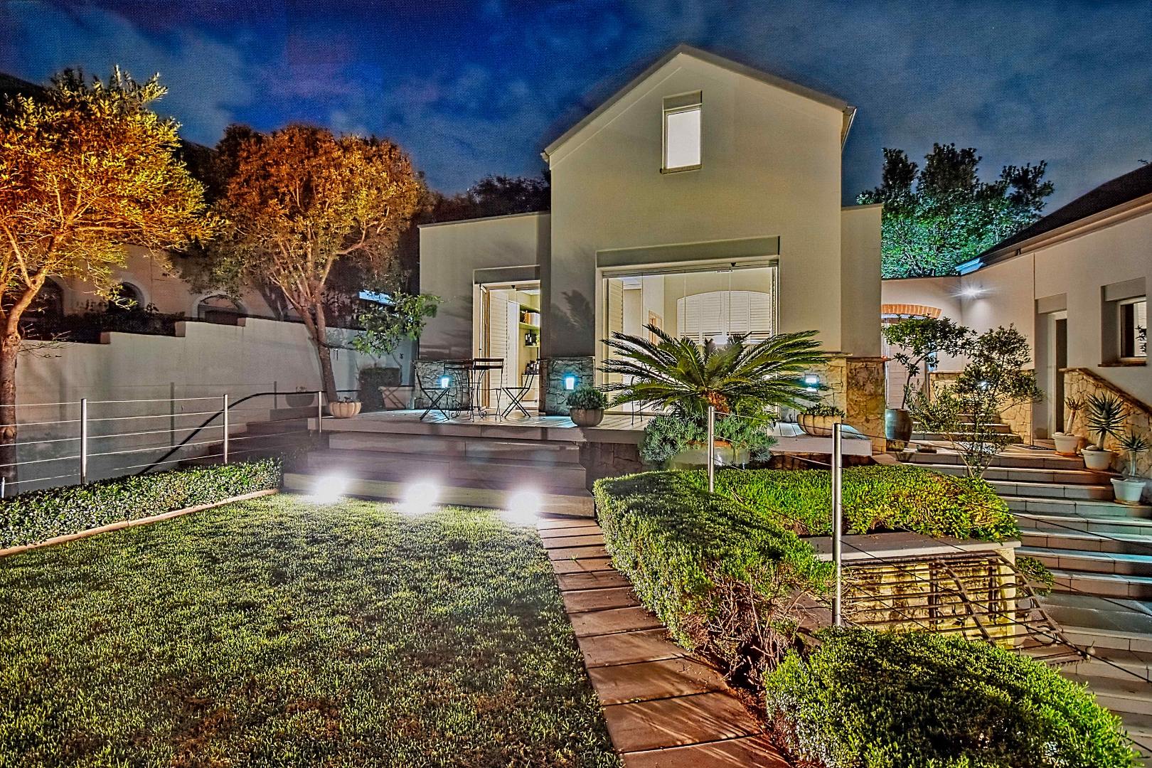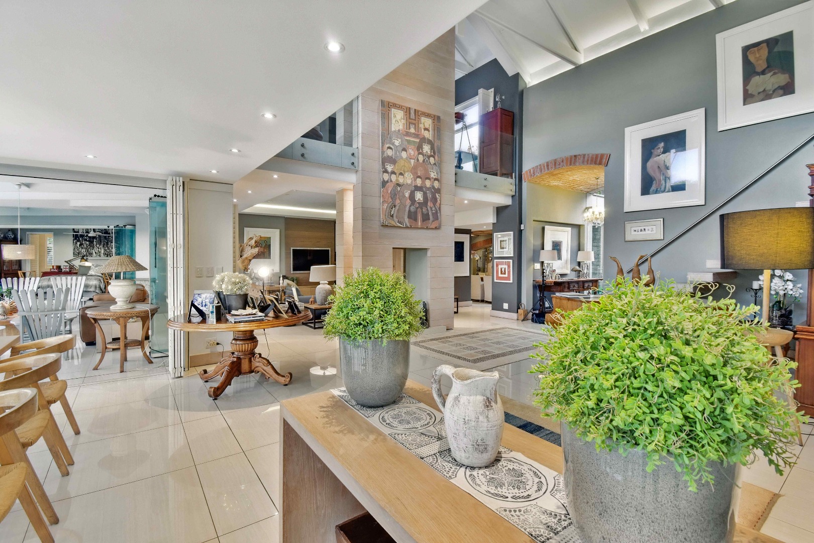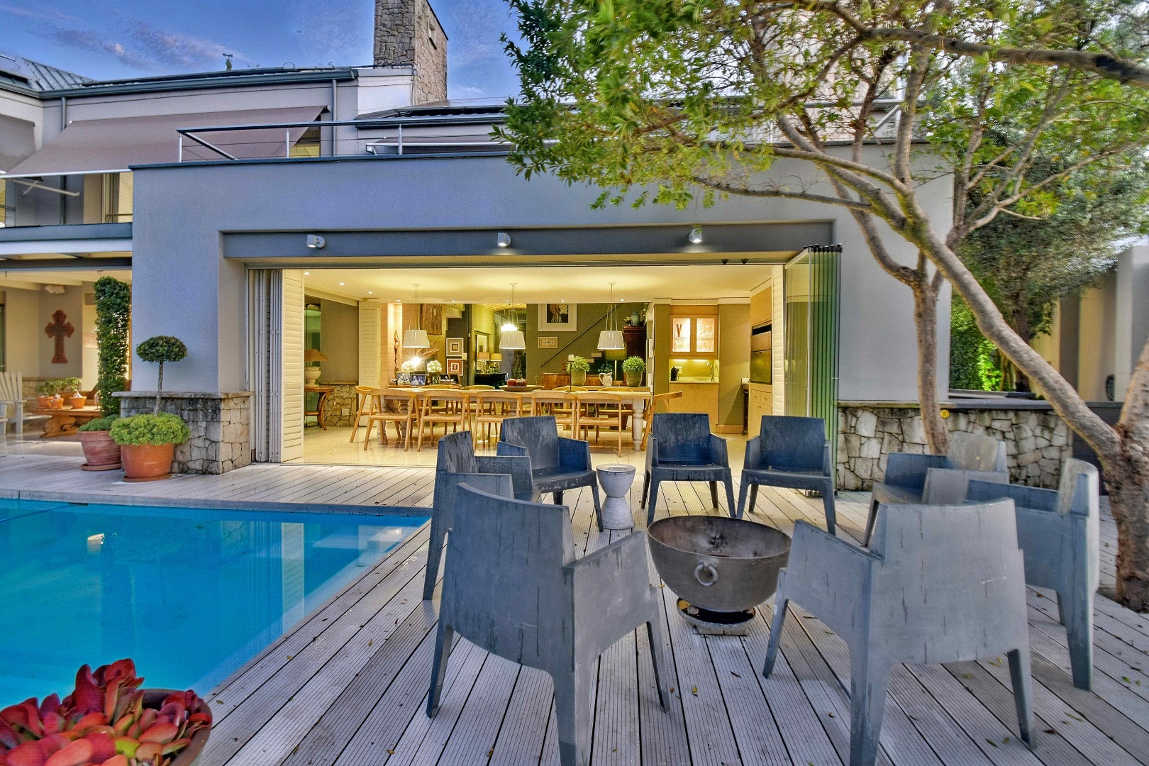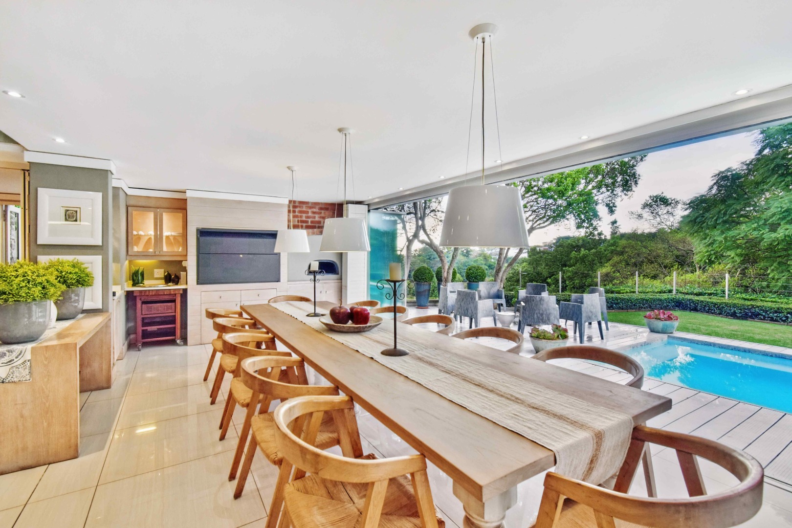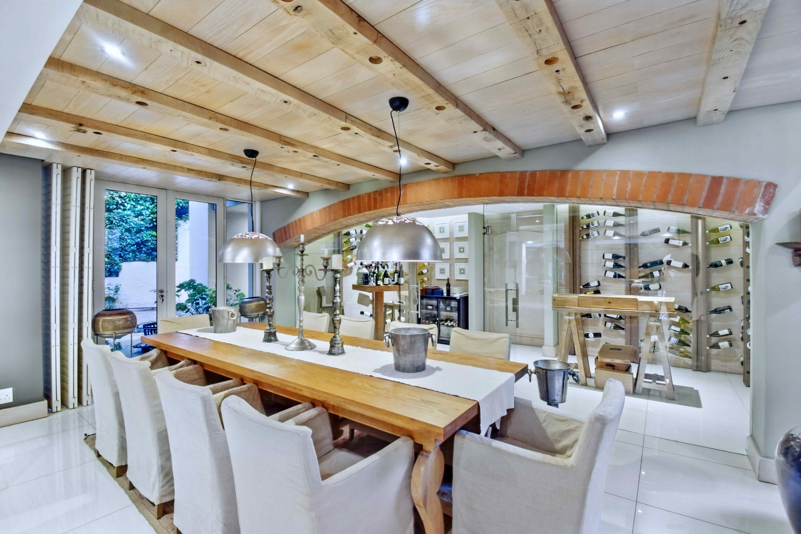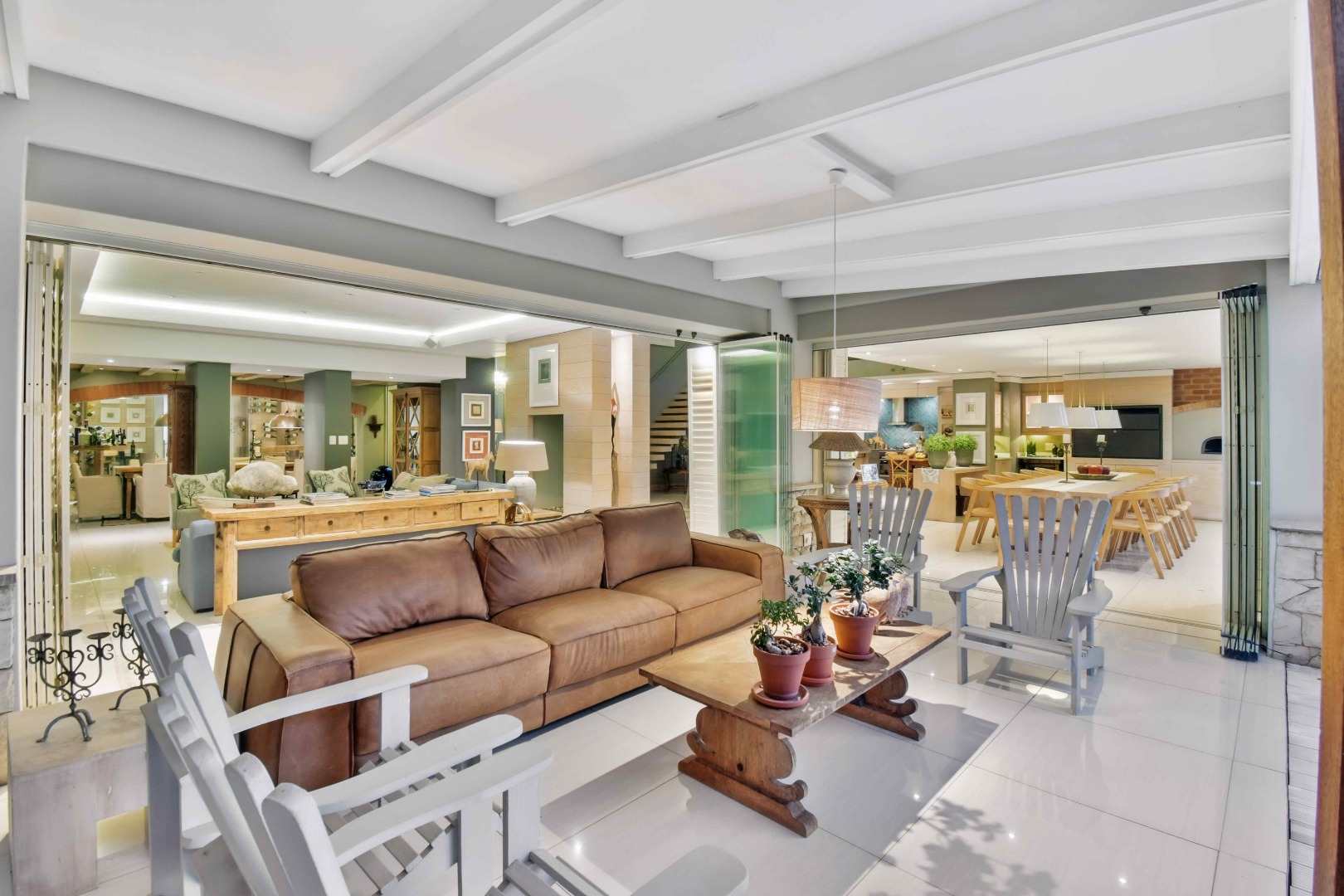 Inside, expansive open-plan living areas are filled with natural light, seamlessly connecting to the landscaped garden and entertainment spaces through frameless glass doors. A striking glass-walled wine cellar complements the dining area, while informal gatherings centre around the fire pit or built-in pizza oven. The designer kitchen blends beauty with practicality, featuring a scullery with space for three appliances, ample storage, and premium finishes. The ground-floor main suite is an opulent retreat with a walk-in closet and indulgent en suite bathroom with a steam shower. Upstairs, two pajama lounges with fireplaces and balconies create cozy family retreats, complemented by two spacious en suite bedrooms. A private flatlet with kitchenette and bathroom, a versatile study or creative studio, and well-equipped staff quarters complete the home.