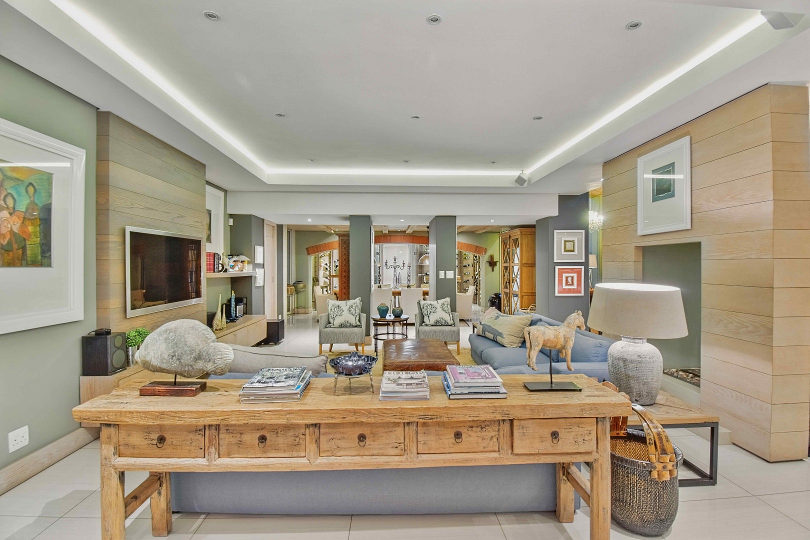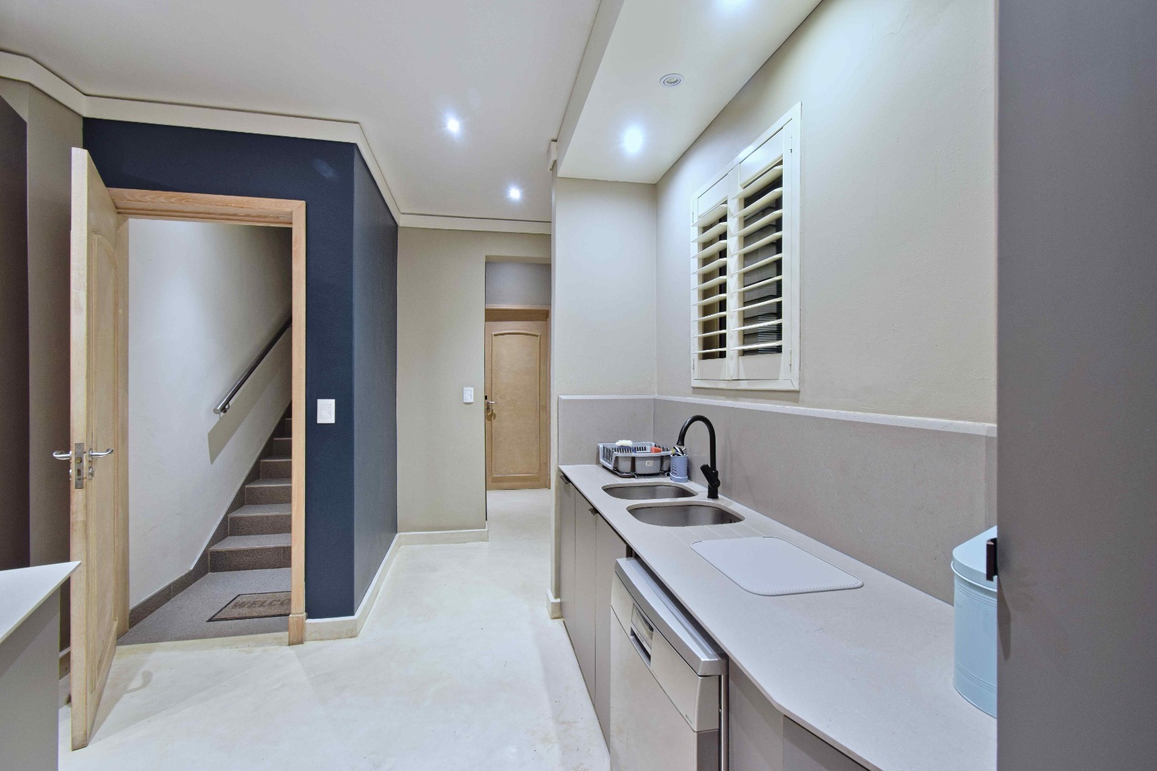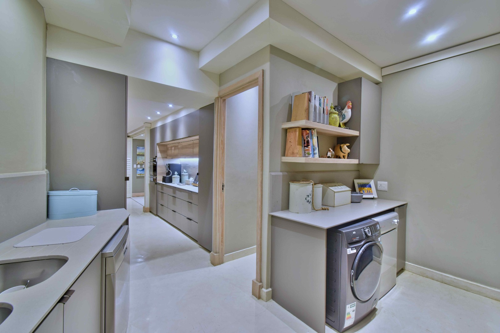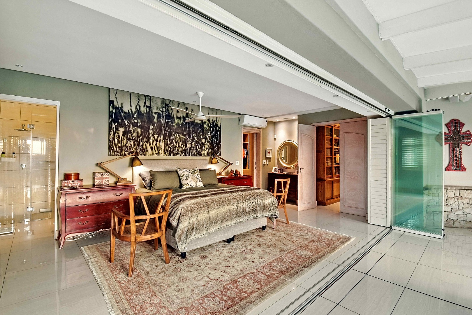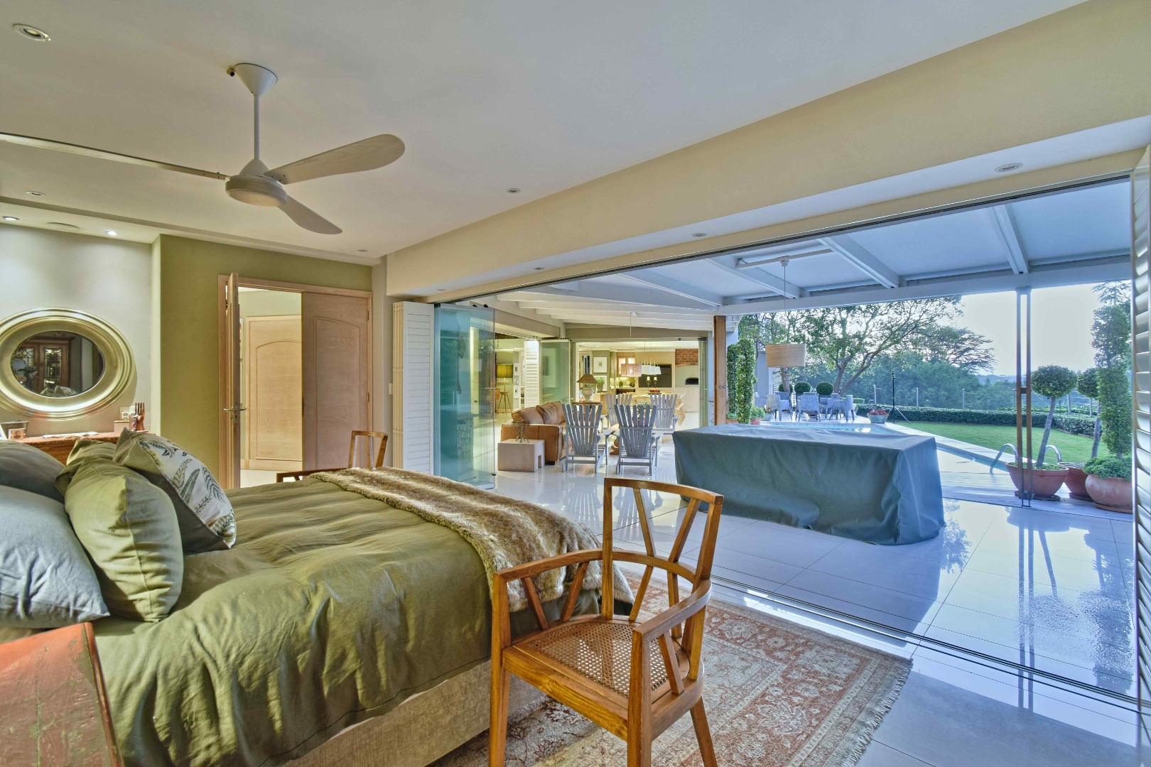 Inside, expansive open-plan living areas are filled with natural light, seamlessly connecting to the landscaped garden and entertainment spaces through frameless glass doors. A striking glass-walled wine cellar complements the dining area, while informal gatherings centre around the fire pit or built-in pizza oven. The designer kitchen blends beauty with practicality, featuring a scullery with space for three appliances, ample storage, and premium finishes. The ground-floor main suite is an opulent retreat with a walk-in closet and indulgent en suite bathroom with a steam shower. Upstairs, two pajama lounges with fireplaces and balconies create cozy family retreats, complemented by two spacious en suite bedrooms. A private flatlet with kitchenette and bathroom, a versatile study or creative studio, and well-equipped staff quarters complete the home.