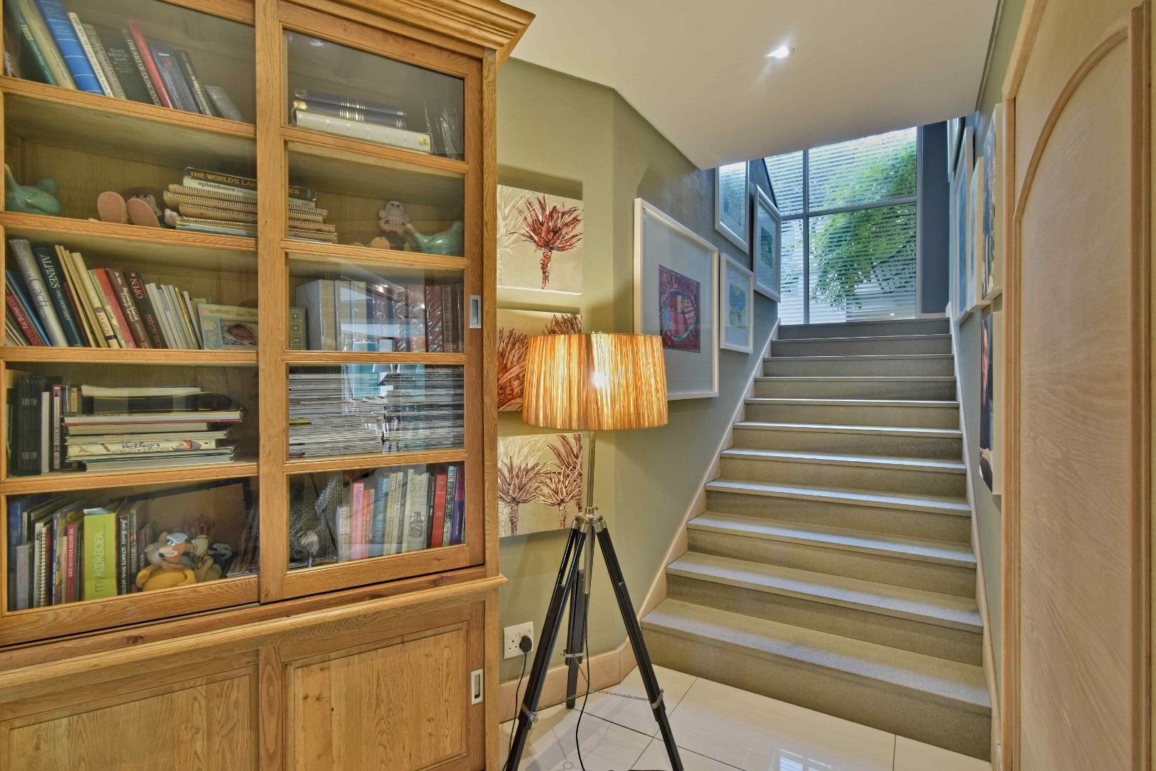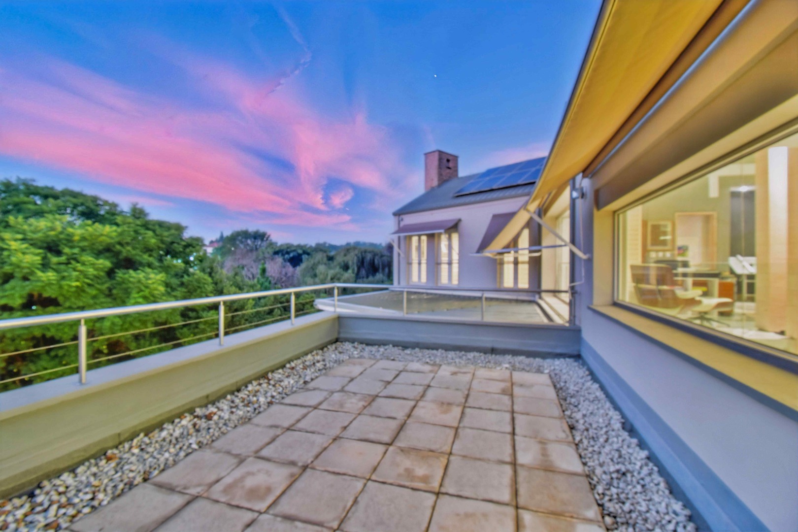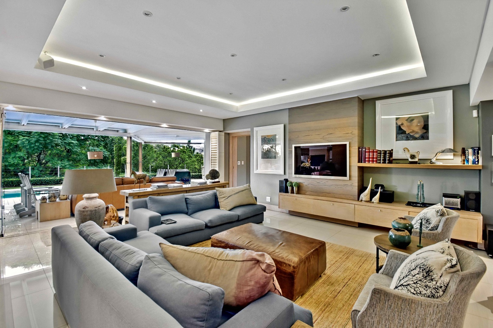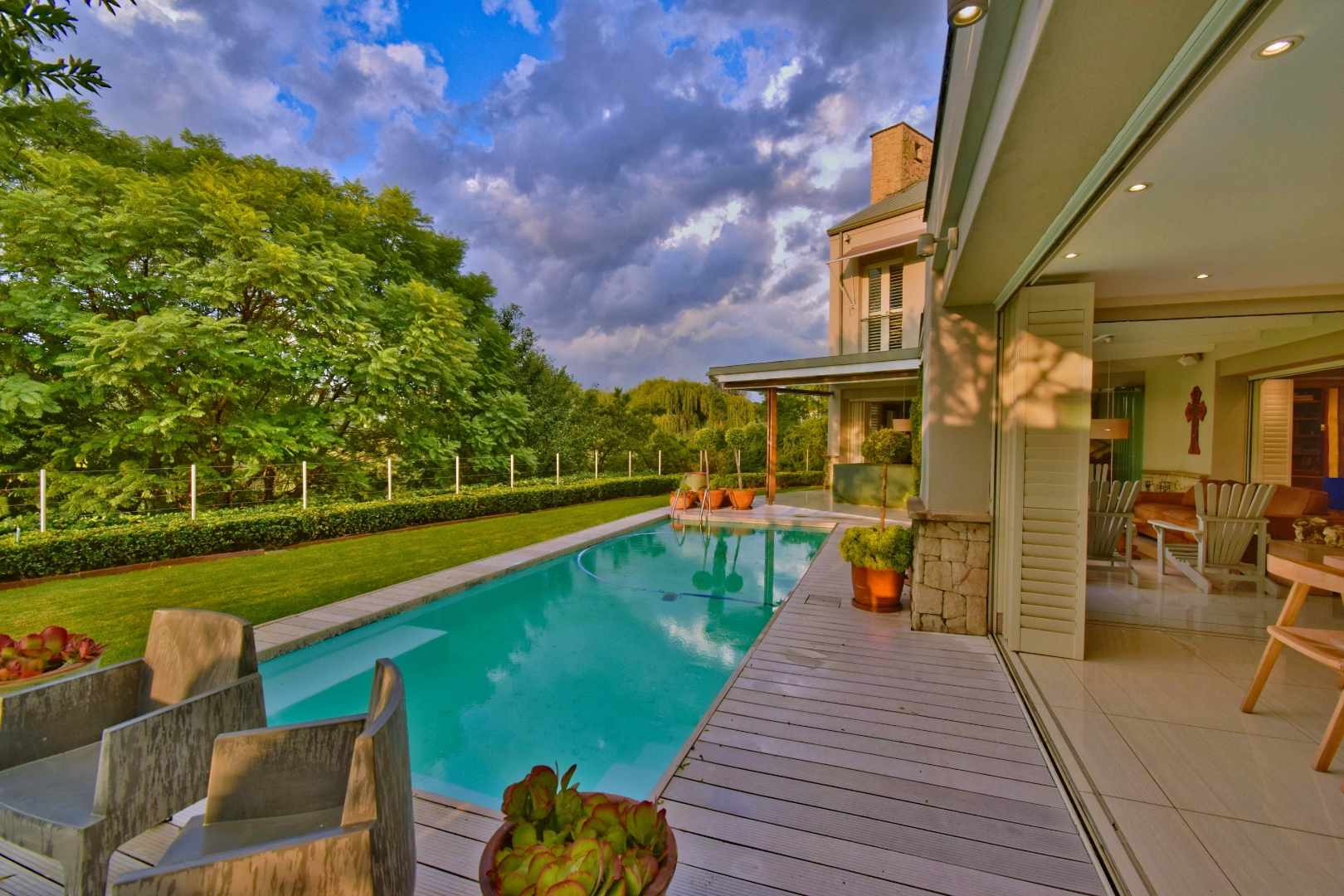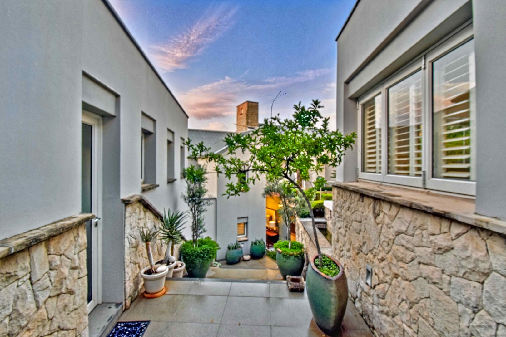 Inside, expansive open-plan living areas are filled with natural light, seamlessly connecting to the landscaped garden and entertainment spaces through frameless glass doors. A striking glass-walled wine cellar complements the dining area, while informal gatherings centre around the fire pit or built-in pizza oven. The designer kitchen blends beauty with practicality, featuring a scullery with space for three appliances, ample storage, and premium finishes. The ground-floor main suite is an opulent retreat with a walk-in closet and indulgent en suite bathroom with a steam shower. Upstairs, two pajama lounges with fireplaces and balconies create cozy family retreats, complemented by two spacious en suite bedrooms. A private flatlet with kitchenette and bathroom, a versatile study or creative studio, and well-equipped staff quarters complete the home.