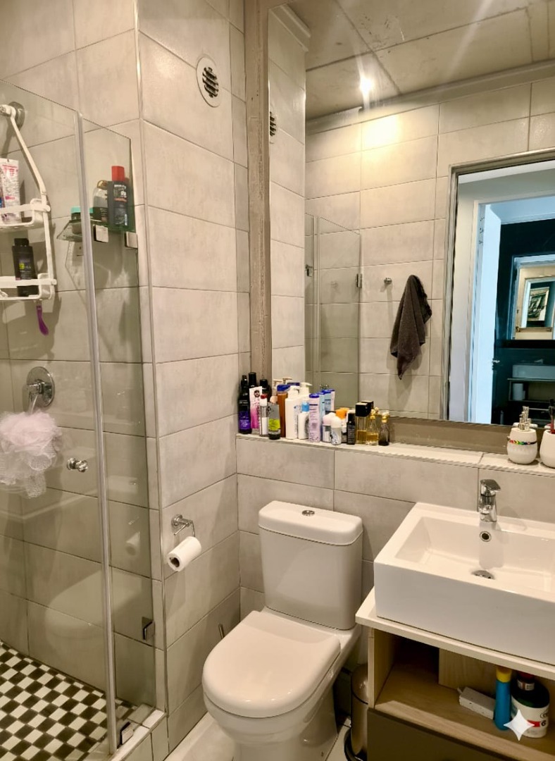 The apartment offers two comfortable bedrooms, each designed for rest and study. The bedrooms feature easy-to-clean tiled flooring and benefit from built-in wardrobes, maximising storage efficiency. The two modern bathrooms are finished with light grey horizontal tiling, wall-mounted sinks with integrated storage, and glass-enclosed showers, providing a clean and functional space.