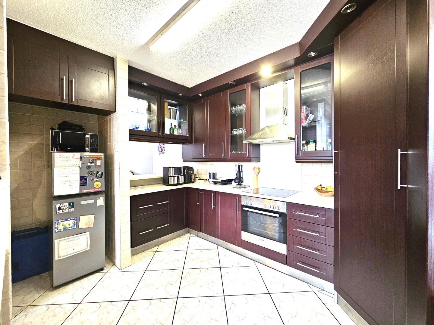 The heart of this home is its modern kitchen, boasting extensive dark wood-toned cabinetry complemented by light countertops. It comes equipped with an eye-level oven, hob, extractor fan, breakfast nook, space for a double door fridge and a built-in microwave, ensuring both functionality and a sleek aesthetic. Ample storage solutions, including glass-front cabinets, cater to all your culinary needs. The adjacent scullery also thoughtfully incorporates space for three appliances, enhancing convenience.