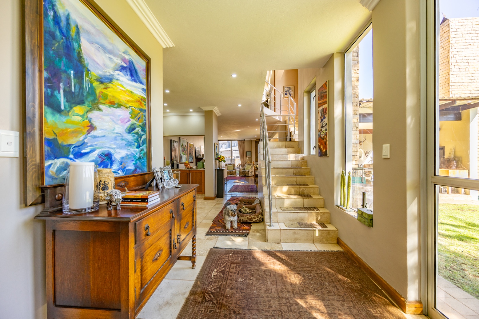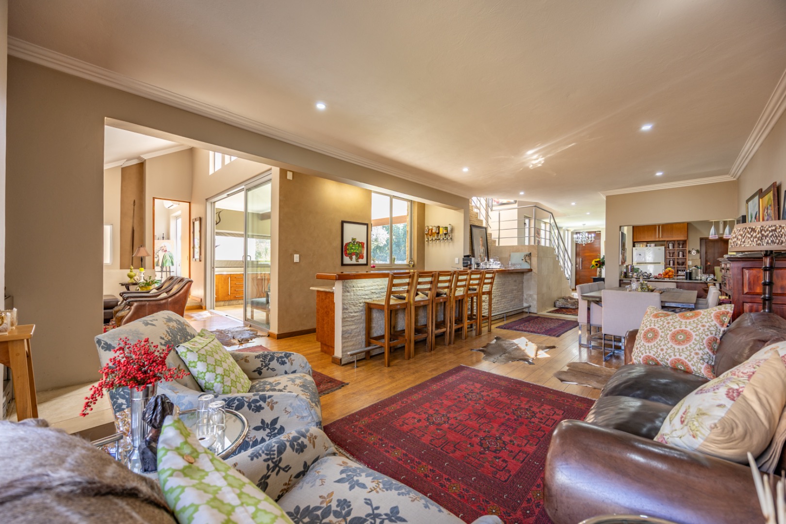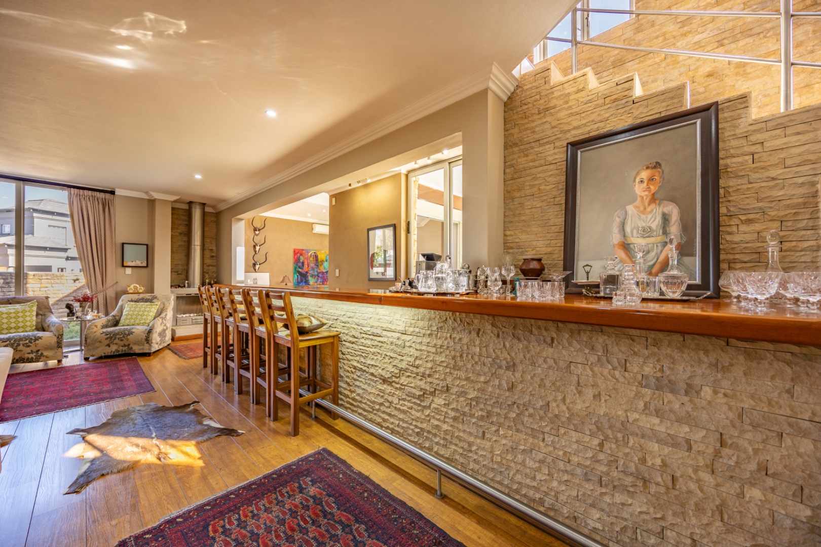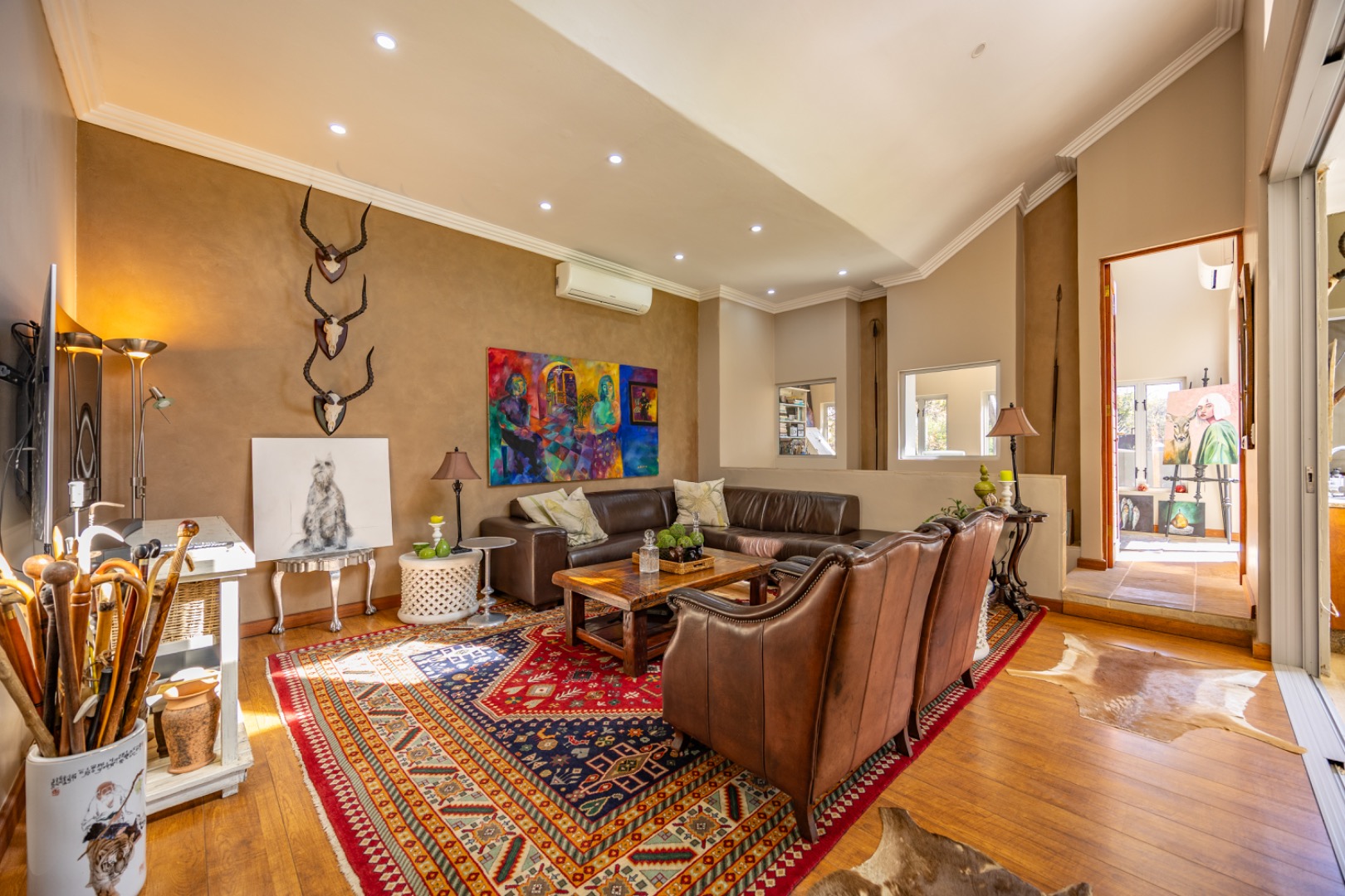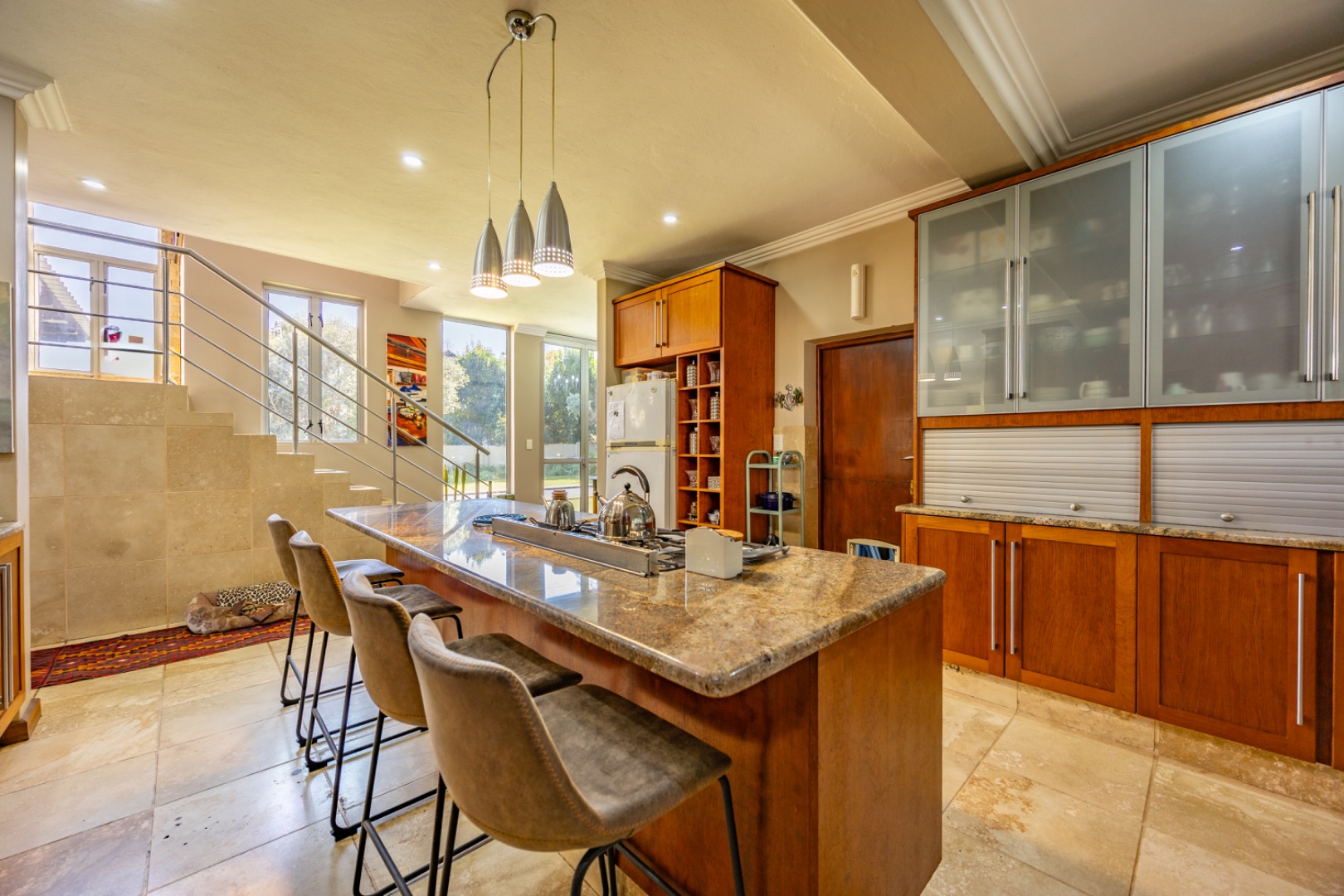 Located within a secure estate boasting four dams stocked with trout for catch-and-release fishing, this property also includes a domestic room with its own toilet and shower, two garden storage units, a wine cellar, and an additional office with a private entrance. Energy efficiency is maximized with a solar system comprising 12 panels, two inverters, and three batteries, and the home operates on a prepaid electricity system. The three garages include one with a drive-through feature for added convenience, and the landscaped garden is maintained with an automated irrigation system. All curtains and the bar fridge will remain with the property. This home represents a rare opportunity to enjoy estate living at its finest, blending thoughtful design with premium finishes and sustainable features in an idyllic setting.