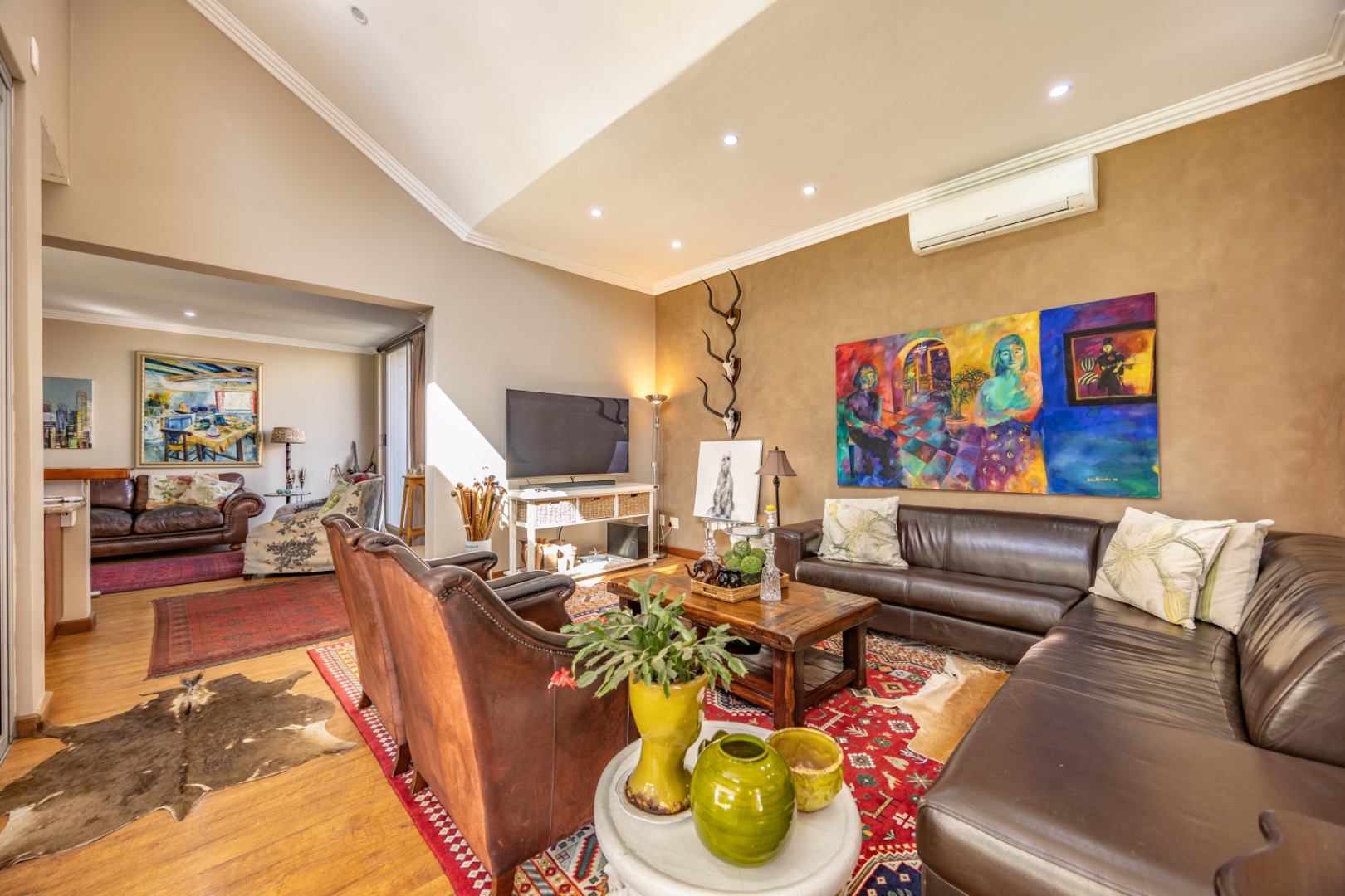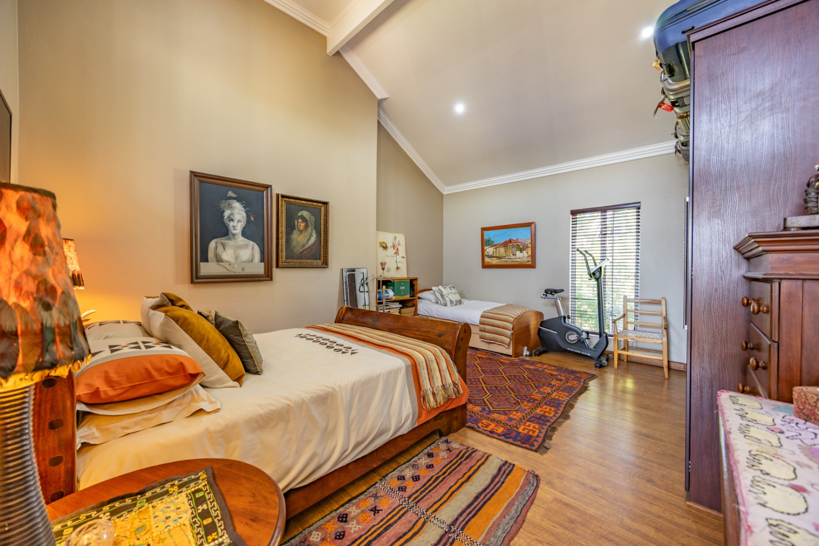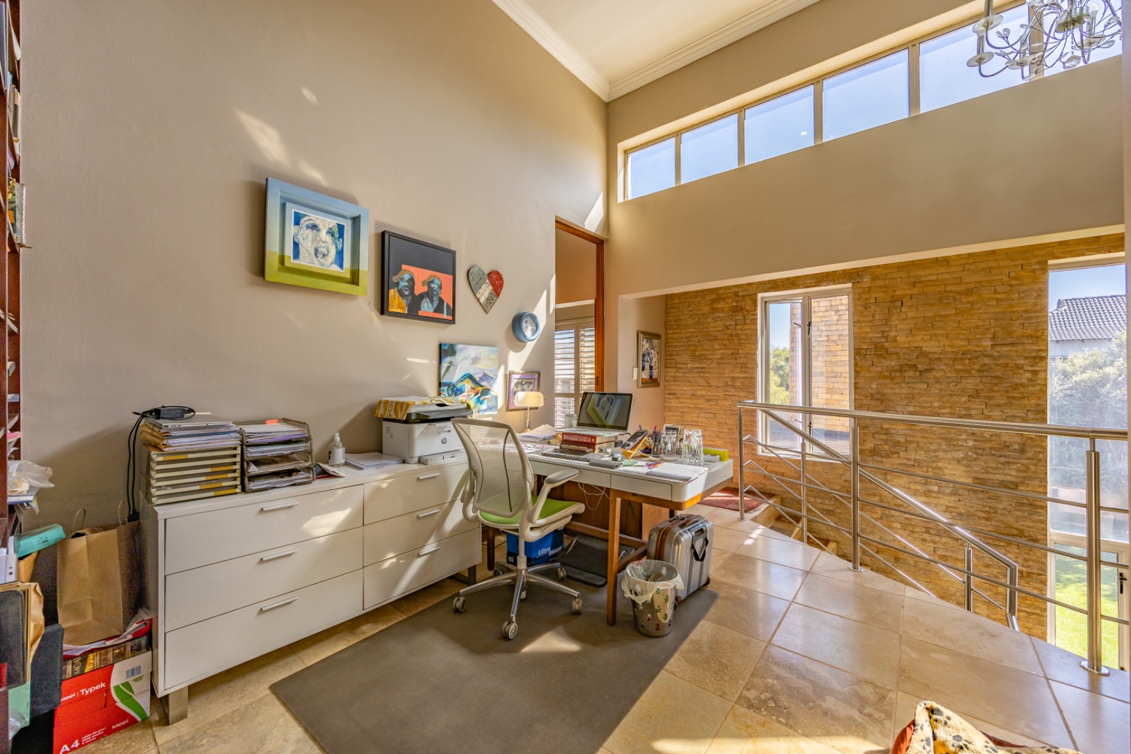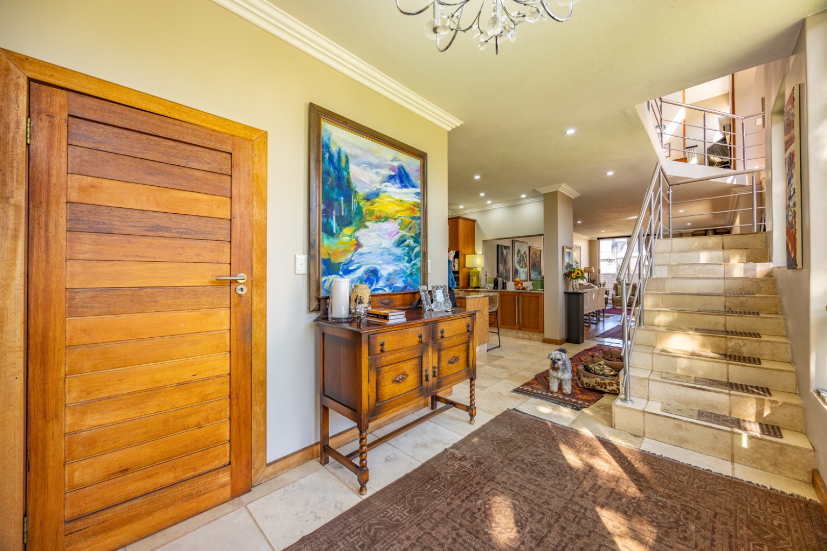Located within a secure estate boasting four dams stocked with trout for catch-and-release fishing, this property also includes a domestic room with its own toilet and shower, two garden storage units, a wine cellar, and an additional office with a private entrance. Energy efficiency is maximized with a solar system comprising 12 panels, two inverters, and three batteries, and the home operates on a prepaid electricity system. The three garages include one with a drive-through feature for added convenience, and the landscaped garden is maintained with an automated irrigation system. All curtains and the bar fridge will remain with the property. This home represents a rare opportunity to enjoy estate living at its finest, blending thoughtful design with premium finishes and sustainable features in an idyllic setting.