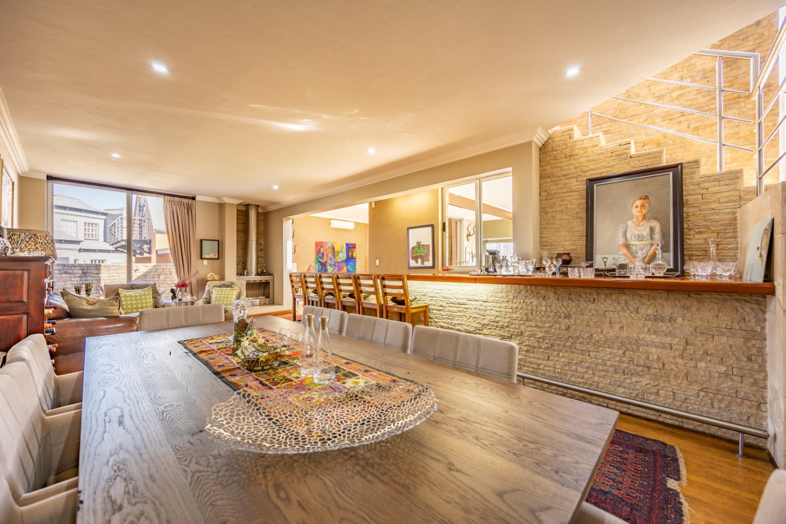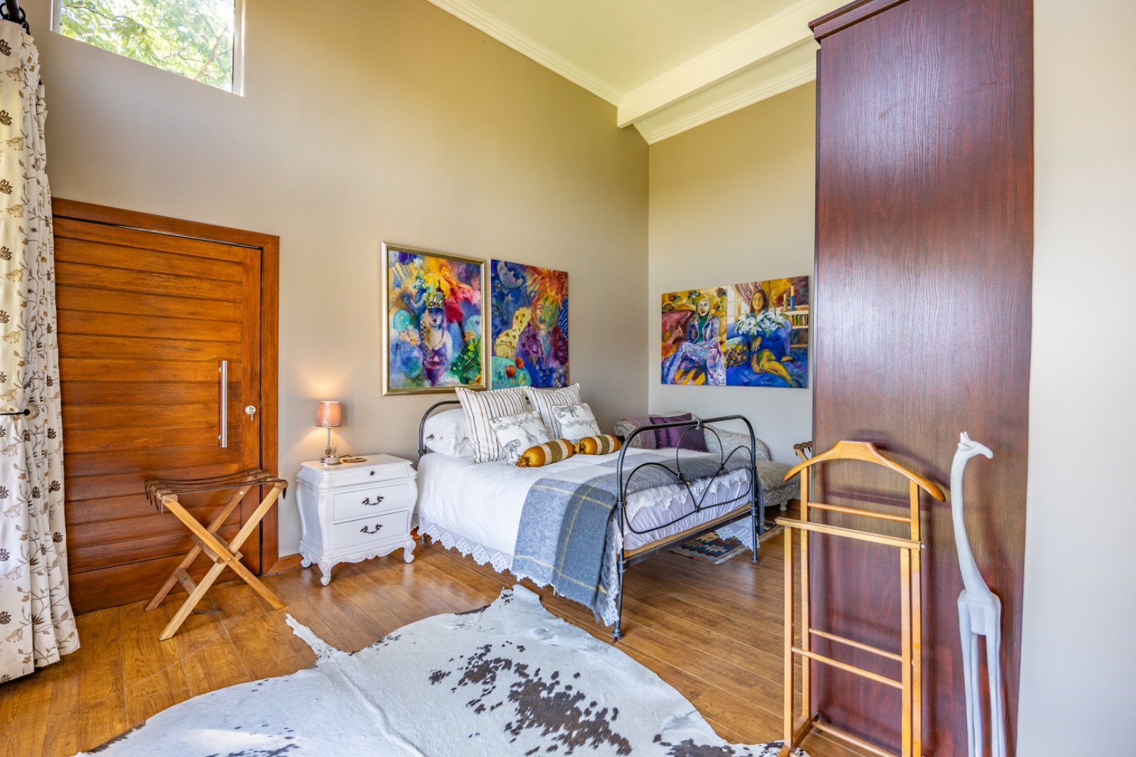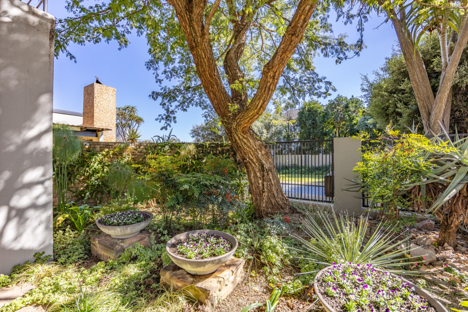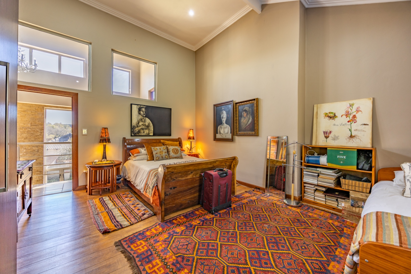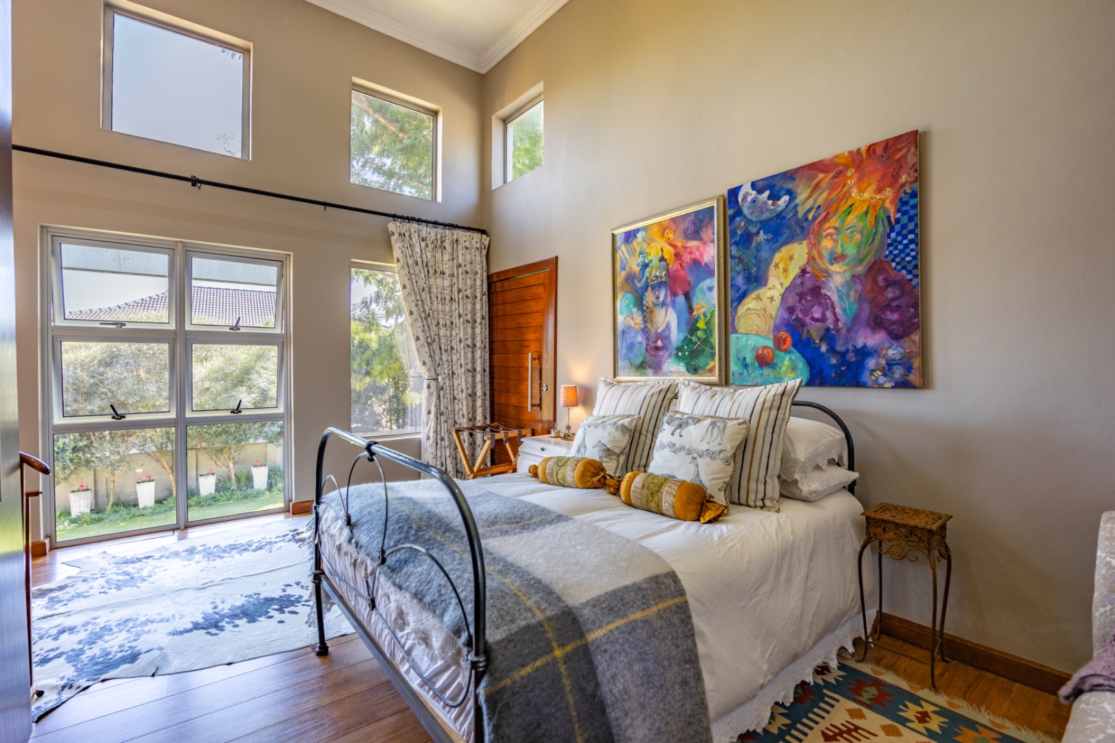 Located within a secure estate boasting four dams stocked with trout for catch-and-release fishing, this property also includes a domestic room with its own toilet and shower, two garden storage units, a wine cellar, and an additional office with a private entrance. Energy efficiency is maximized with a solar system comprising 12 panels, two inverters, and three batteries, and the home operates on a prepaid electricity system. The three garages include one with a drive-through feature for added convenience, and the landscaped garden is maintained with an automated irrigation system. All curtains and the bar fridge will remain with the property. This home represents a rare opportunity to enjoy estate living at its finest, blending thoughtful design with premium finishes and sustainable features in an idyllic setting.
