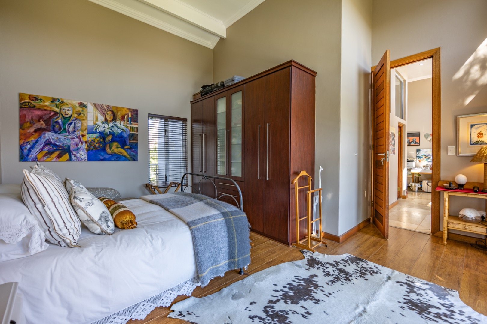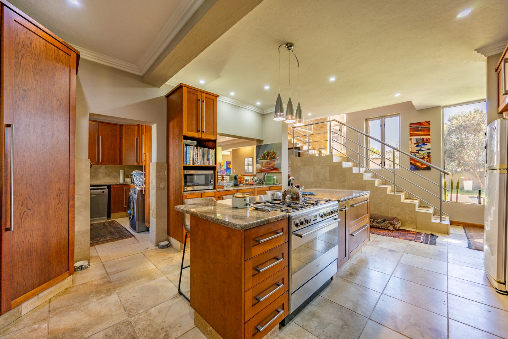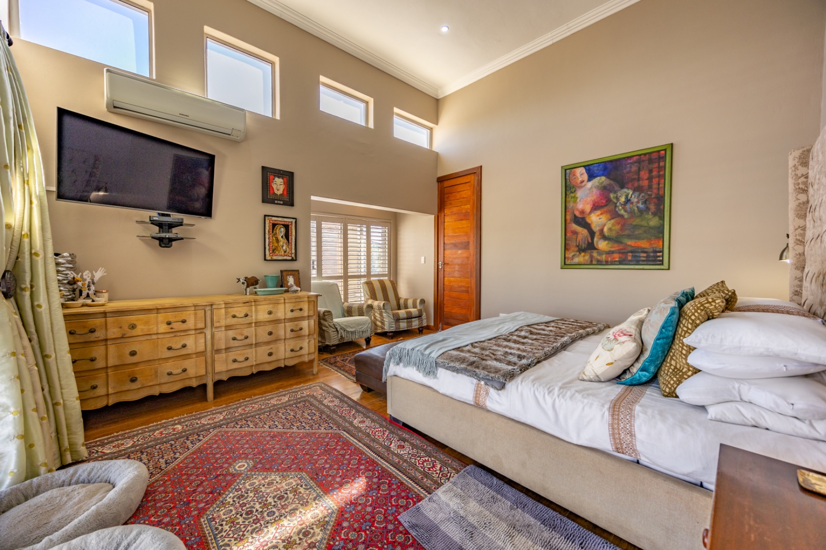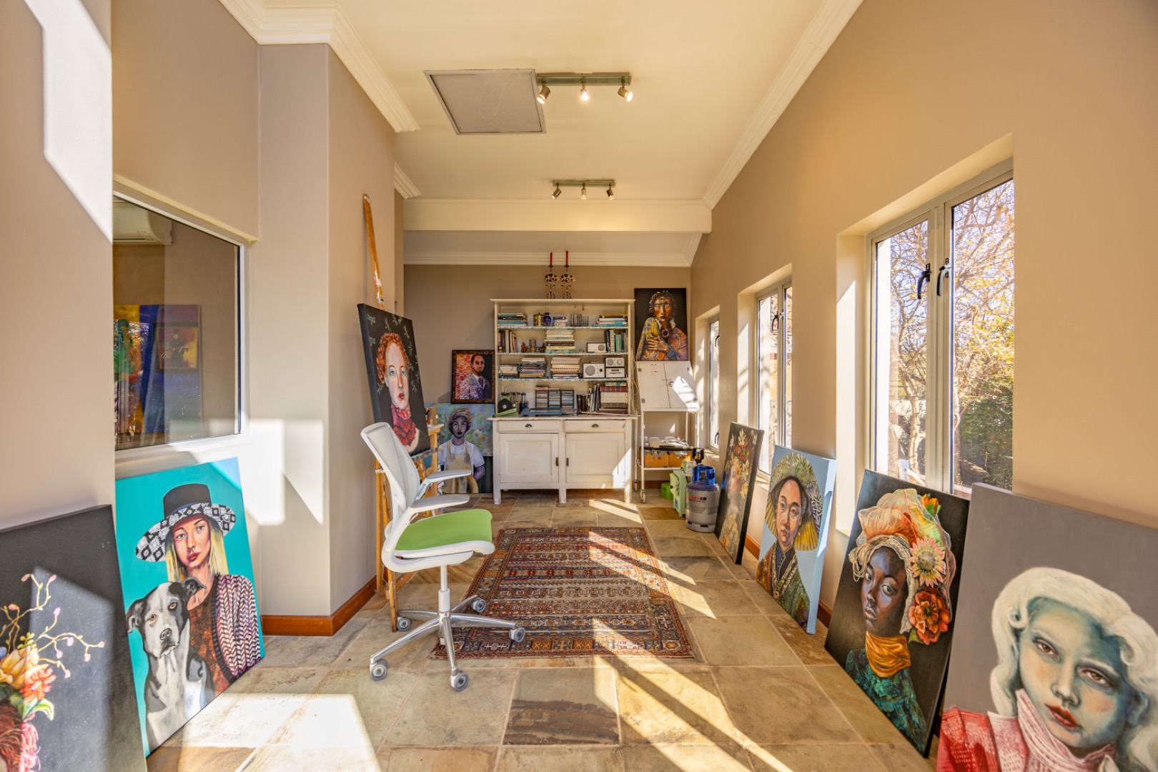Located within a secure estate boasting four dams stocked with trout for catch-and-release fishing, this property also includes a domestic room with its own toilet and shower, two garden storage units, a wine cellar, and an additional office with a private entrance. Energy efficiency is maximized with a solar system comprising 12 panels, two inverters, and three batteries, and the home operates on a prepaid electricity system. The three garages include one with a drive-through feature for added convenience, and the landscaped garden is maintained with an automated irrigation system. All curtains and the bar fridge will remain with the property. This home represents a rare opportunity to enjoy estate living at its finest, blending thoughtful design with premium finishes and sustainable features in an idyllic setting.