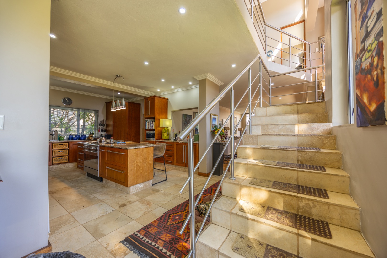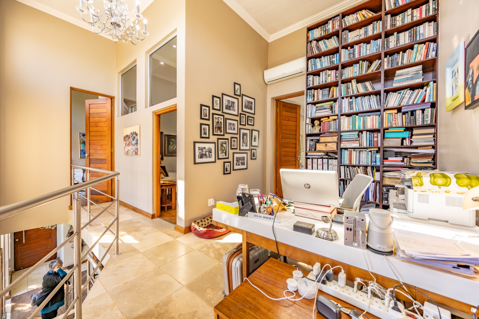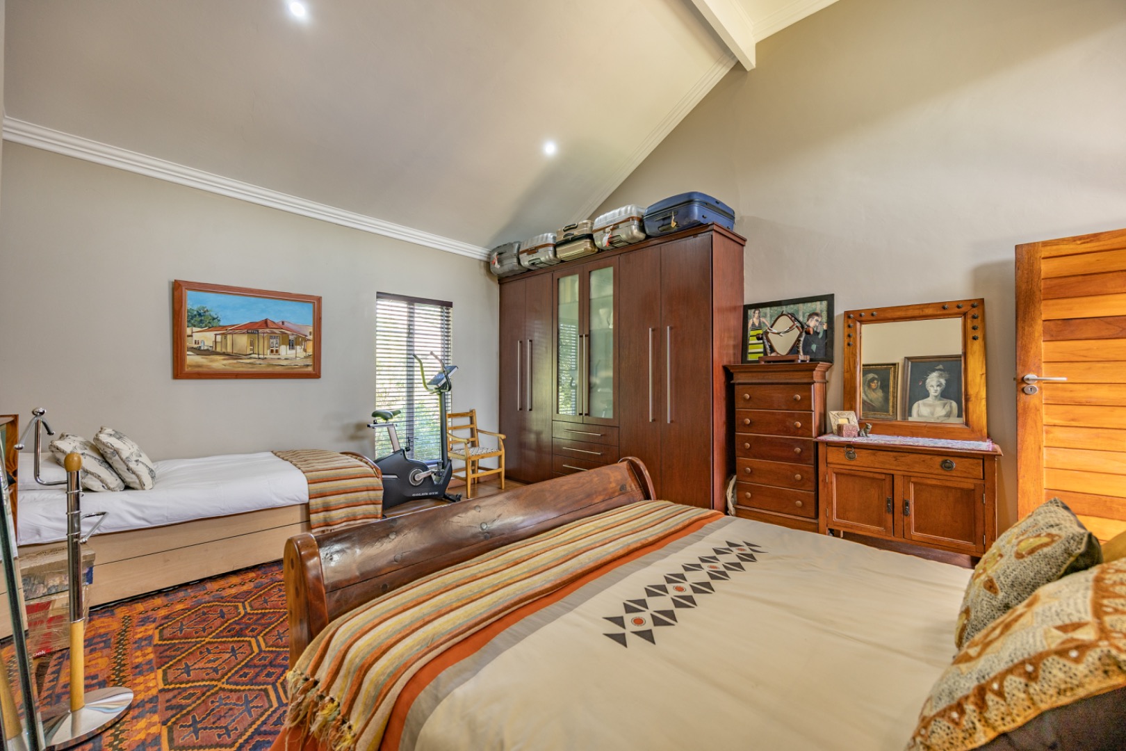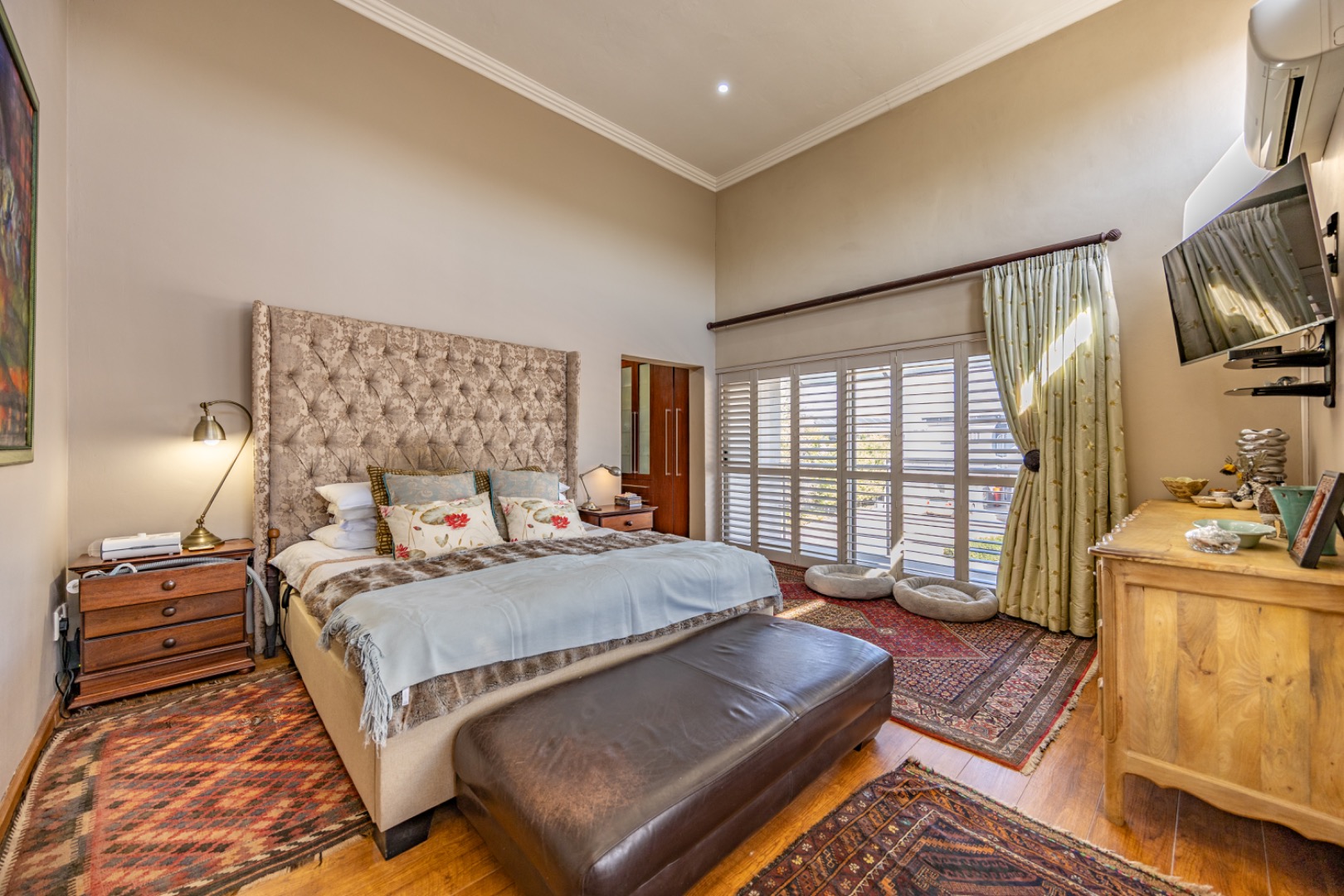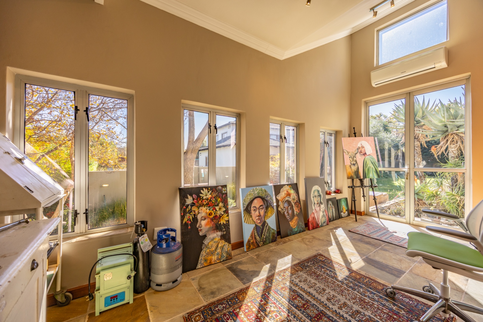 Located within a secure estate boasting four dams stocked with trout for catch-and-release fishing, this property also includes a domestic room with its own toilet and shower, two garden storage units, a wine cellar, and an additional office with a private entrance. Energy efficiency is maximized with a solar system comprising 12 panels, two inverters, and three batteries, and the home operates on a prepaid electricity system. The three garages include one with a drive-through feature for added convenience, and the landscaped garden is maintained with an automated irrigation system. All curtains and the bar fridge will remain with the property. This home represents a rare opportunity to enjoy estate living at its finest, blending thoughtful design with premium finishes and sustainable features in an idyllic setting.
