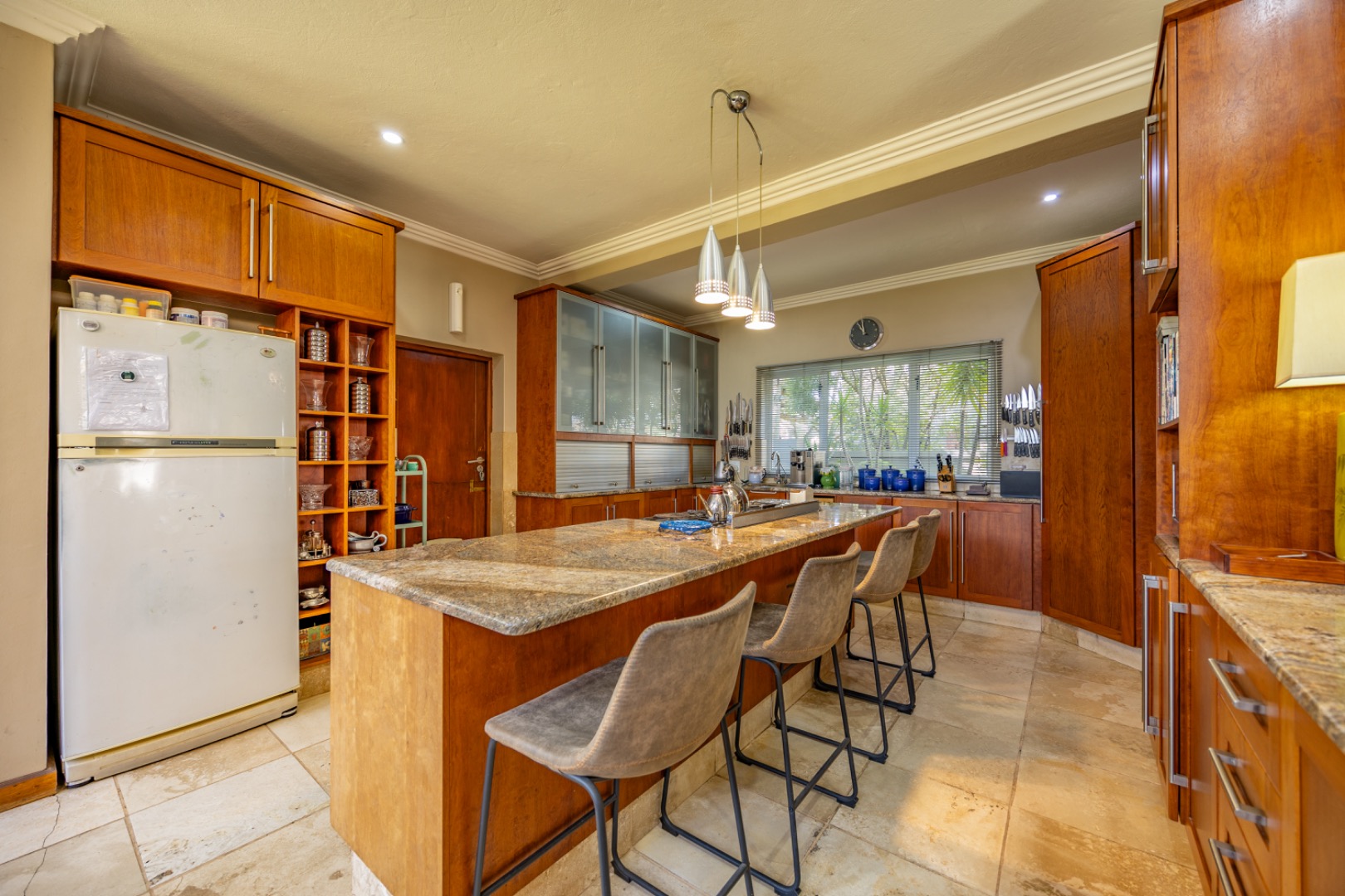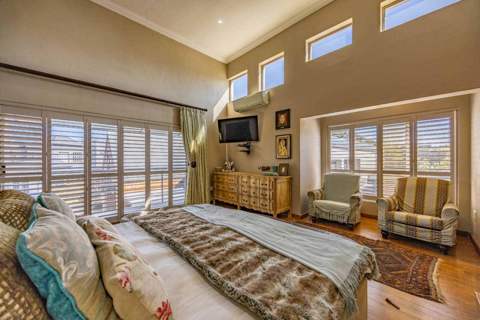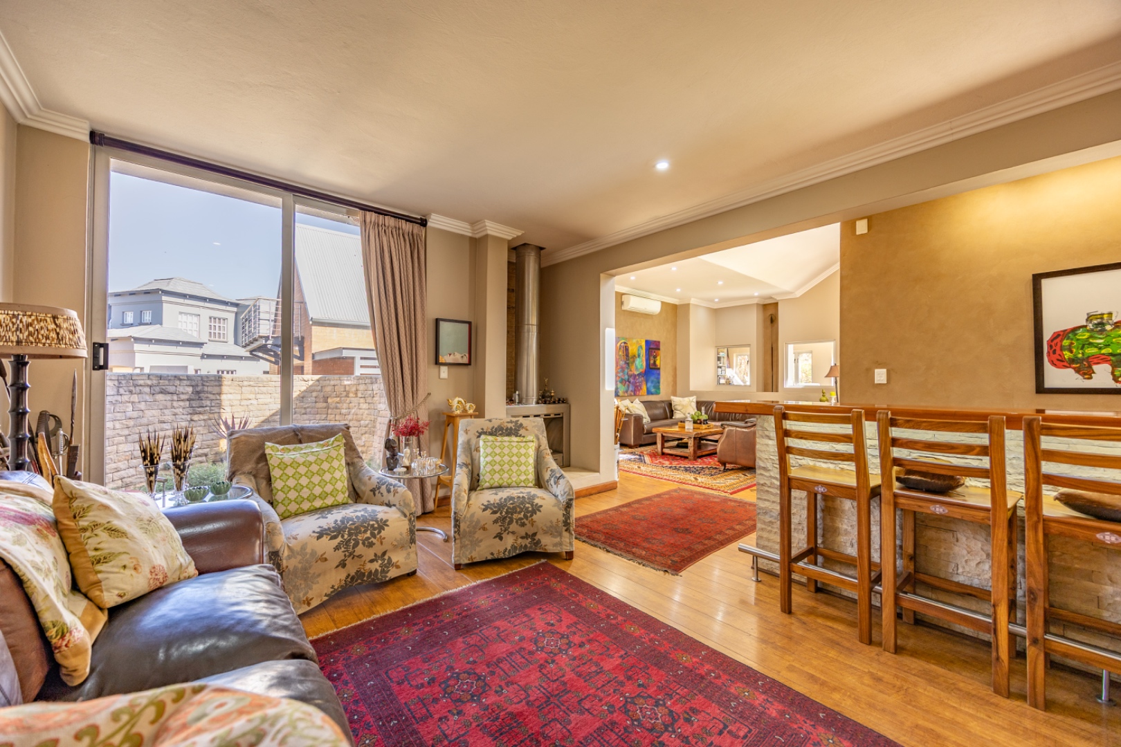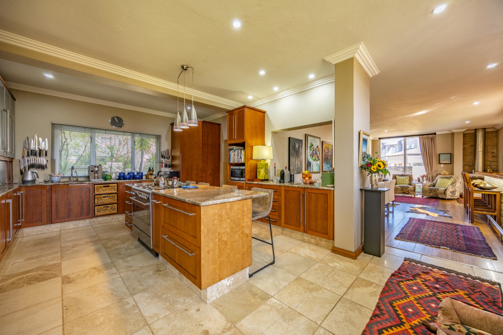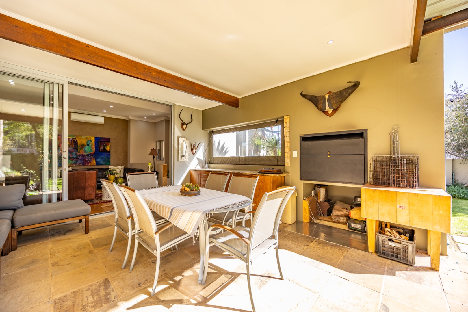 Located within a secure estate boasting four dams stocked with trout for catch-and-release fishing, this property also includes a domestic room with its own toilet and shower, two garden storage units, a wine cellar, and an additional office with a private entrance. Energy efficiency is maximized with a solar system comprising 12 panels, two inverters, and three batteries, and the home operates on a prepaid electricity system. The three garages include one with a drive-through feature for added convenience, and the landscaped garden is maintained with an automated irrigation system. All curtains and the bar fridge will remain with the property. This home represents a rare opportunity to enjoy estate living at its finest, blending thoughtful design with premium finishes and sustainable features in an idyllic setting.