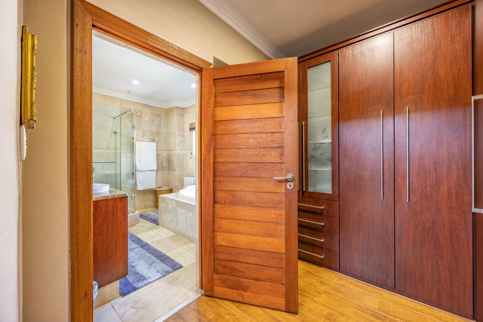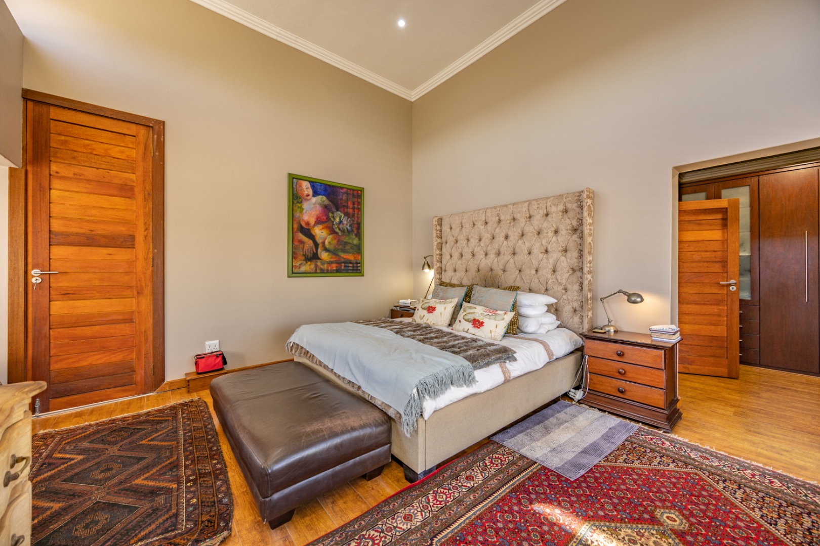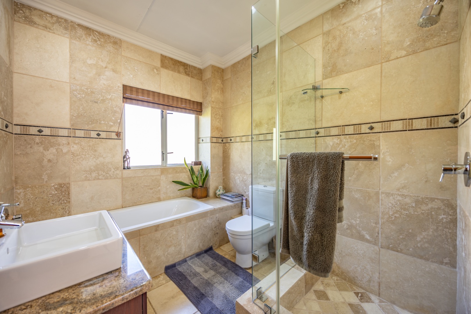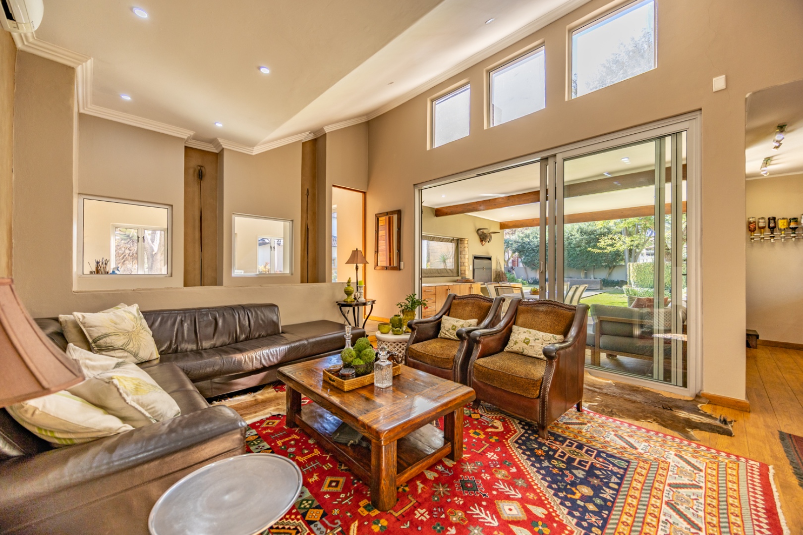 Located within a secure estate boasting four dams stocked with trout for catch-and-release fishing, this property also includes a domestic room with its own toilet and shower, two garden storage units, a wine cellar, and an additional office with a private entrance. Energy efficiency is maximized with a solar system comprising 12 panels, two inverters, and three batteries, and the home operates on a prepaid electricity system. The three garages include one with a drive-through feature for added convenience, and the landscaped garden is maintained with an automated irrigation system. All curtains and the bar fridge will remain with the property. This home represents a rare opportunity to enjoy estate living at its finest, blending thoughtful design with premium finishes and sustainable features in an idyllic setting.