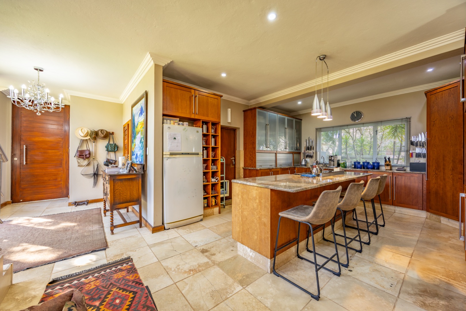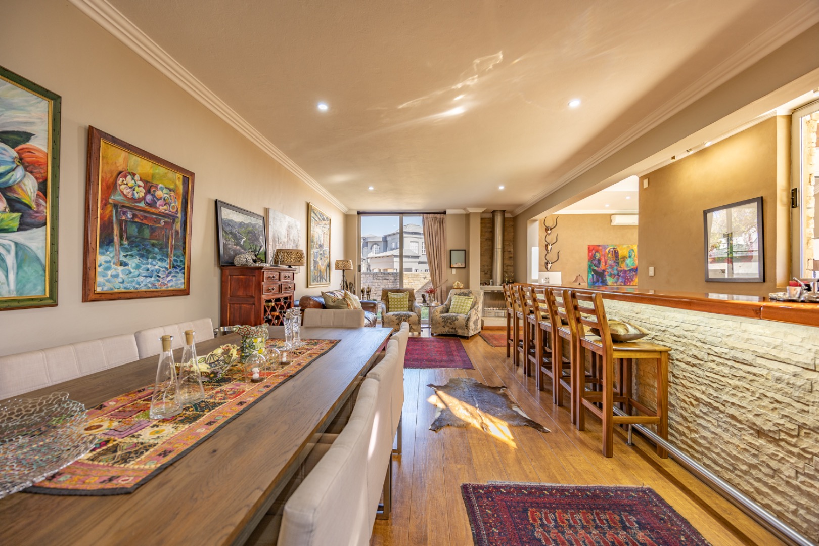 This beautifully designed home in Clearwater Flyfishing Estate offers an exceptional combination of quality finishes, functional spaces, and tranquil estate living. The front door opens to a welcoming foyer with a guest toilet conveniently positioned nearby. A right-side door provides easy access to the pool area, which is fitted with an electric cover to retain warmth and extend seasonal use. The heart of the home is a sophisticated rosewood kitchen complemented by granite countertops, a double fridge space, a Smeg gas hob with electric oven, a rinse bowl with integrated water purifier, and a spacious corner pantry. The scullery accommodates two appliances and offers ample cupboard space. The matching rosewood bar counter seamlessly connects to the dining area, creating a warm and elegant entertaining space. Laminated flooring runs throughout the dining and living areas, where a gas fireplace adds comfort and style. The built-in bar and adjacent TV room open via stackable doors to a large covered patio featuring a built-in braai, rinse bowl, and cupboard — ideal for hosting family and friends.
