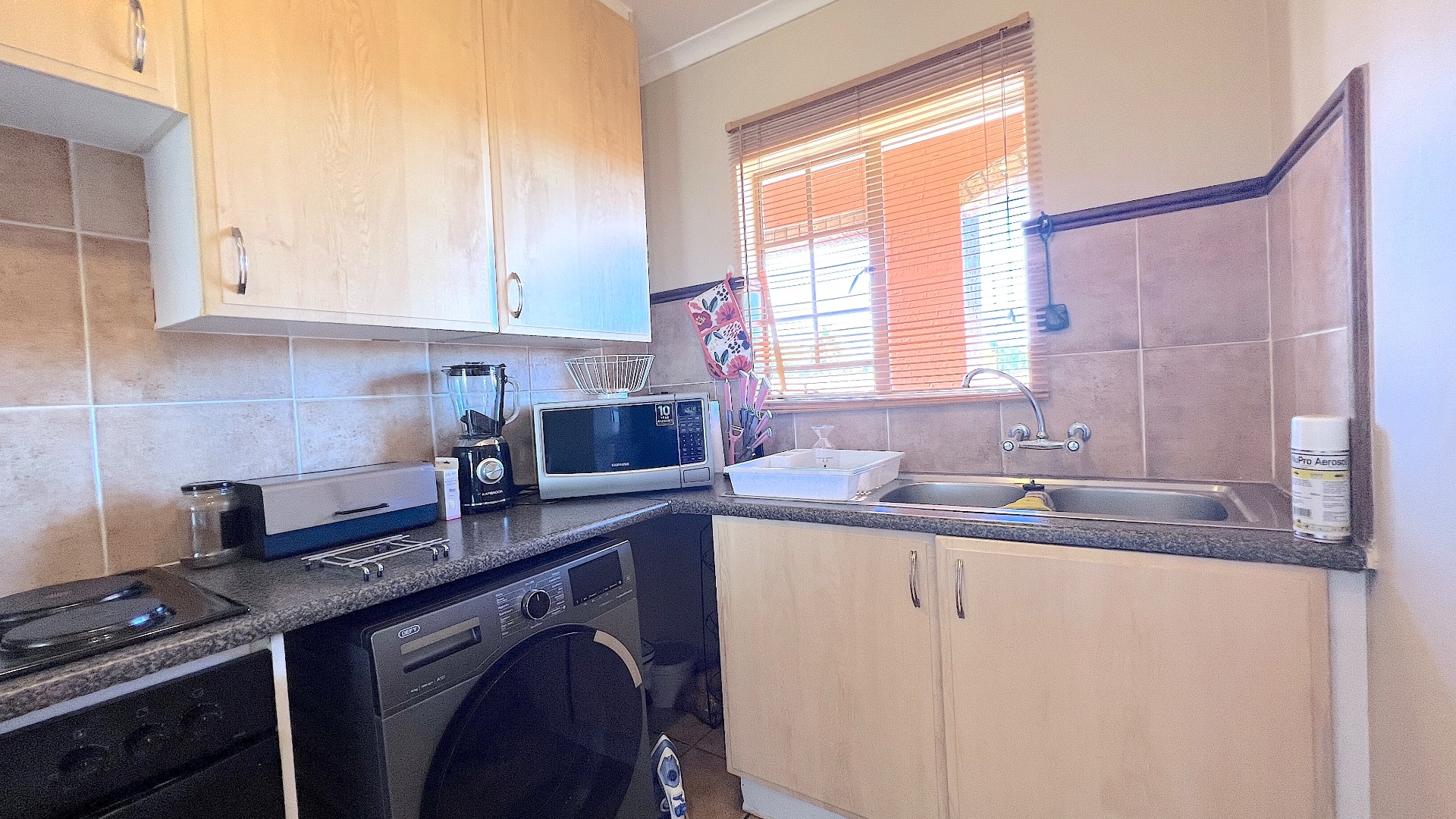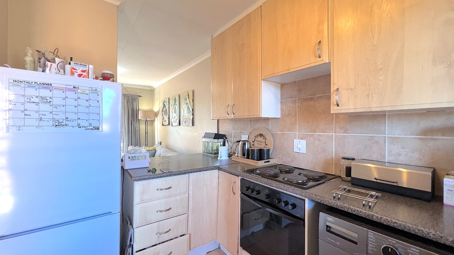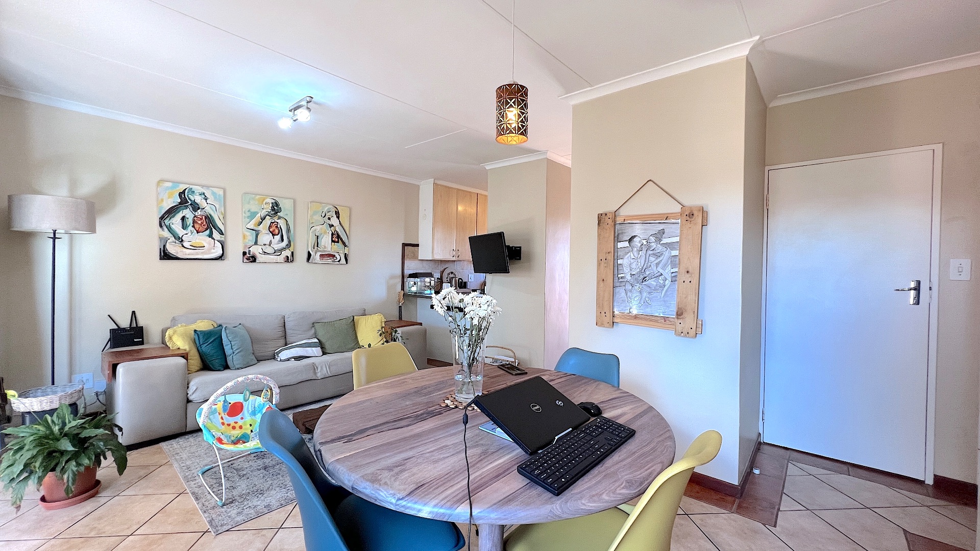 The property features two spacious bedrooms with built-in cupboards, offering ample storage space, and a neat, modern full bathroom. The open-plan lounge and dining area create a welcoming atmosphere and lead directly to a private balcony, perfect for relaxing or entertaining guests. The kitchen is both functional and well-finished, providing generous cupboard and counter space for practical everyday living. For parking convenience, the home includes a single lock-up garage along with additional guest parking within the estate.
