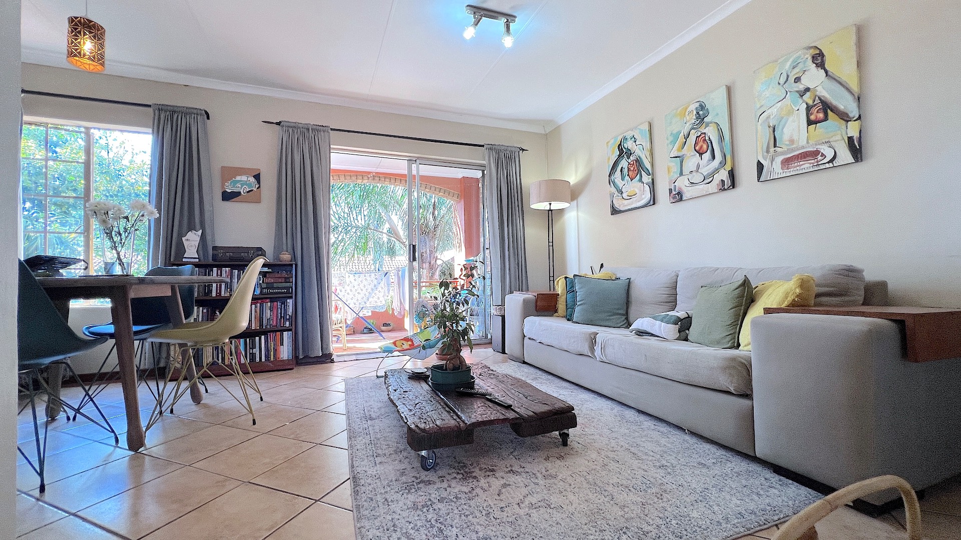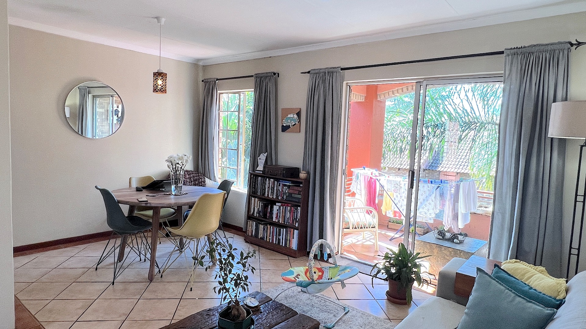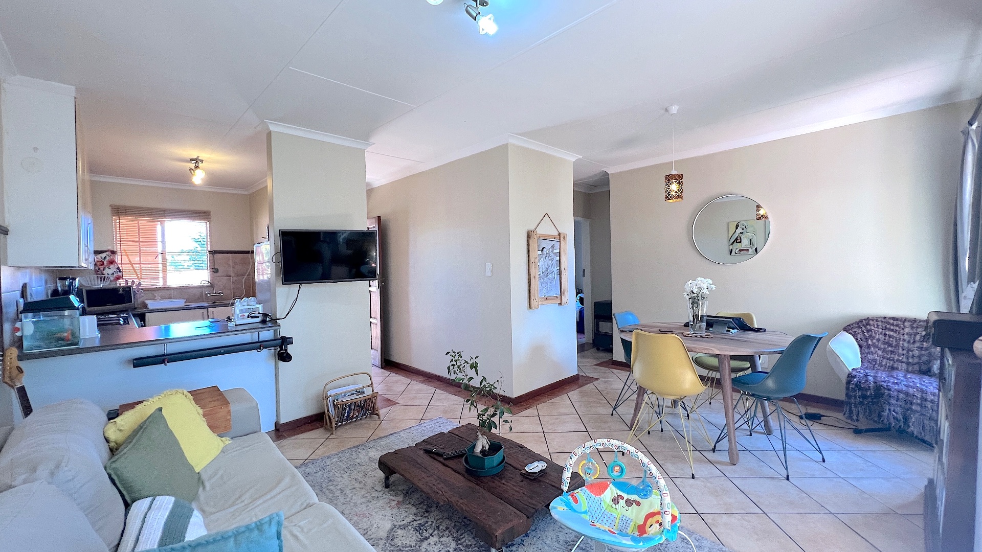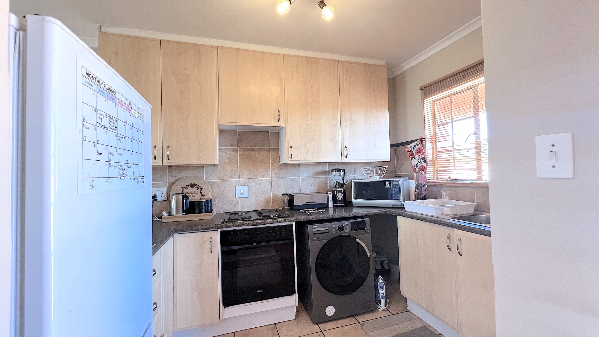 The property features two spacious bedrooms with built-in cupboards, offering ample storage space, and a neat, modern full bathroom. The open-plan lounge and dining area create a welcoming atmosphere and lead directly to a private balcony, perfect for relaxing or entertaining guests. The kitchen is both functional and well-finished, providing generous cupboard and counter space for practical everyday living. For parking convenience, the home includes a single lock-up garage along with additional guest parking within the estate.