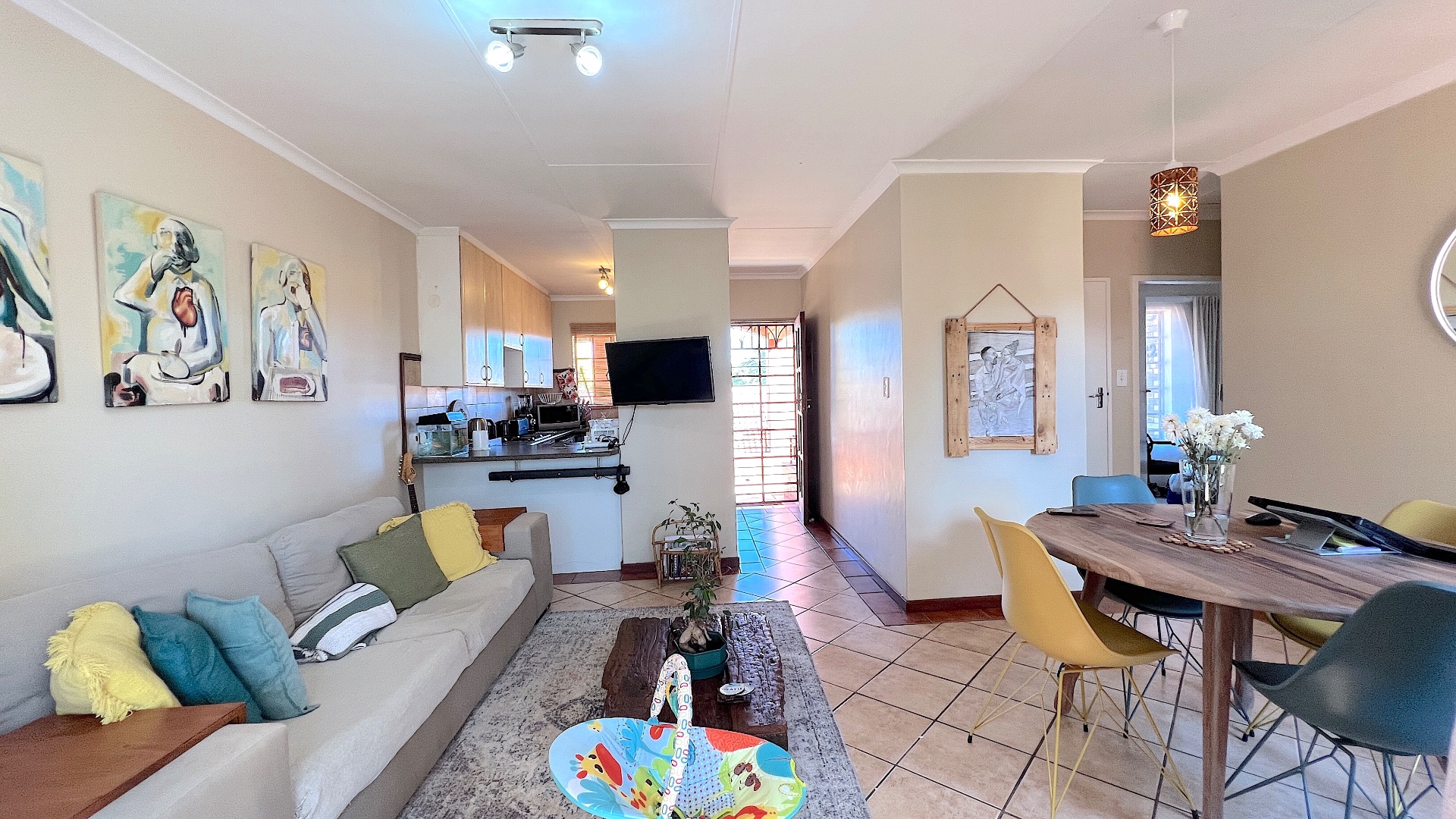 The property features two spacious bedrooms with built-in cupboards, offering ample storage space, and a neat, modern full bathroom. The open-plan lounge and dining area create a welcoming atmosphere and lead directly to a private balcony, perfect for relaxing or entertaining guests. The kitchen is both functional and well-finished, providing generous cupboard and counter space for practical everyday living. For parking convenience, the home includes a single lock-up garage along with additional guest parking within the estate.