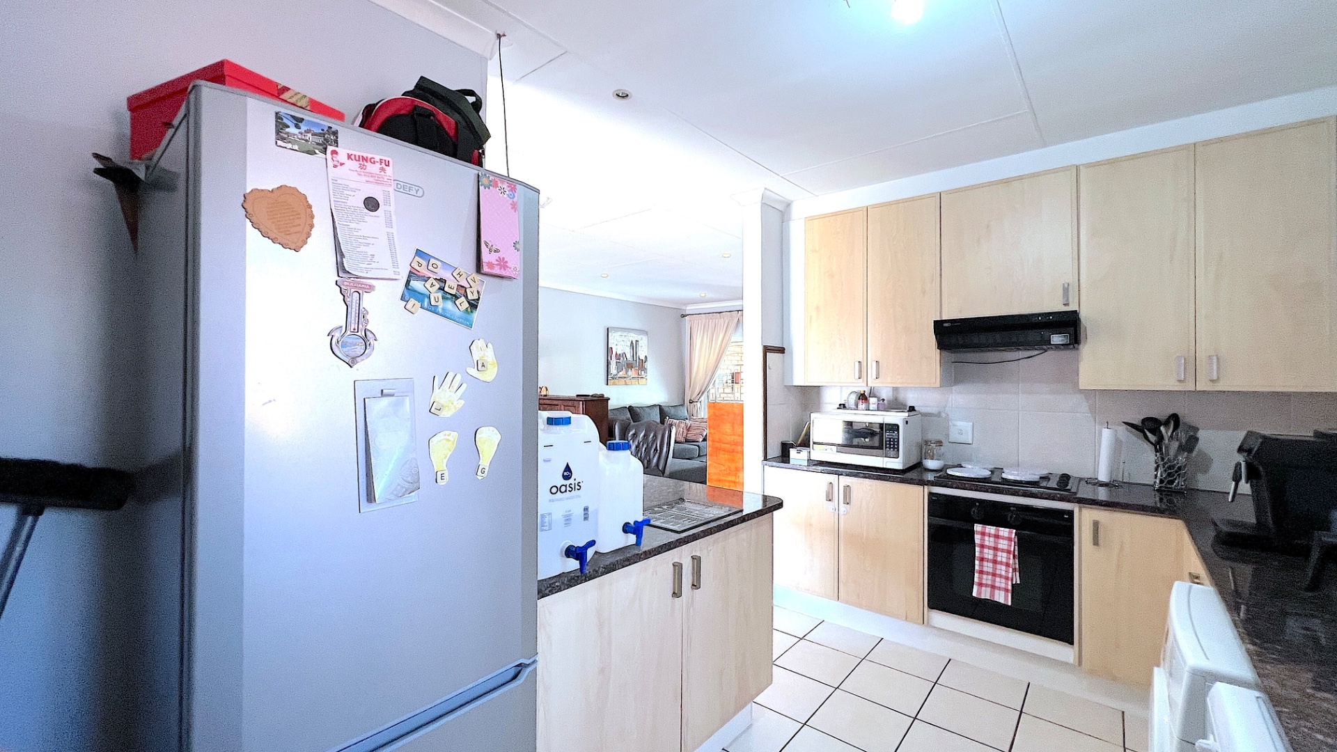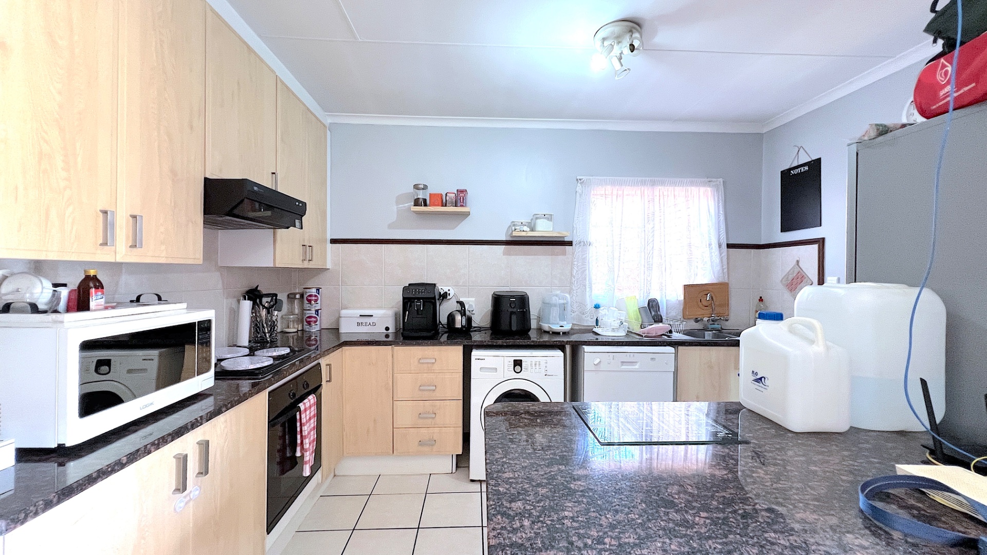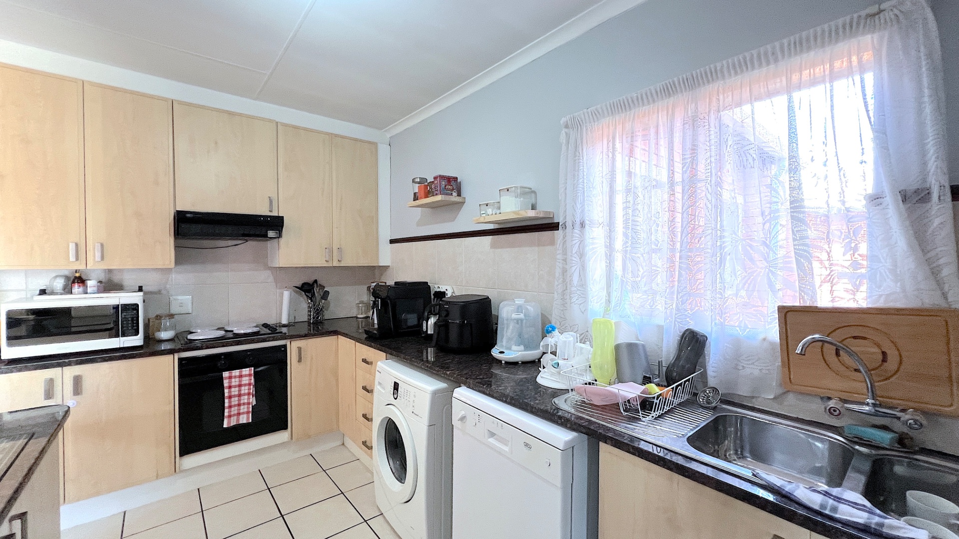 The semi-open plan kitchen is thoughtfully designed with both style and practicality in mind. It features abundant cupboard space, sleek granite countertops, a charming breakfast nook, and quality appliances including a built-in stove, oven, and extractor fan—ensuring that mealtime is both effortless and enjoyable.