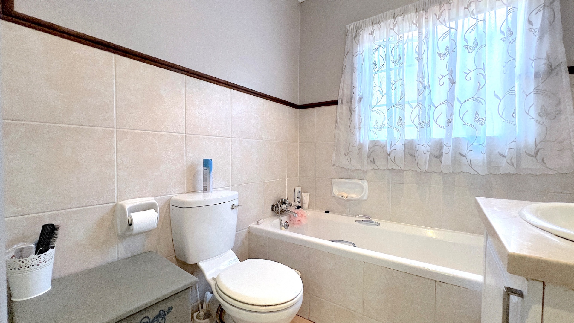 The heart of the home is the sunlit open-plan lounge, a welcoming space that flows seamlessly onto a covered patio. Overlooking a beautifully landscaped garden framed by mature trees, this area is perfect for relaxed evenings, weekend braais, or quiet moments of reflection outdoors.