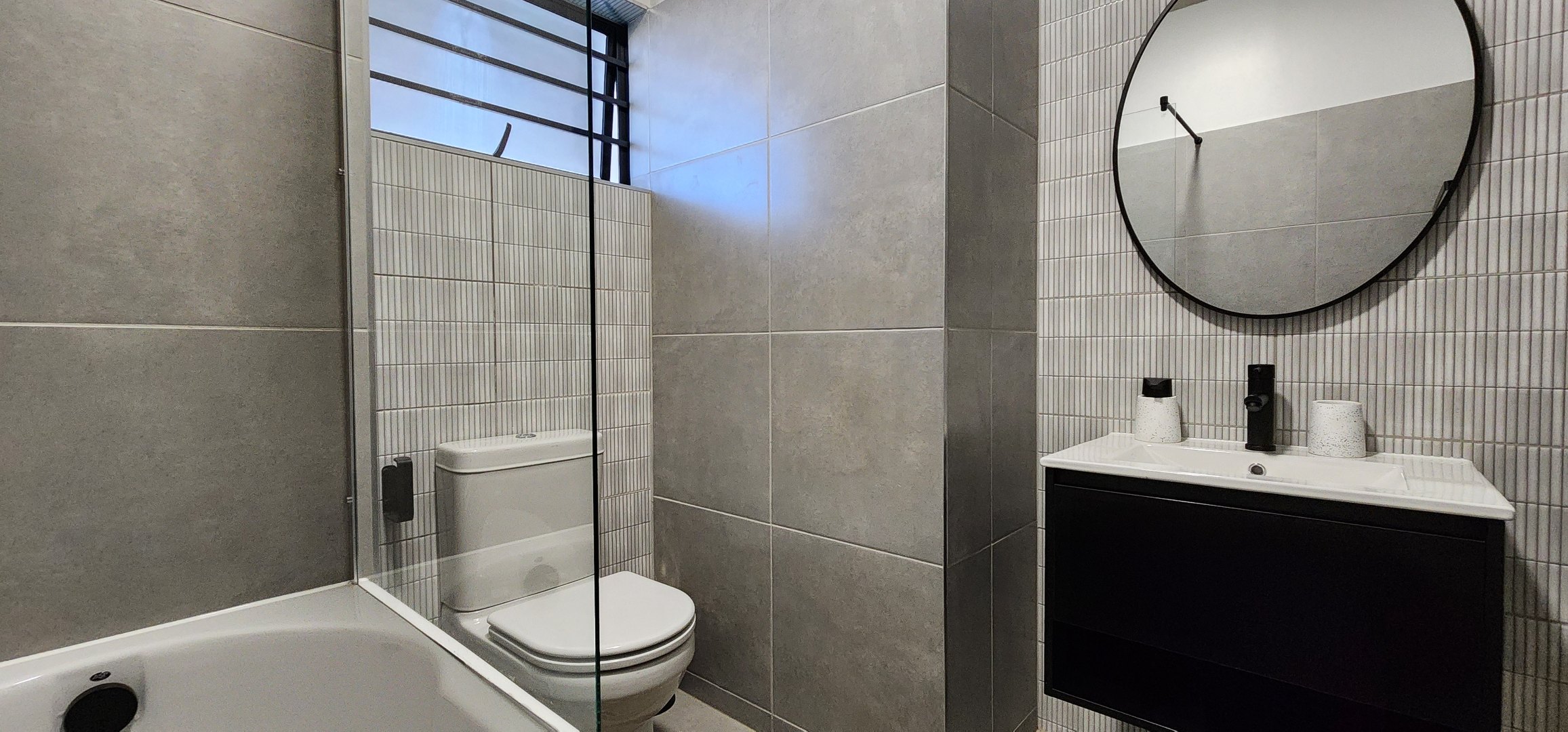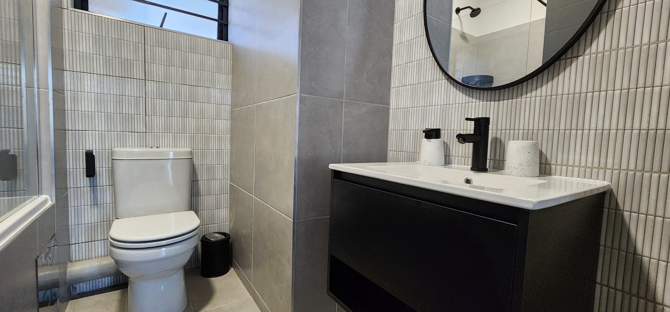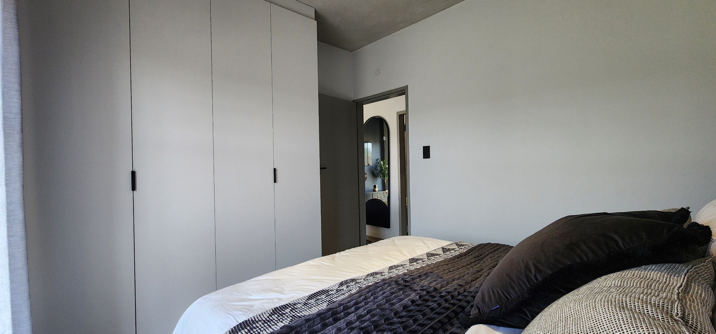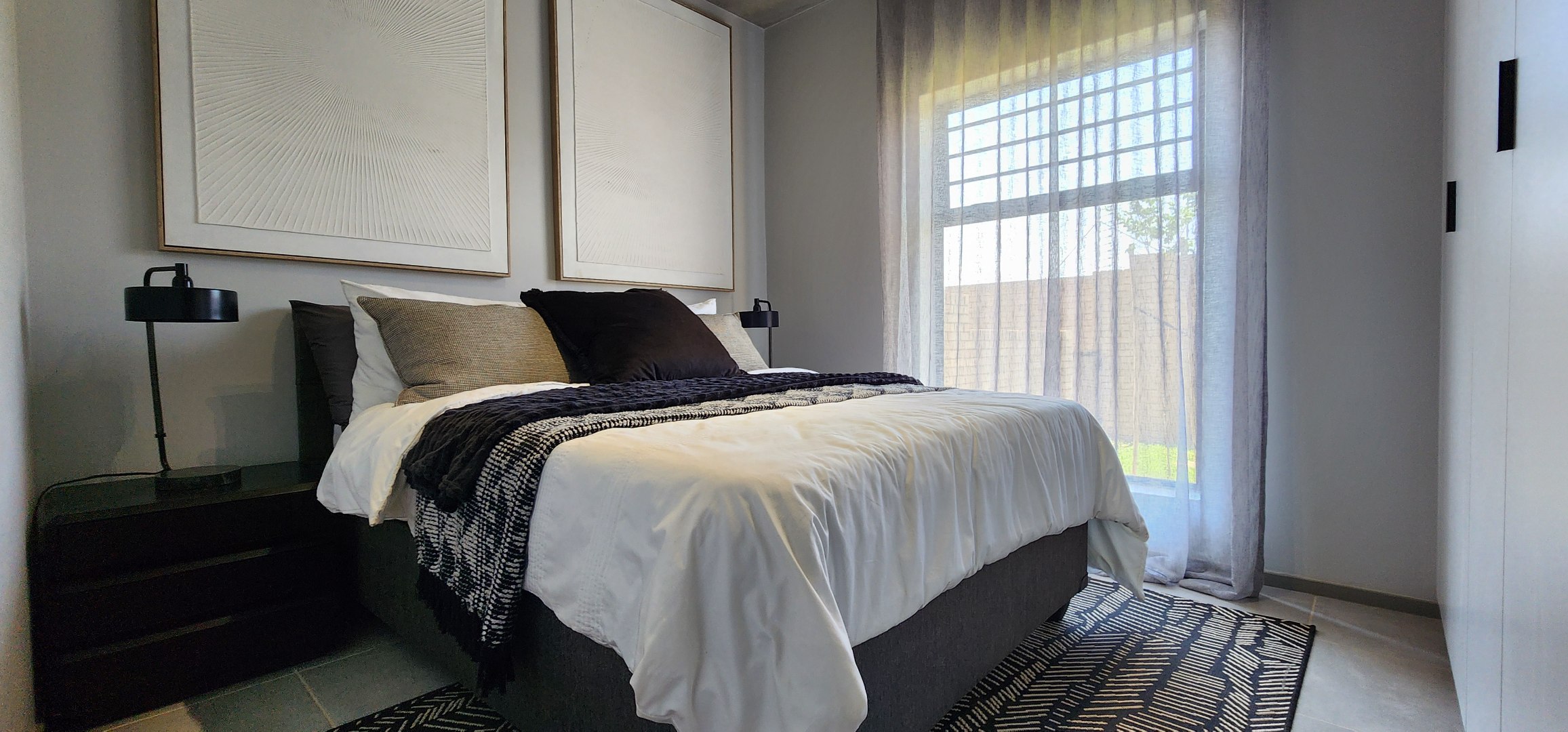 The bathroom is fitted with a basin, toilet, and a bath-shower combo enclosed with a glass screen, adding to the clean and modern aesthetic. Both bedrooms are equipped with built-in cupboards, large windows, and curtain rails, providing both practicality and privacy. This unit includes two dedicated, secure parking bays, with ample visitor parking available within the estate.