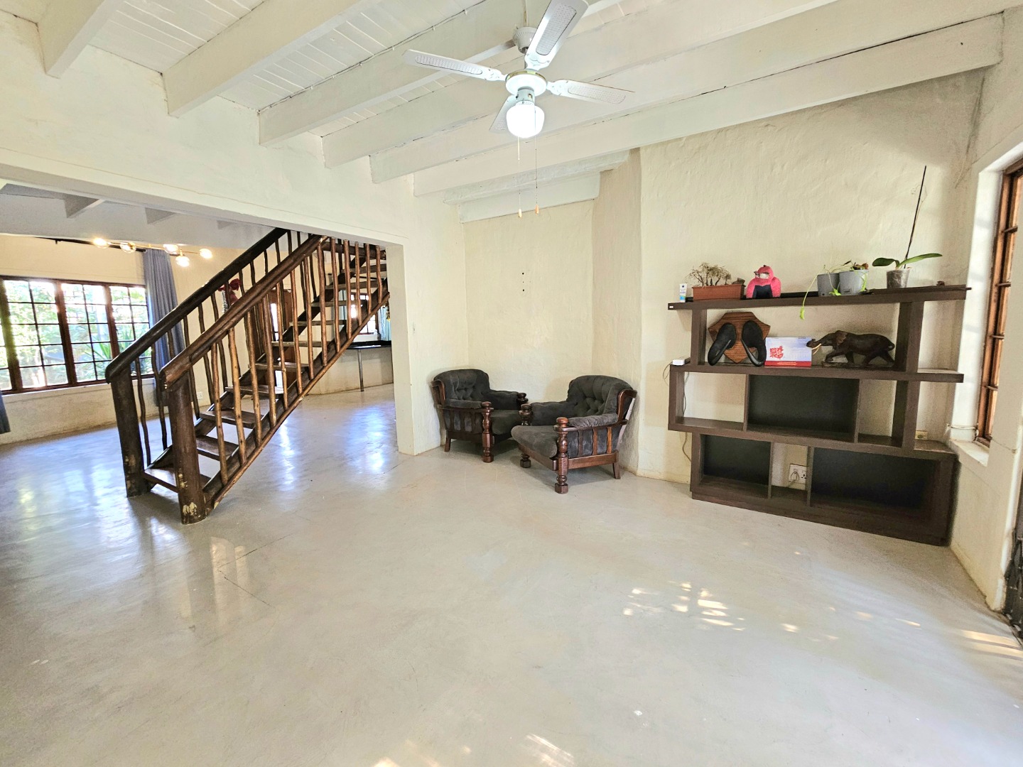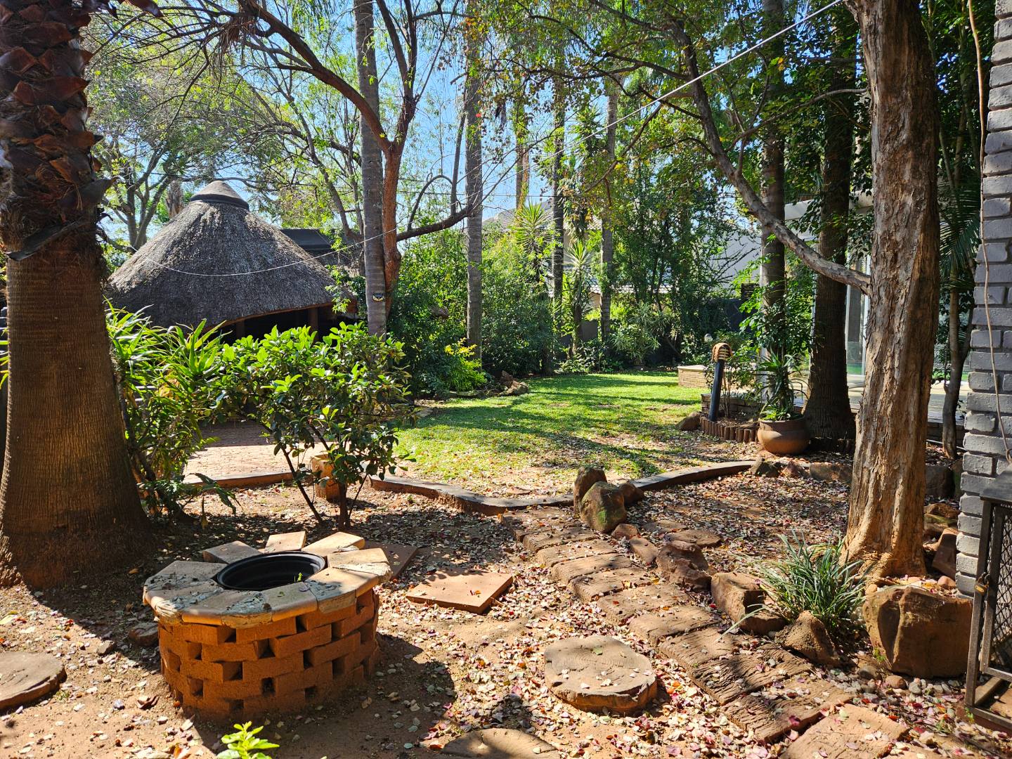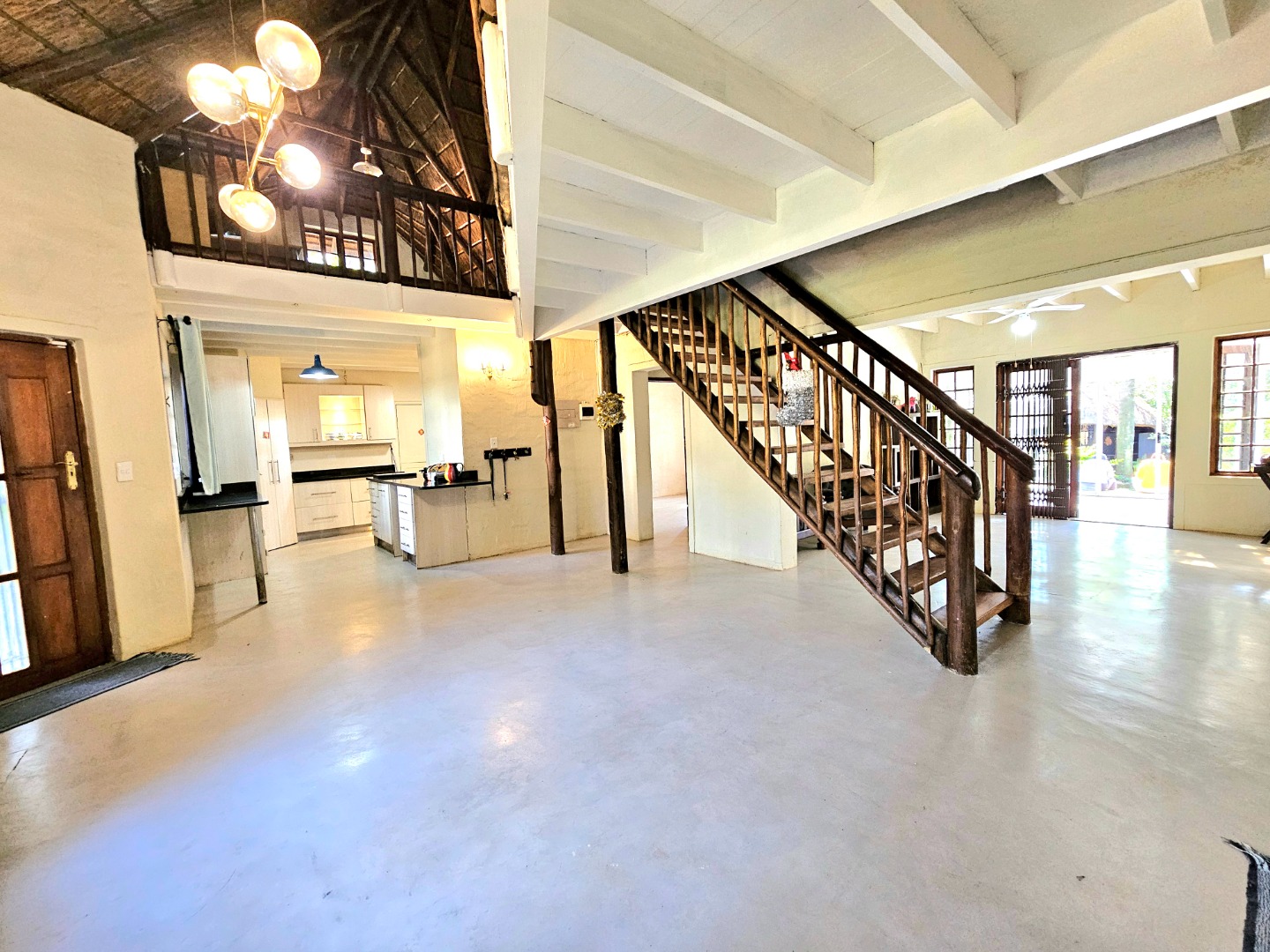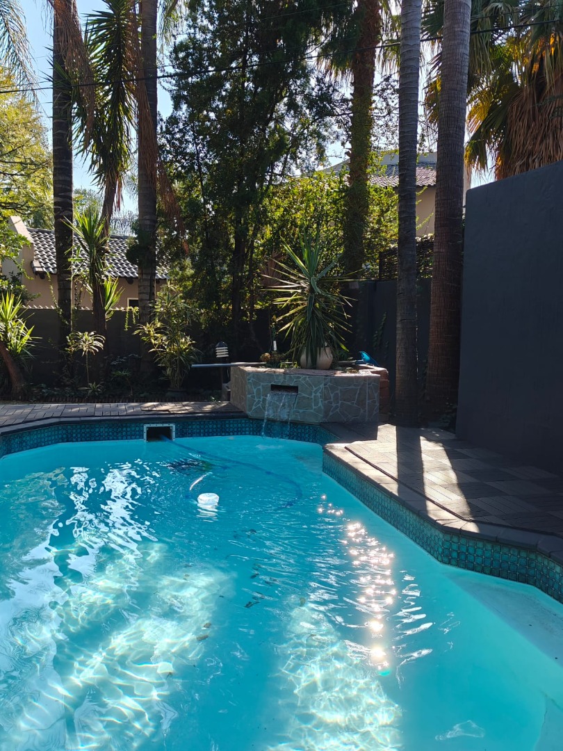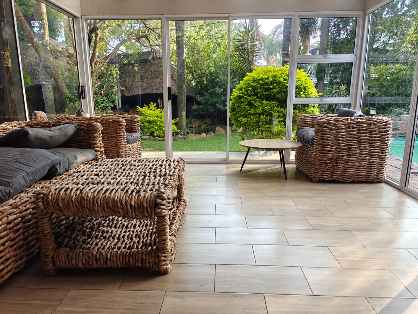 The lounge extends to an enclosed glass patio, sun room, providing a serene space to unwind while overlooking the lush garden, sparkling swimming pool, and expansive Lapa. The Lapa is an entertainer's delight, boasting a built-in bar that's perfect for hosting gatherings with family and friends.