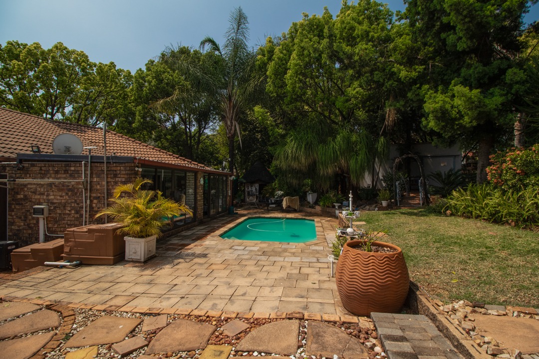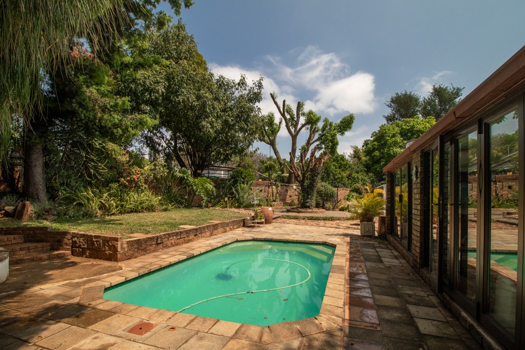 Step outside to a beautifully landscaped garden featuring a sparkling pool, covered veranda, and a lapa, offering the perfect setting for relaxed outdoor living.