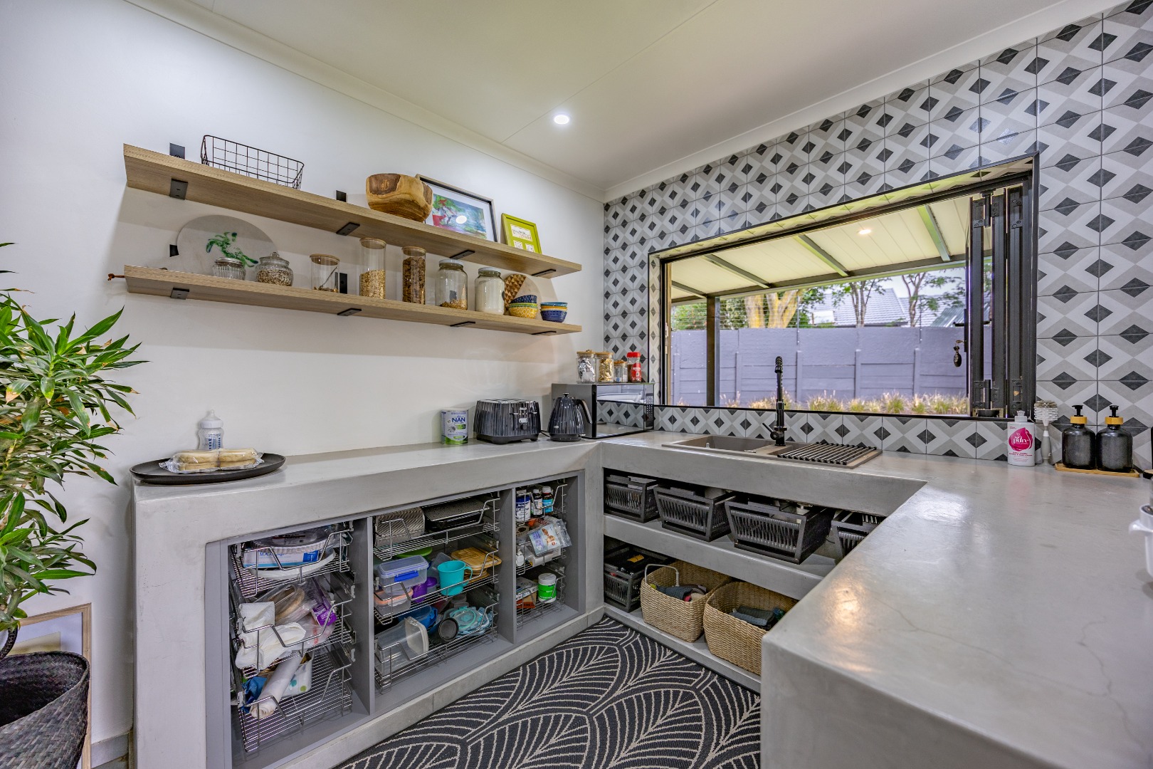 The modern kitchen is sleek and functional, complemented by a separate washing area for added convenience. The home’s open-plan living and dining areas flow effortlessly onto a spacious outdoor patio, perfect for entertaining.