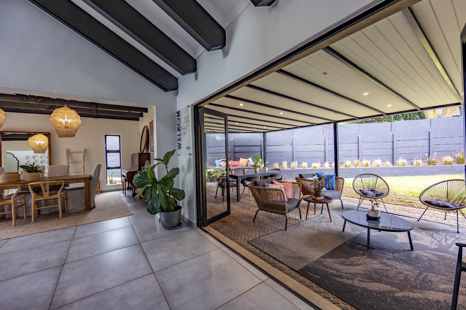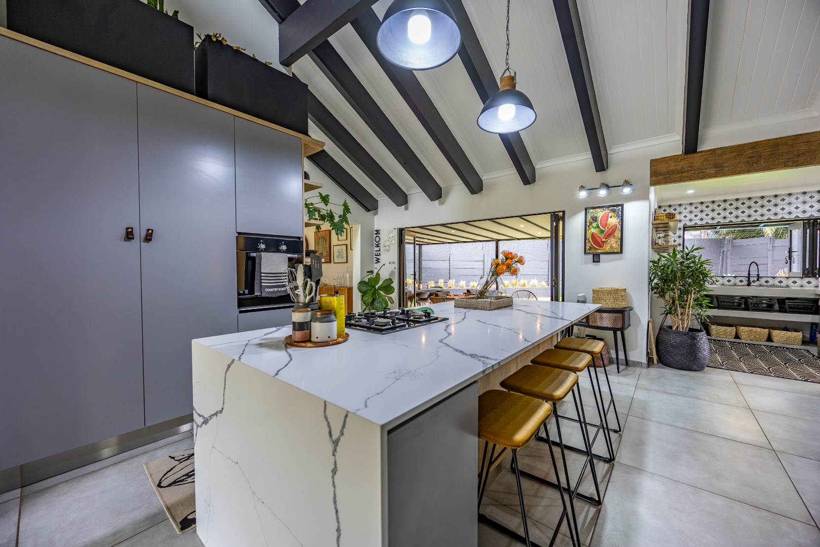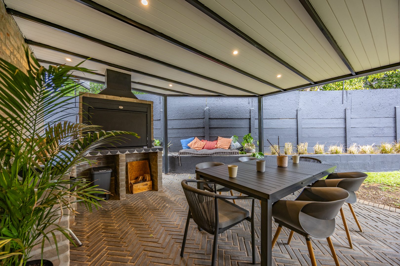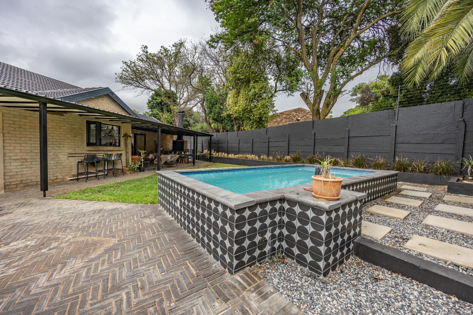 Step outside to enjoy the braai area overlooking a sparkling blue swimming pool, creating an inviting space for relaxation and gatherings.