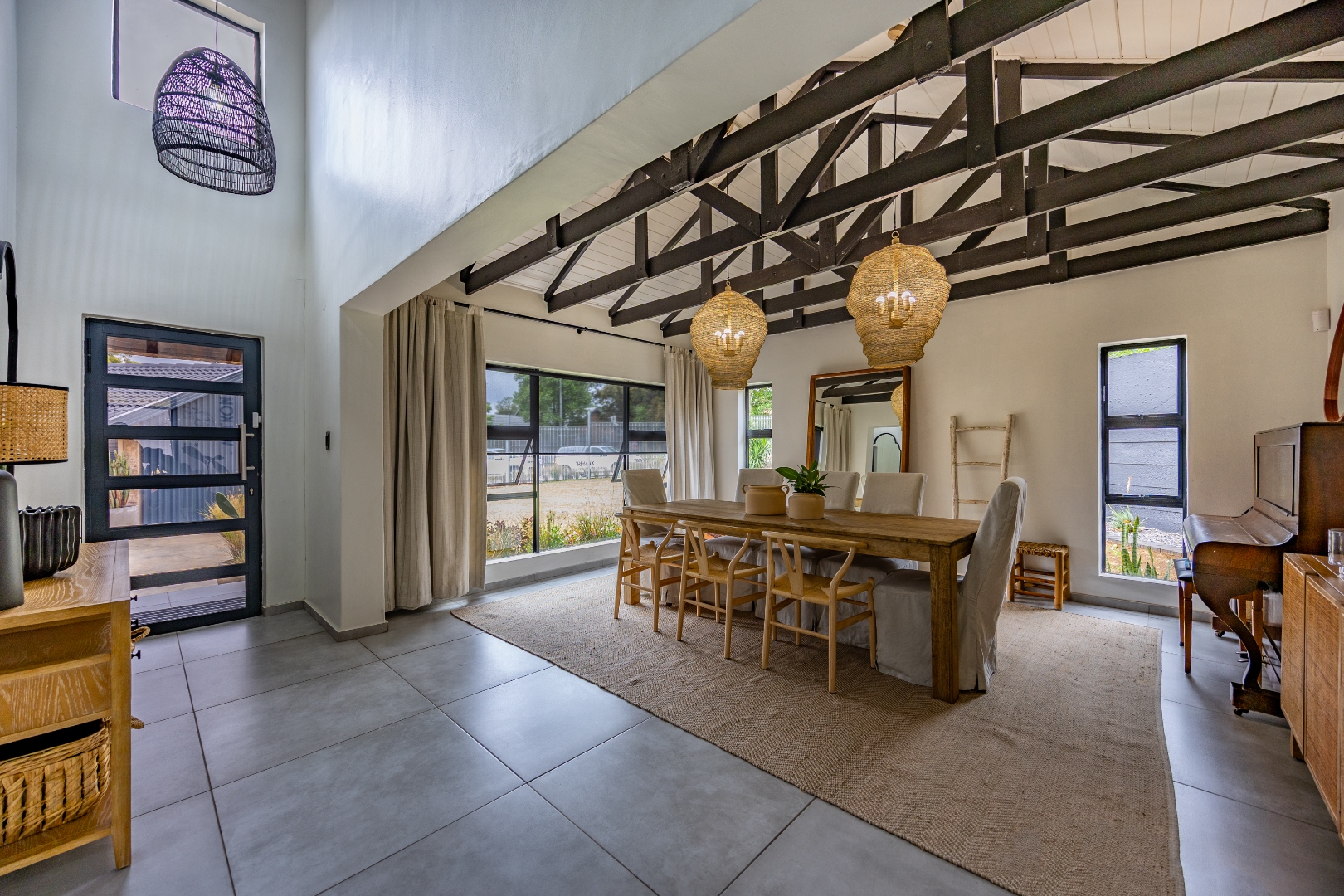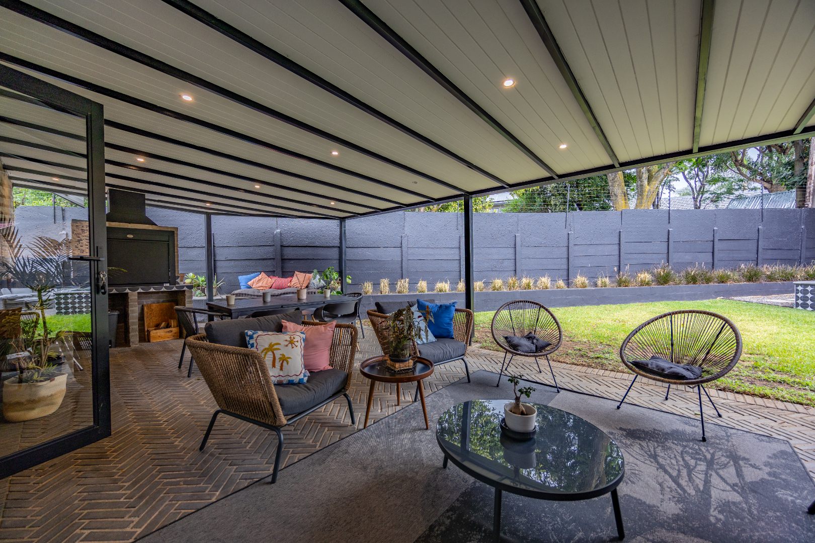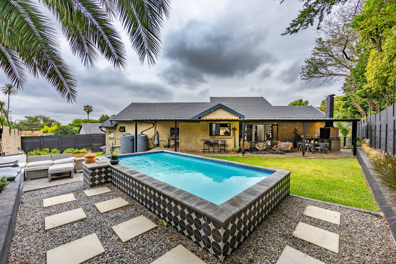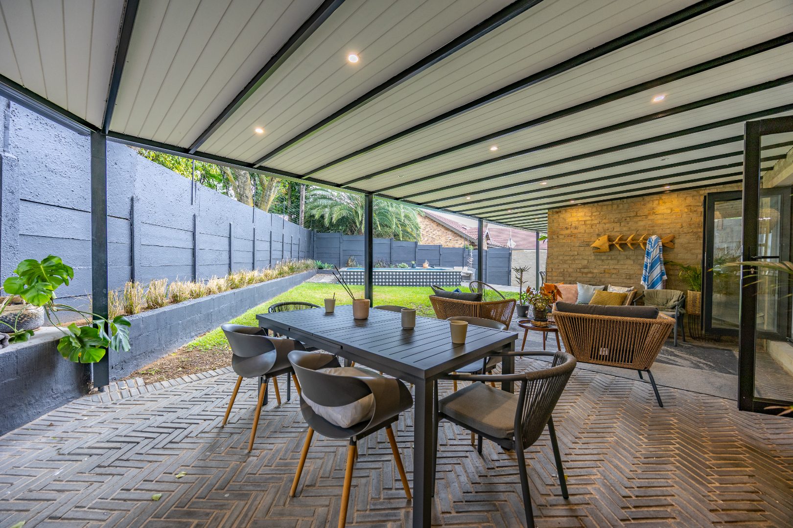 Step outside to enjoy the braai area overlooking a sparkling blue swimming pool, creating an inviting space for relaxation and gatherings.