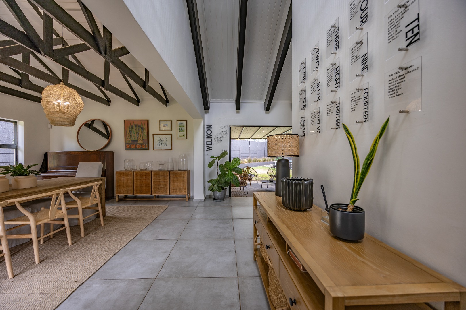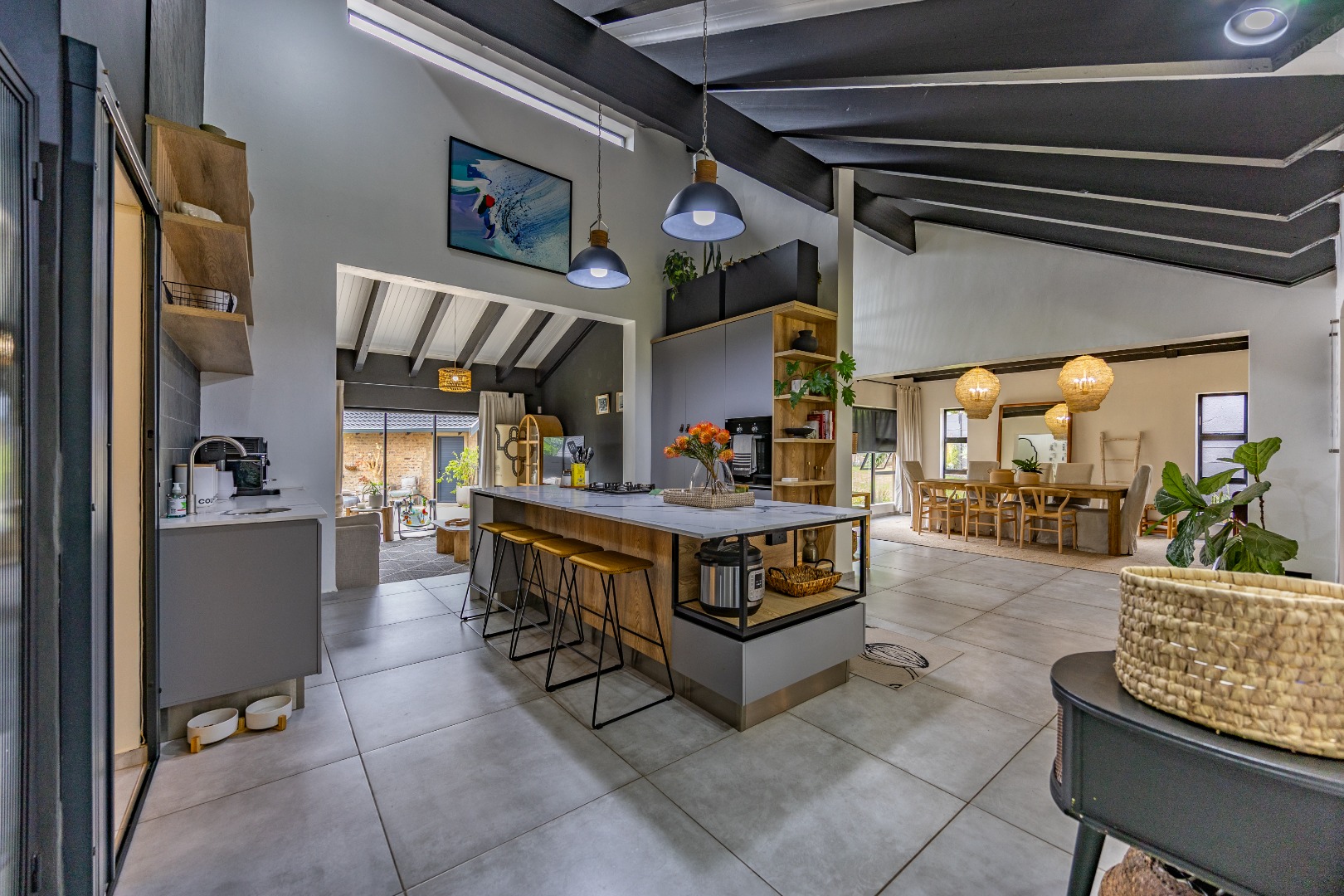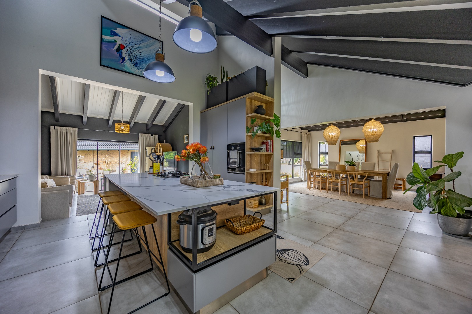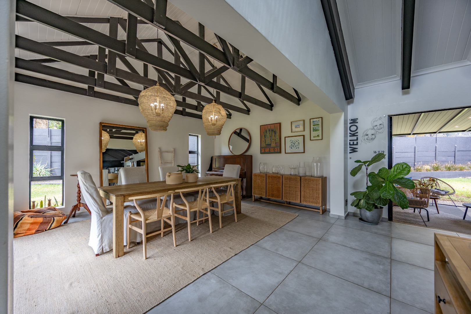 Step outside to enjoy the braai area overlooking a sparkling blue swimming pool, creating an inviting space for relaxation and gatherings.