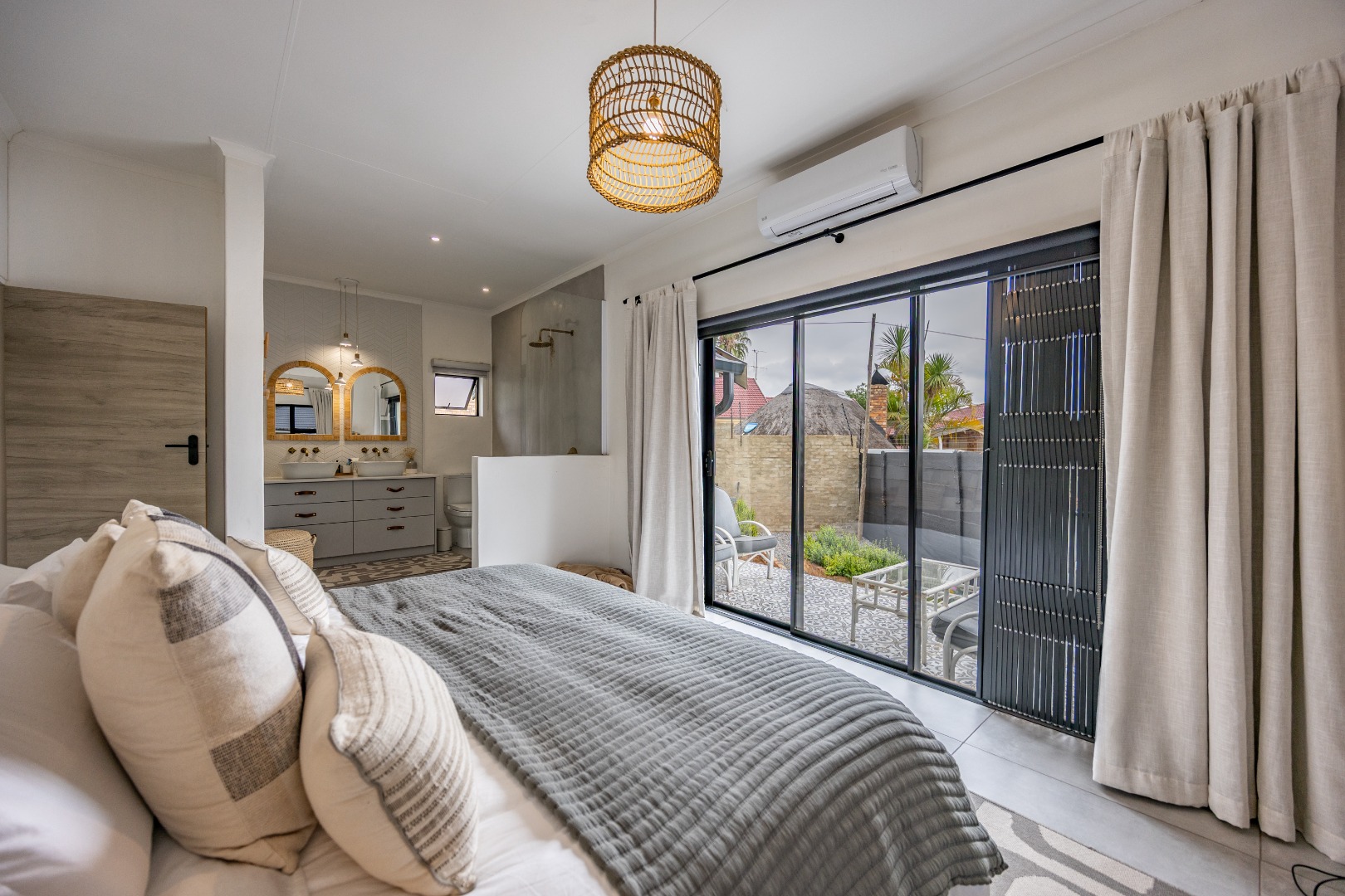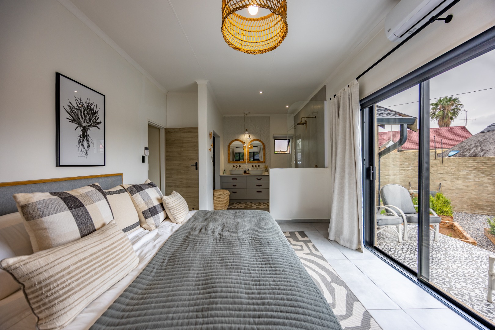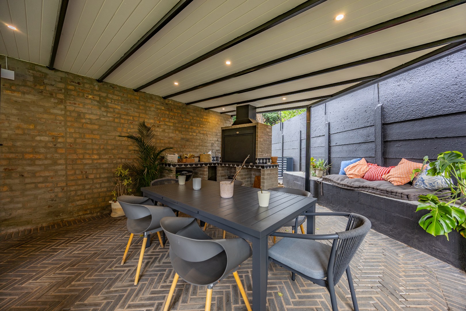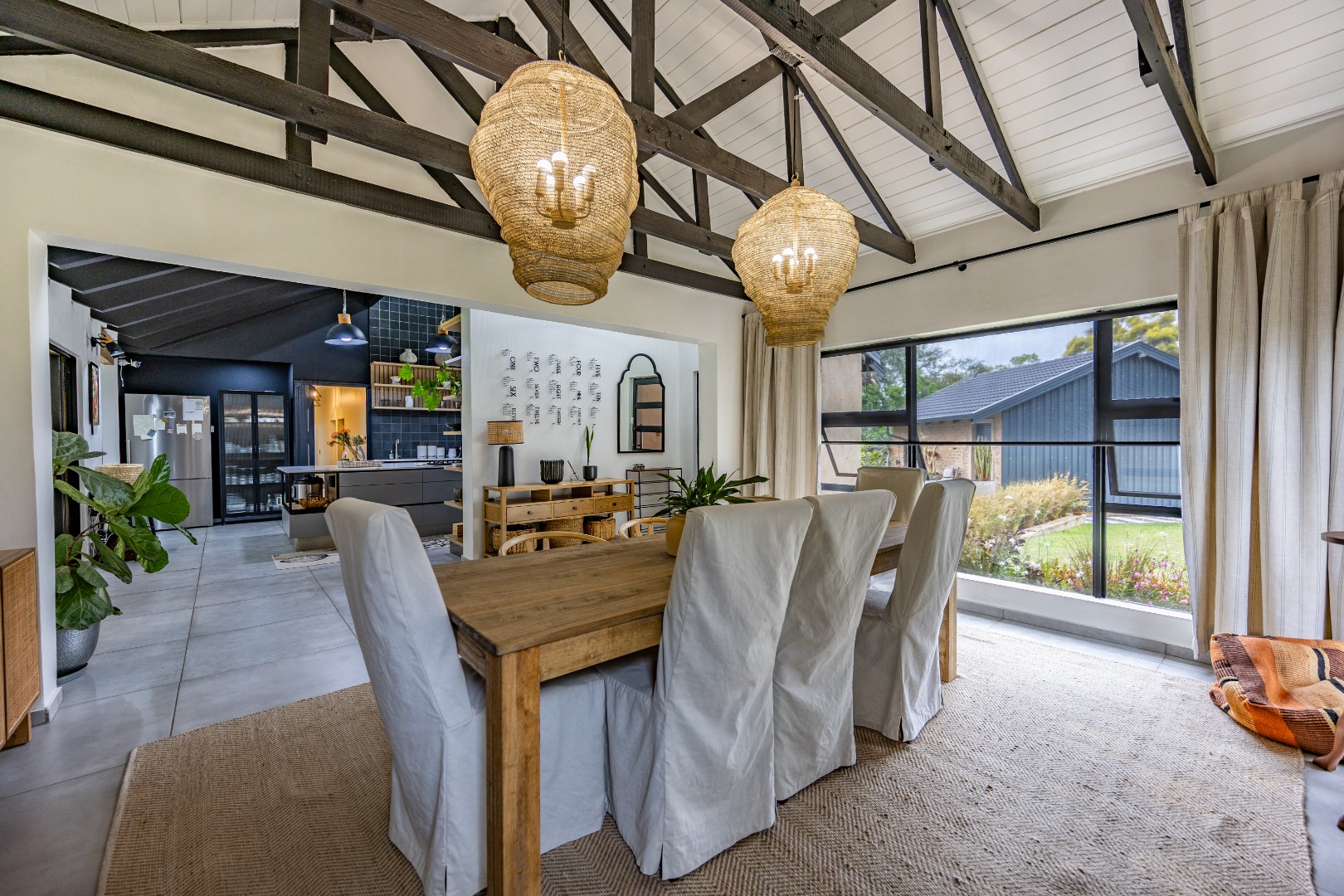 Step outside to enjoy the braai area overlooking a sparkling blue swimming pool, creating an inviting space for relaxation and gatherings.