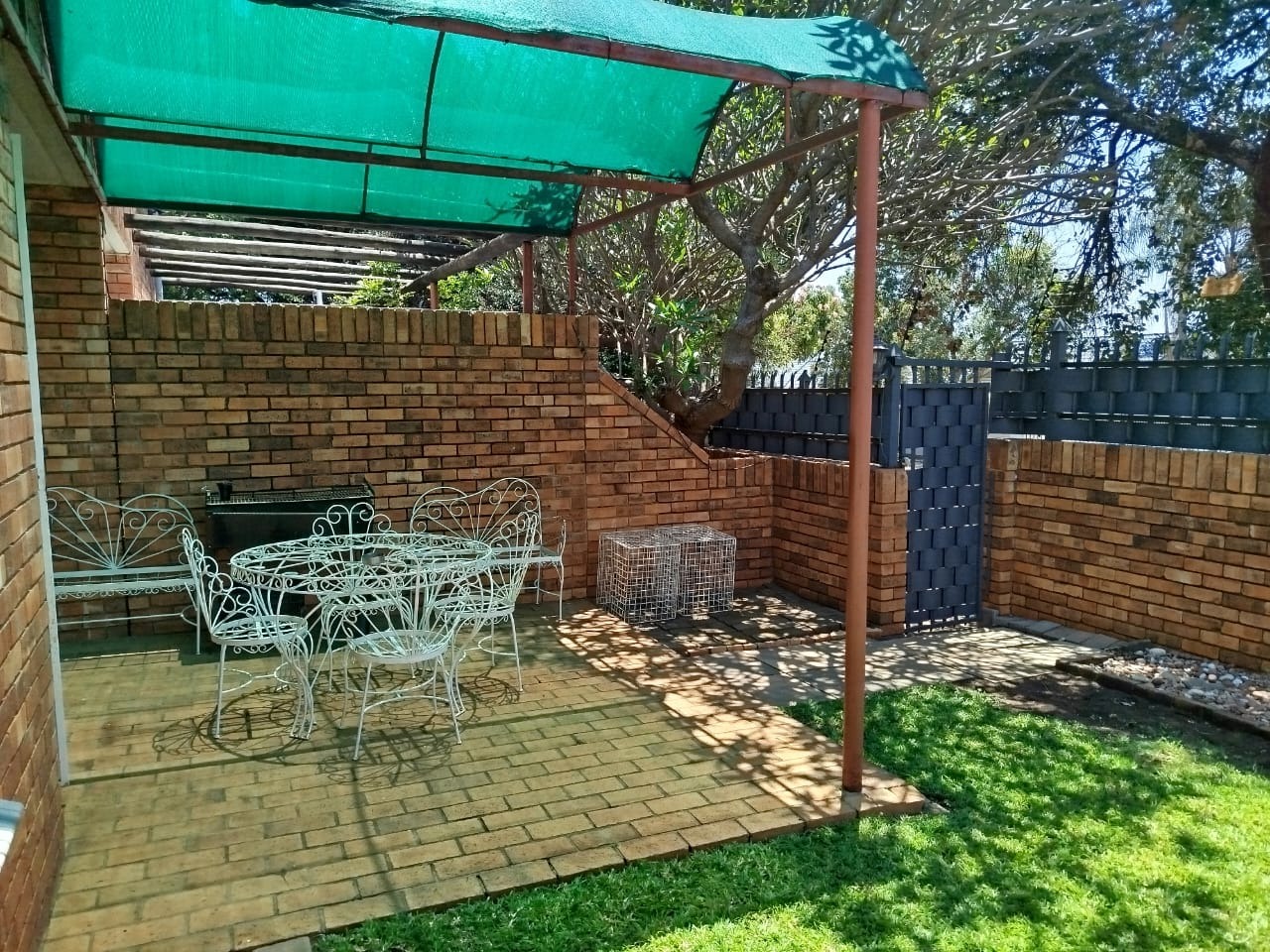 Step outside to a private garden area, complete with a paved patio and a small lawn, perfect for outdoor relaxation and entertaining. A built-in braai and a shade cloth awning over the patio create an ideal setting for gatherings. Pets are allowed, making this a truly family-friendly environment.