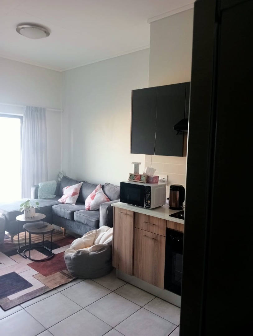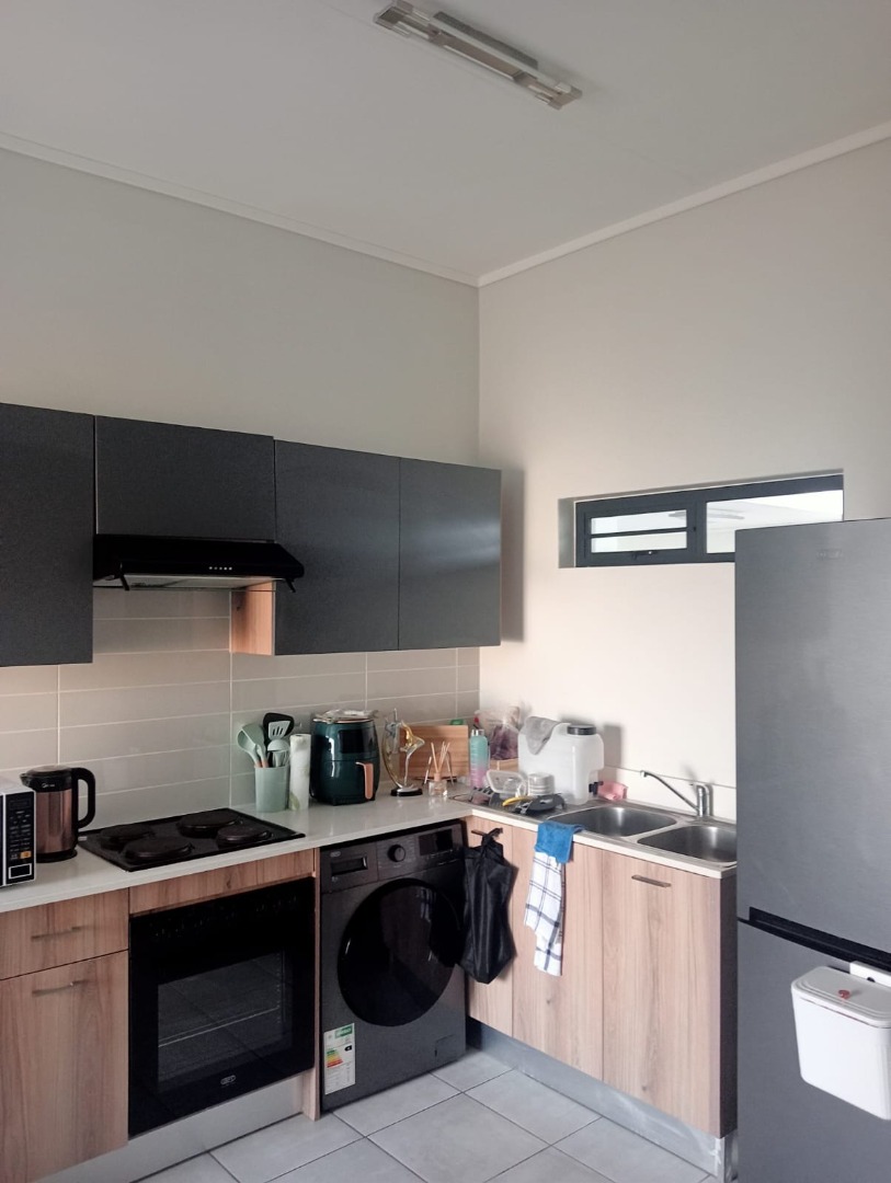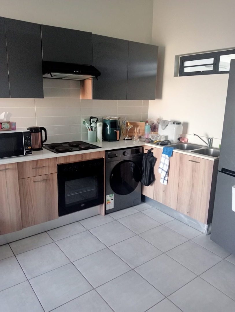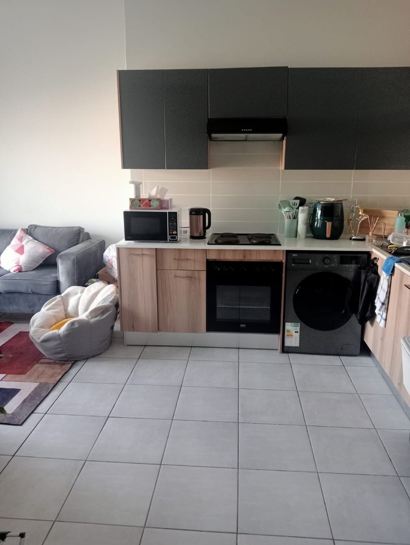 Welcome to a lifestyle of modern elegance and convenience at this stunning 1-bedroom apartment in Greencreek Lifestyle Estate! This beautifully designed unit features sleek tiled floors and light, neutral walls that create a bright and inviting atmosphere throughout. The open-plan living area seamlessly integrates with the modern kitchenette, which boasts stylish cupboards and is equipped with essential appliances including a washing machine, fridge/freezer, and an oven with a stovetop, catering to both practical living and investor appeal. The single bathroom offers a compact yet functional space with a shower and a wall-mounted sink, its tiled walls adding a touch of sophistication and ease of maintenance.