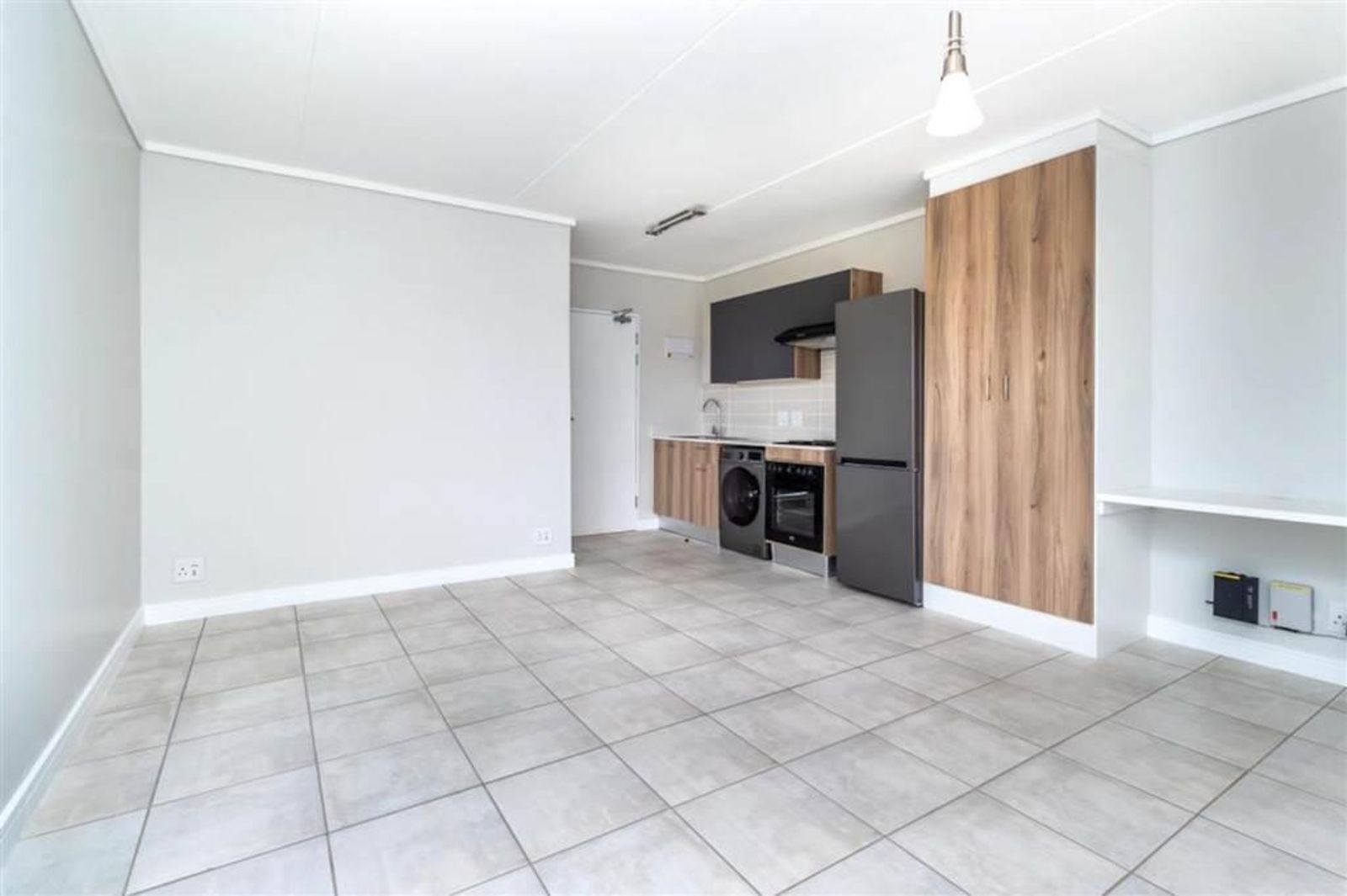 Welcome to a lifestyle of modern elegance and convenience at this stunning 1-bedroom apartment in Greencreek Lifestyle Estate! This beautifully designed unit features sleek tiled floors and light, neutral walls that create a bright and inviting atmosphere throughout. The open-plan living area seamlessly integrates with the modern kitchenette, which boasts stylish cupboards and is equipped with essential appliances including a washing machine, fridge/freezer, and an oven with a stovetop, catering to both practical living and investor appeal. The single bathroom offers a compact yet functional space with a shower and a wall-mounted sink, its tiled walls adding a touch of sophistication and ease of maintenance.