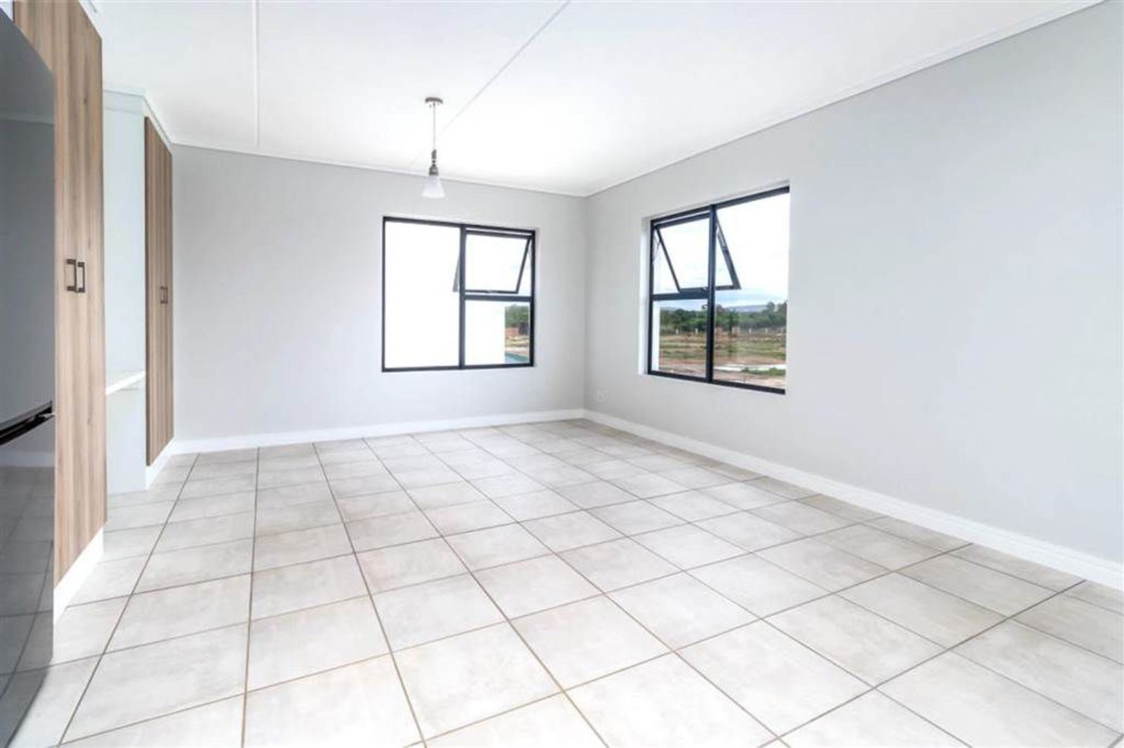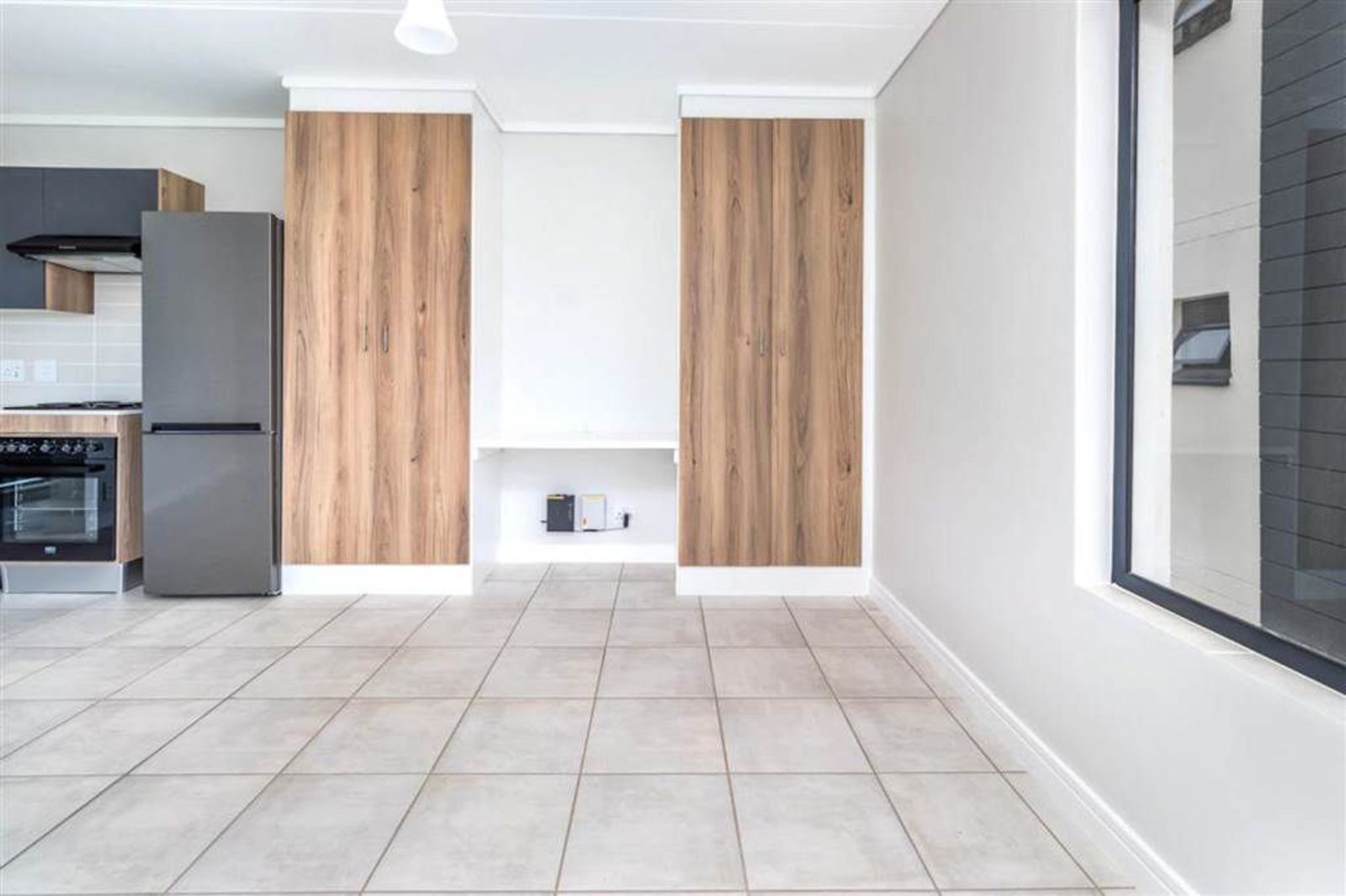 Welcome to a lifestyle of modern elegance and convenience at this stunning 1-bedroom apartment in Greencreek Lifestyle Estate! This beautifully designed unit features sleek tiled floors and light, neutral walls that create a bright and inviting atmosphere throughout. The open-plan living area seamlessly integrates with the modern kitchenette, which boasts stylish cupboards and is equipped with essential appliances including a washing machine, fridge/freezer, and an oven with a stovetop, catering to both practical living and investor appeal. The single bathroom offers a compact yet functional space with a shower and a wall-mounted sink, its tiled walls adding a touch of sophistication and ease of maintenance.