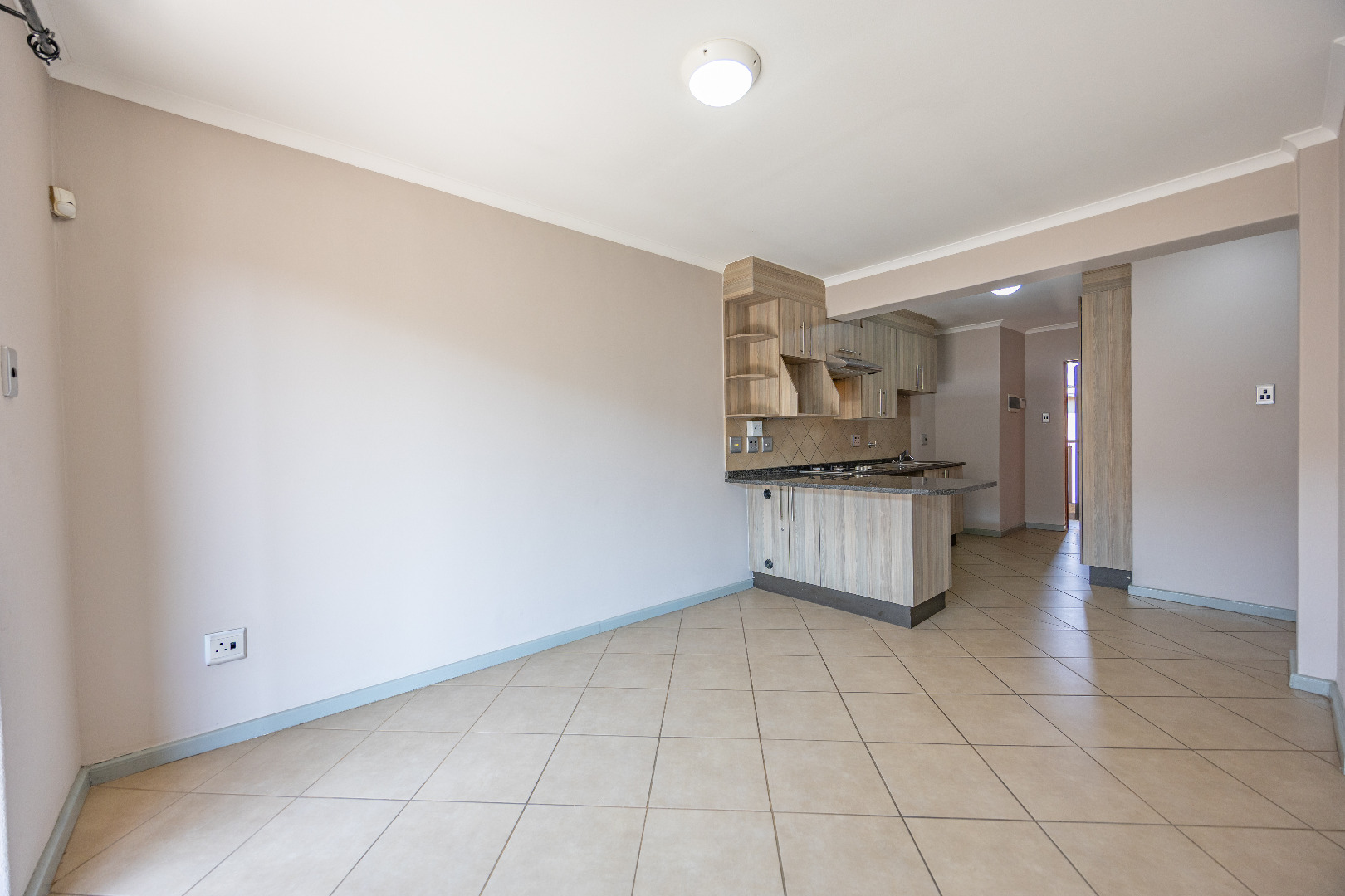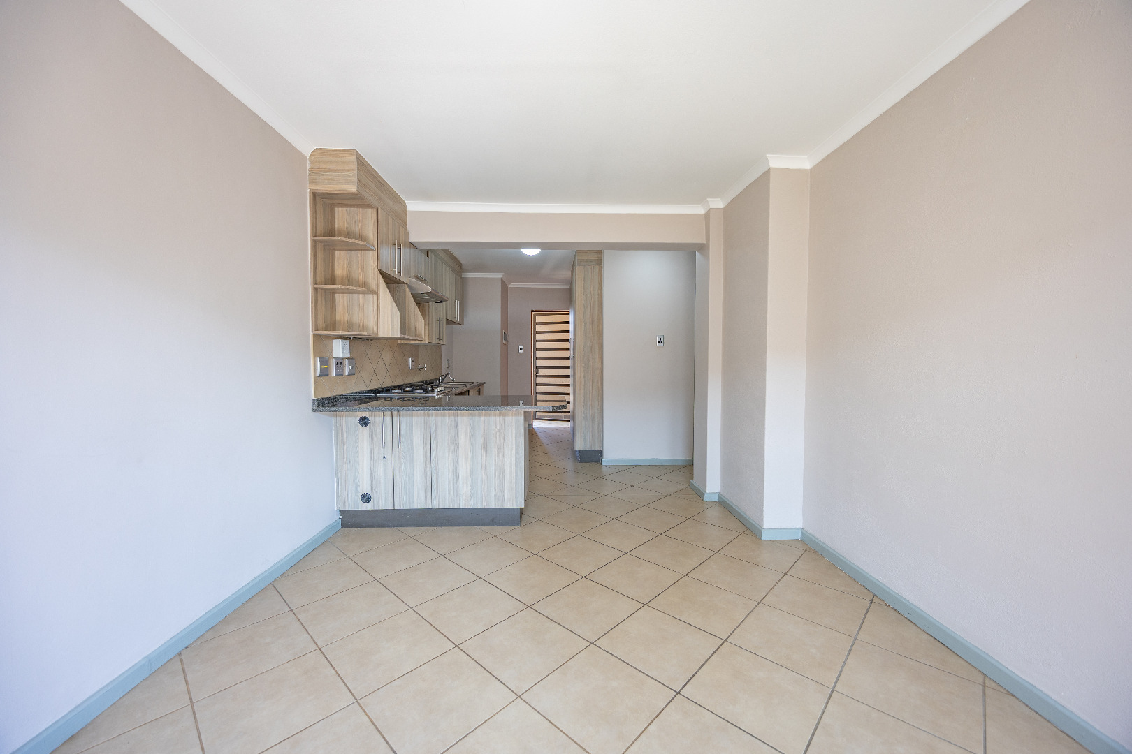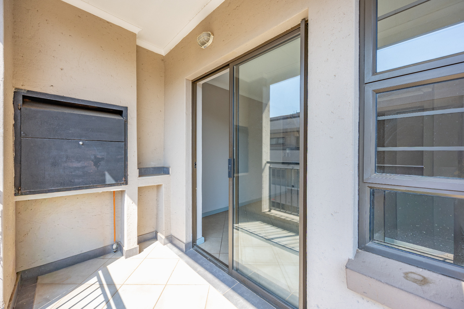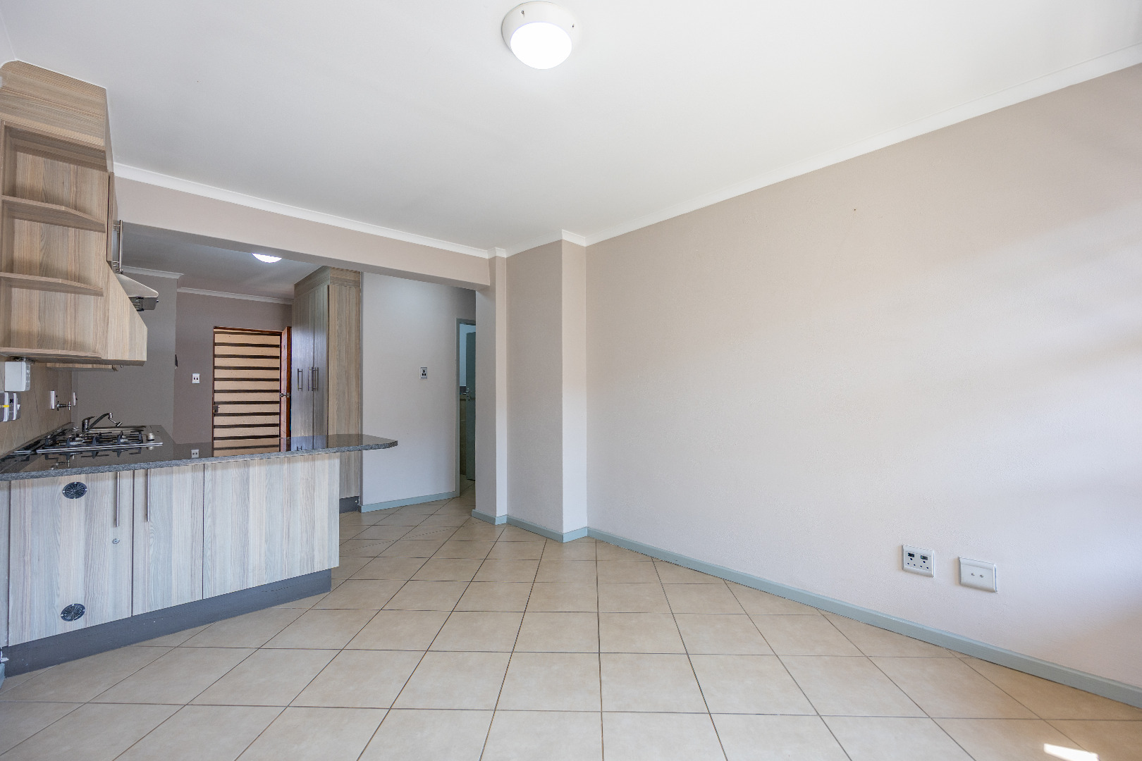 This modern apartment combines style with functionality, offering a practical layout and quality finishes throughout. The open-plan kitchen comes equipped with a gas stove, space for one appliance, and a single-door fridge, seamlessly connecting to the living area. From here, doors lead out to a private balcony with a built-in braai – the perfect spot for entertaining guests or enjoying a quiet evening outdoors.