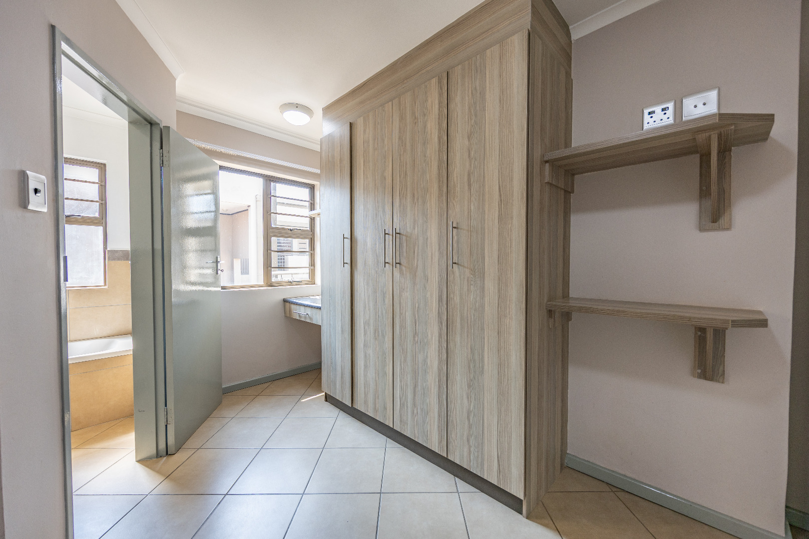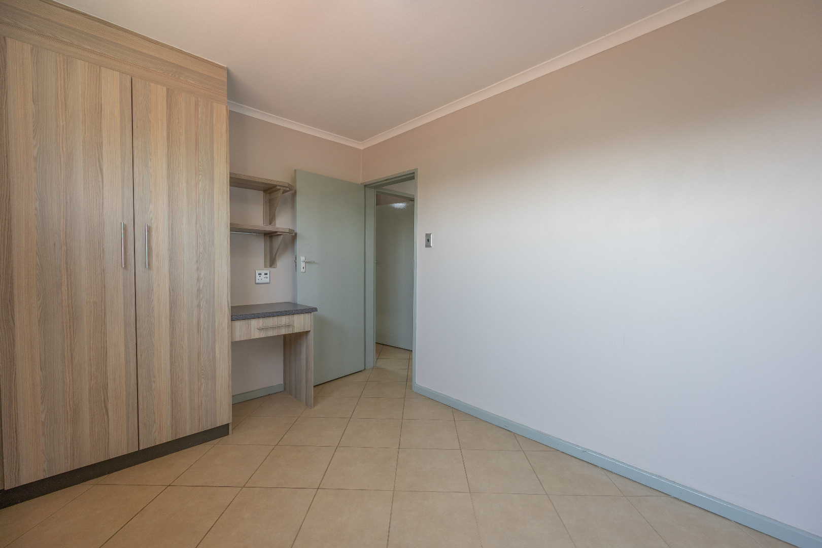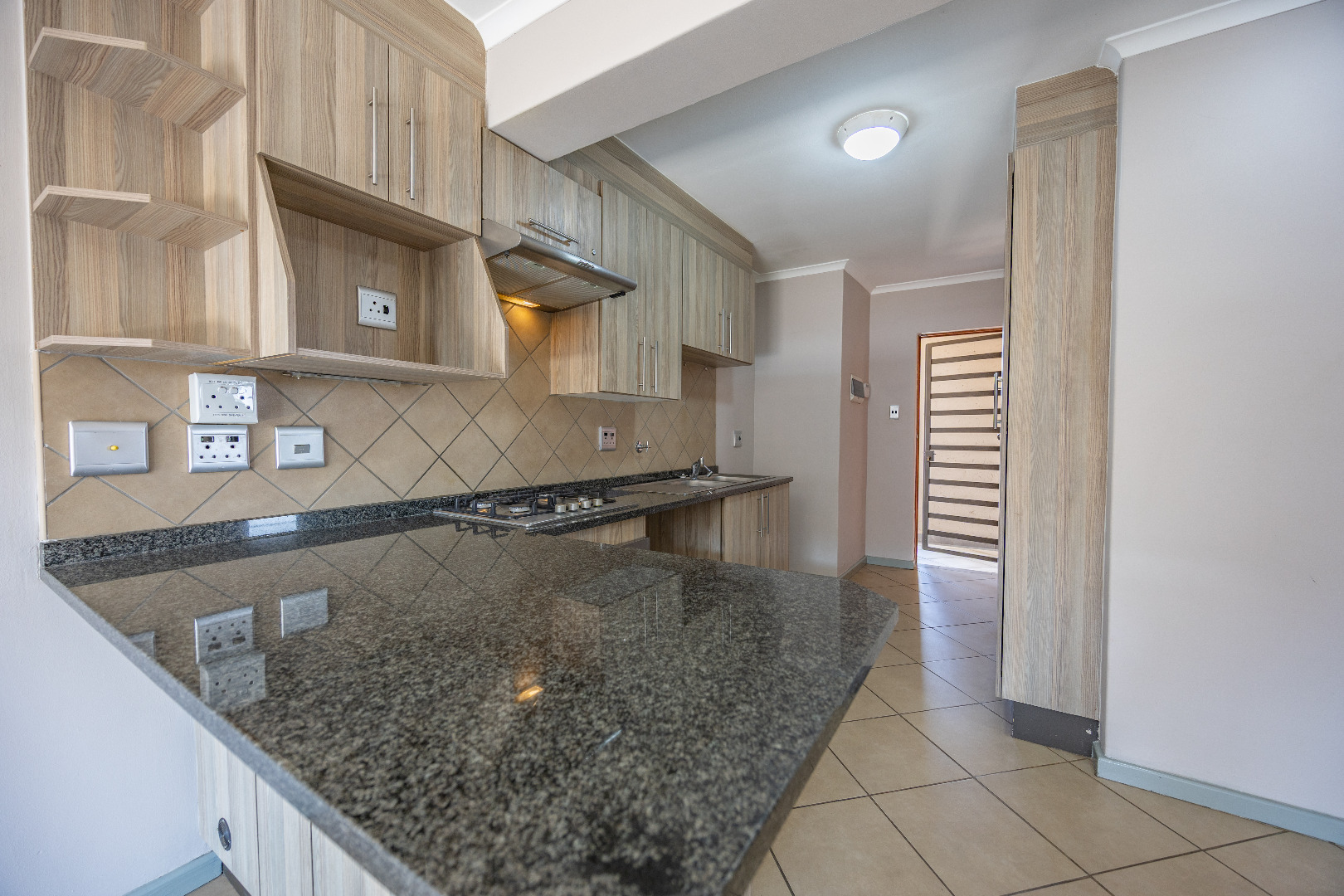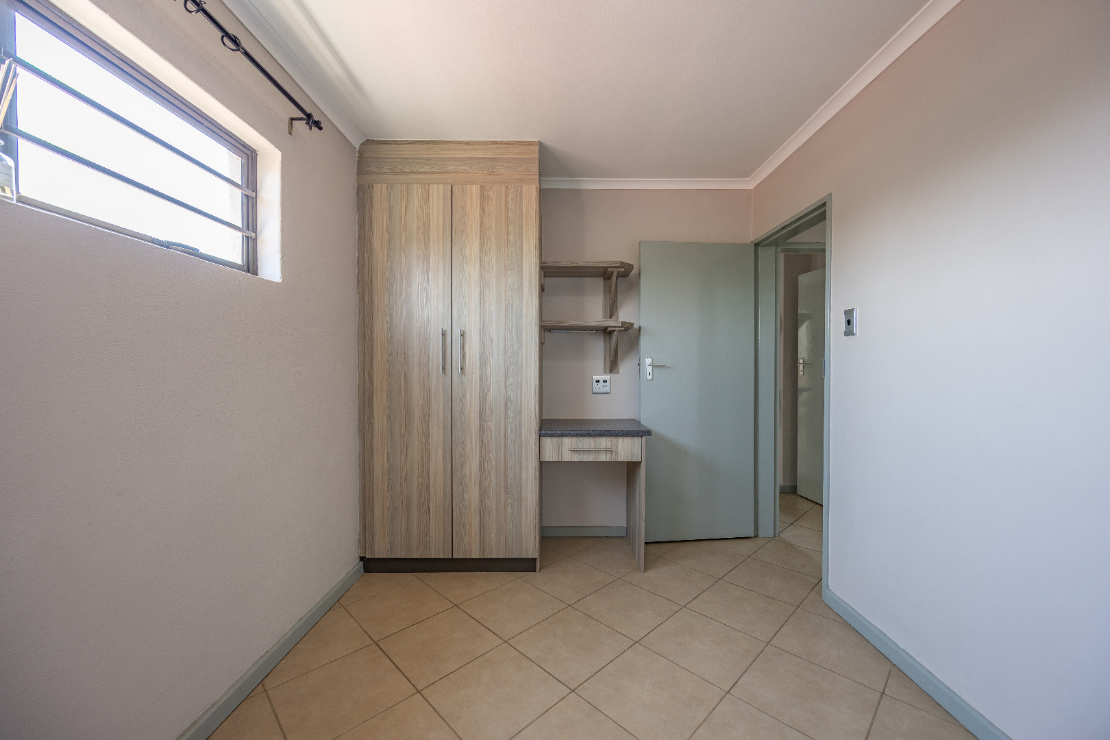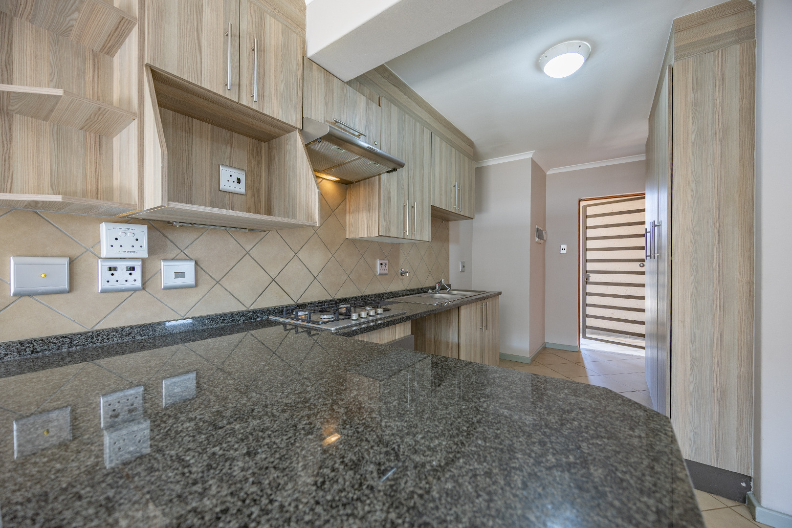 This modern apartment combines style with functionality, offering a practical layout and quality finishes throughout. The open-plan kitchen comes equipped with a gas stove, space for one appliance, and a single-door fridge, seamlessly connecting to the living area. From here, doors lead out to a private balcony with a built-in braai – the perfect spot for entertaining guests or enjoying a quiet evening outdoors.