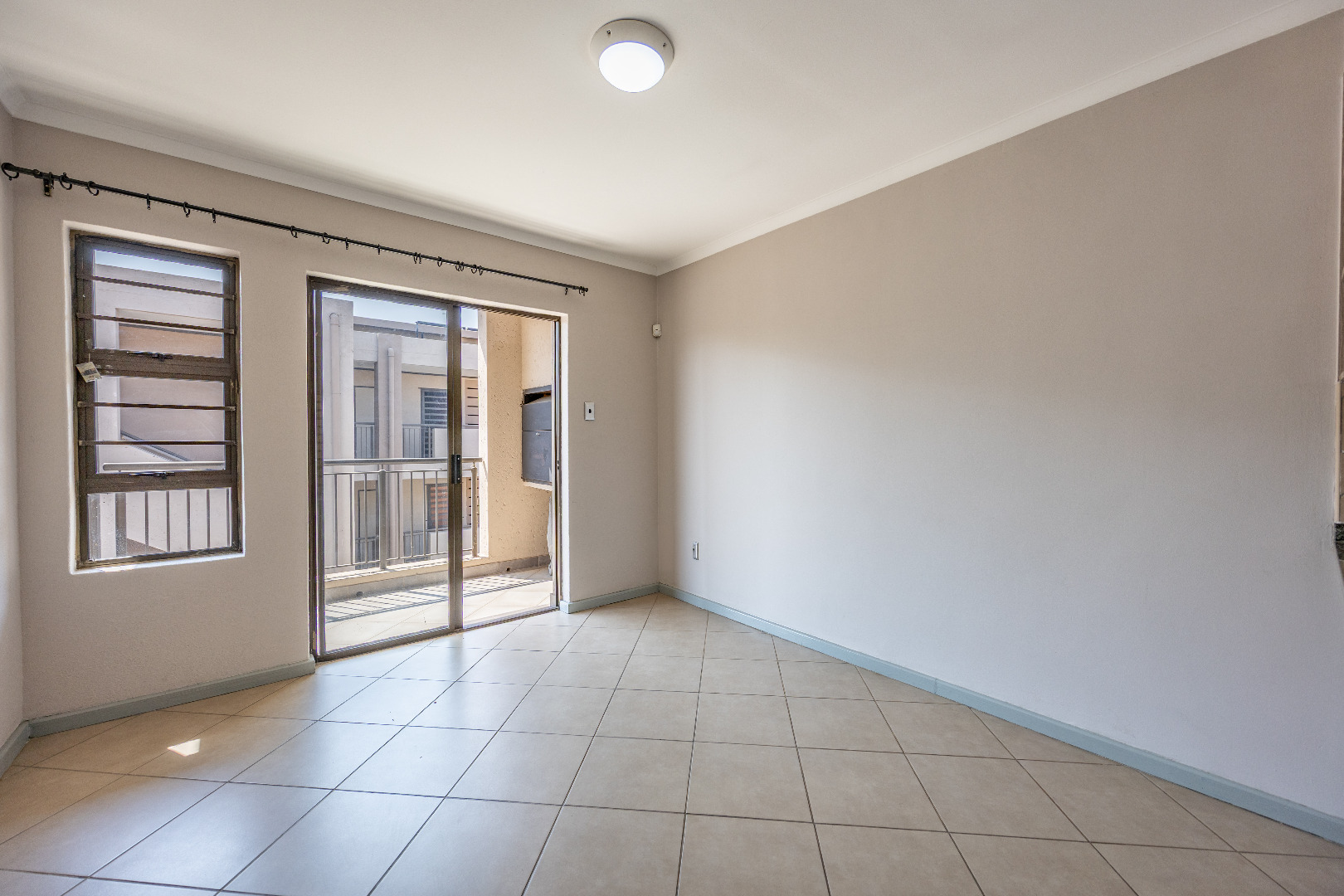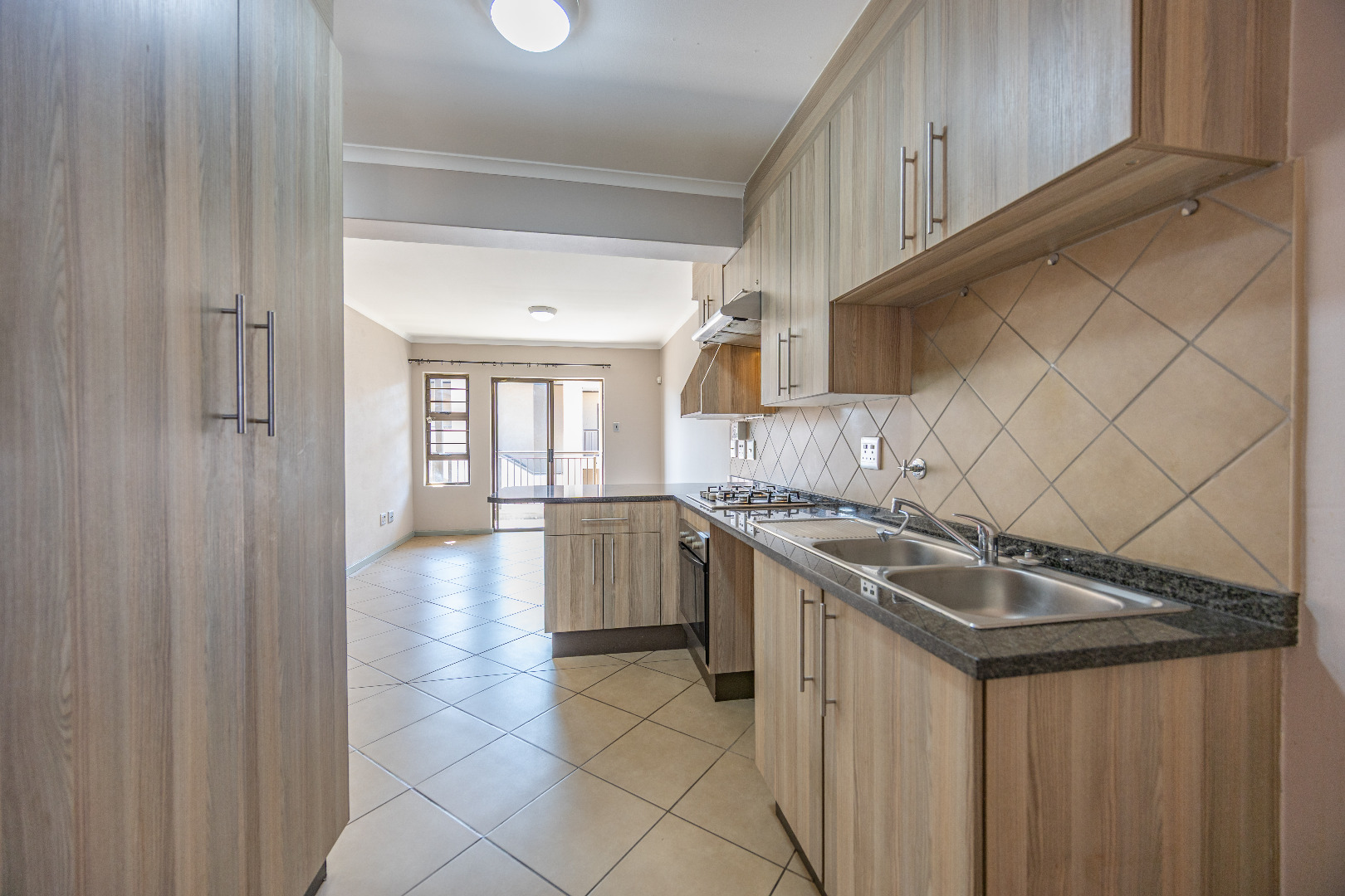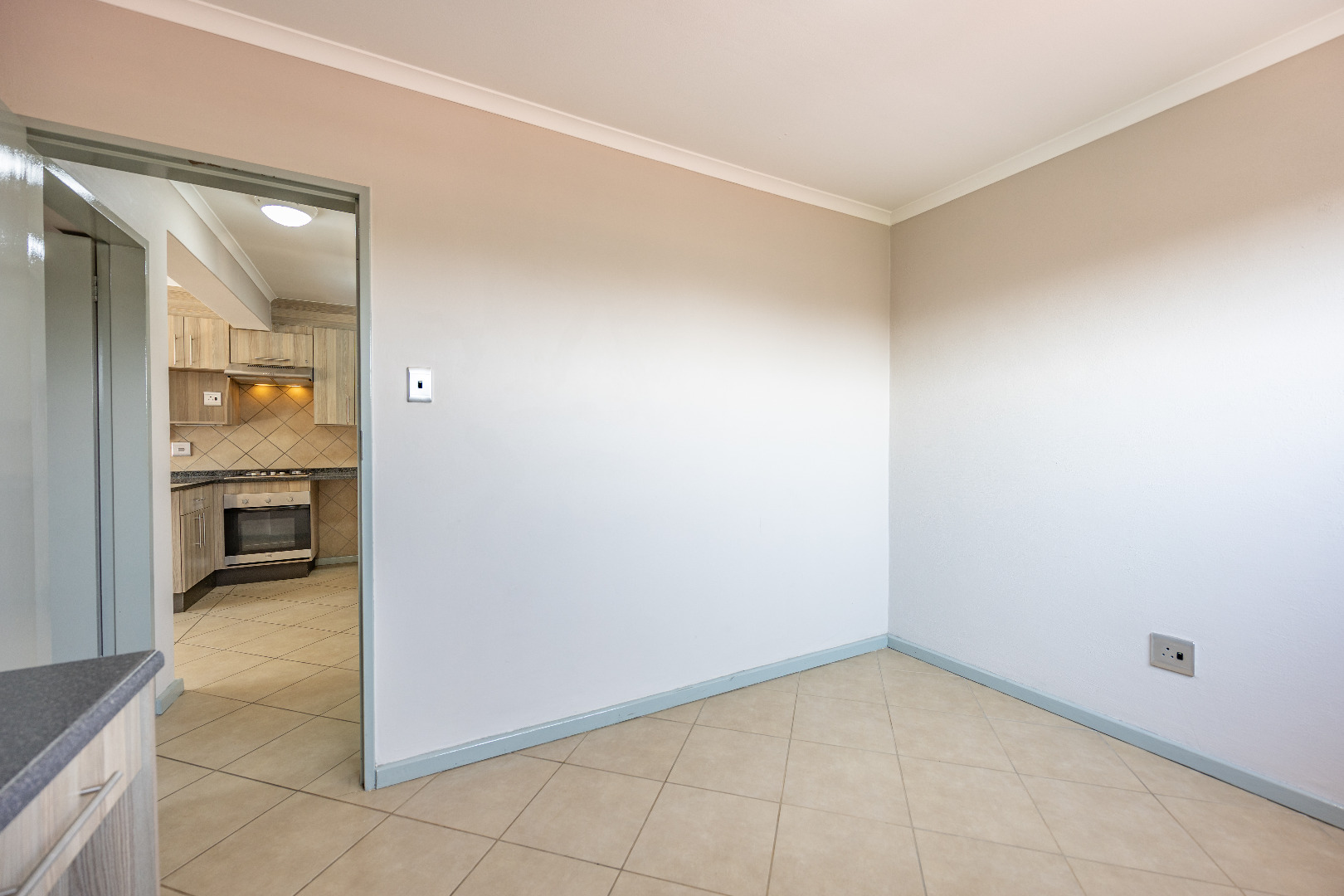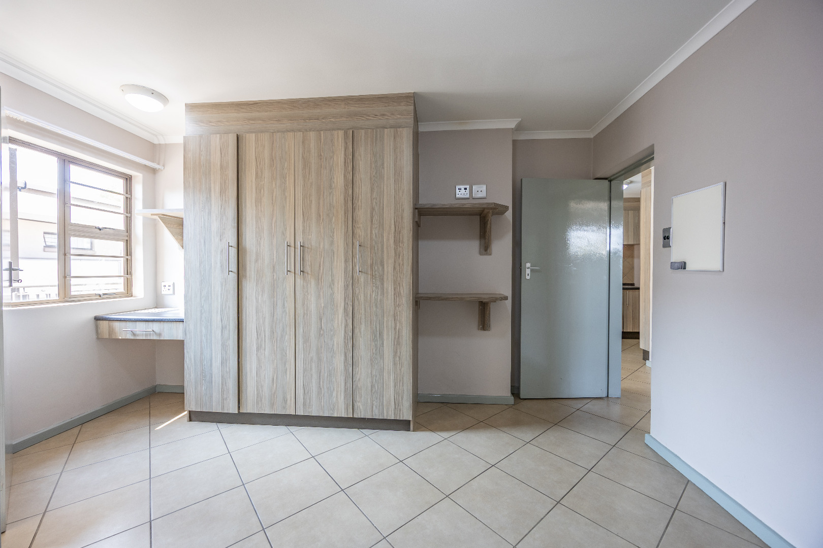 This modern apartment combines style with functionality, offering a practical layout and quality finishes throughout. The open-plan kitchen comes equipped with a gas stove, space for one appliance, and a single-door fridge, seamlessly connecting to the living area. From here, doors lead out to a private balcony with a built-in braai – the perfect spot for entertaining guests or enjoying a quiet evening outdoors.