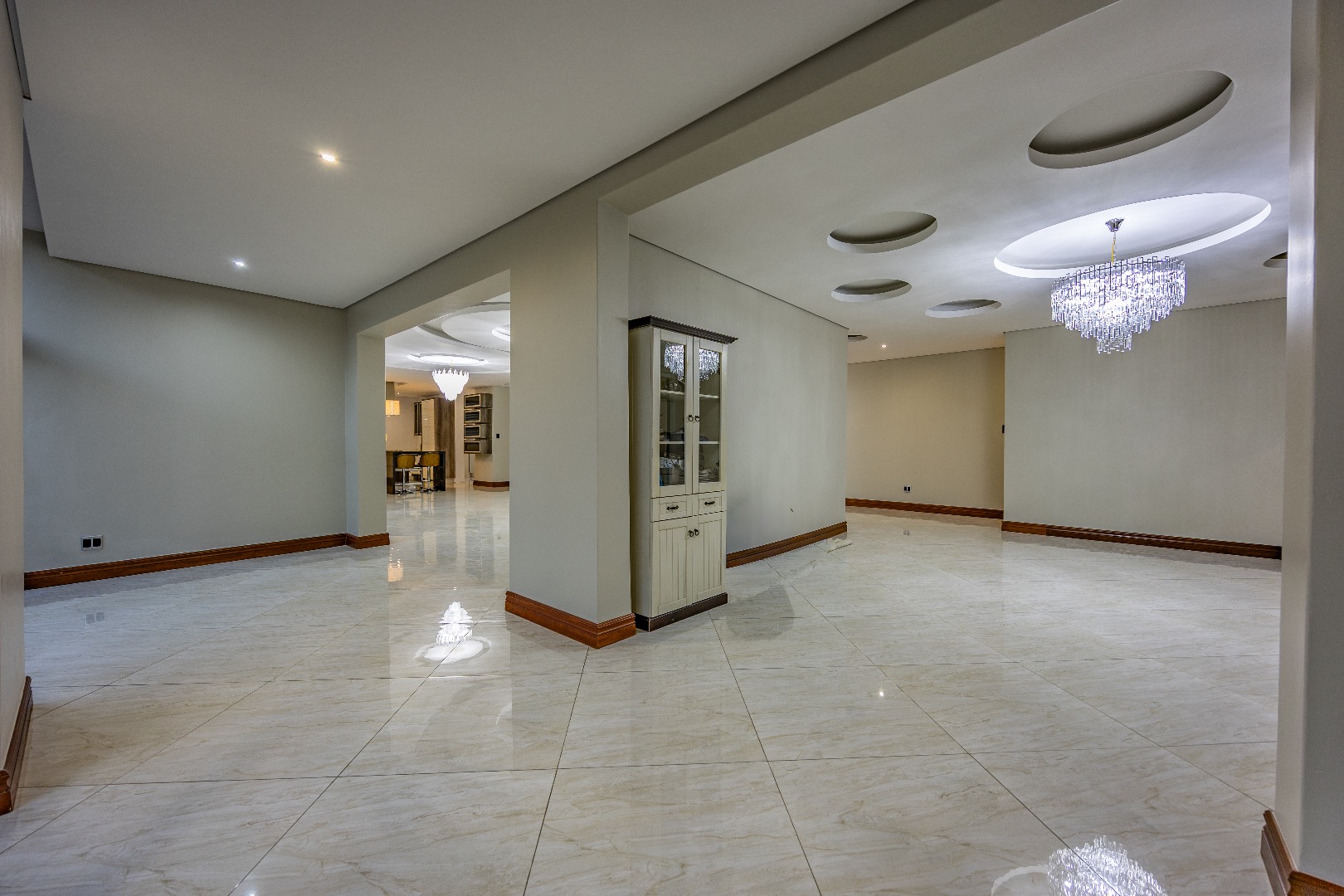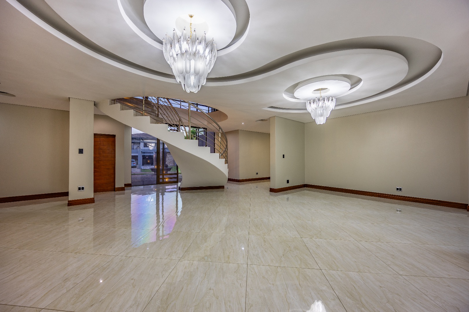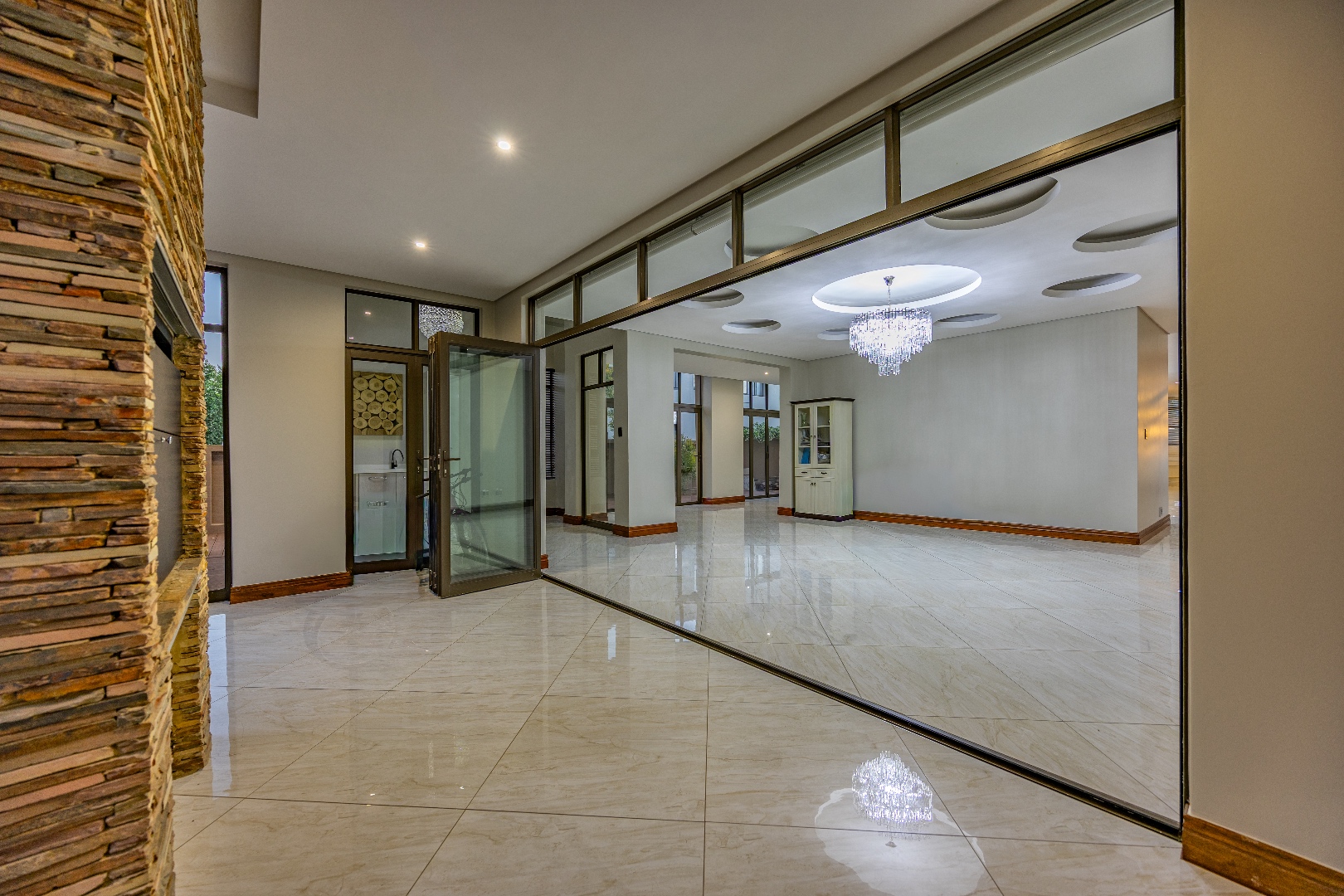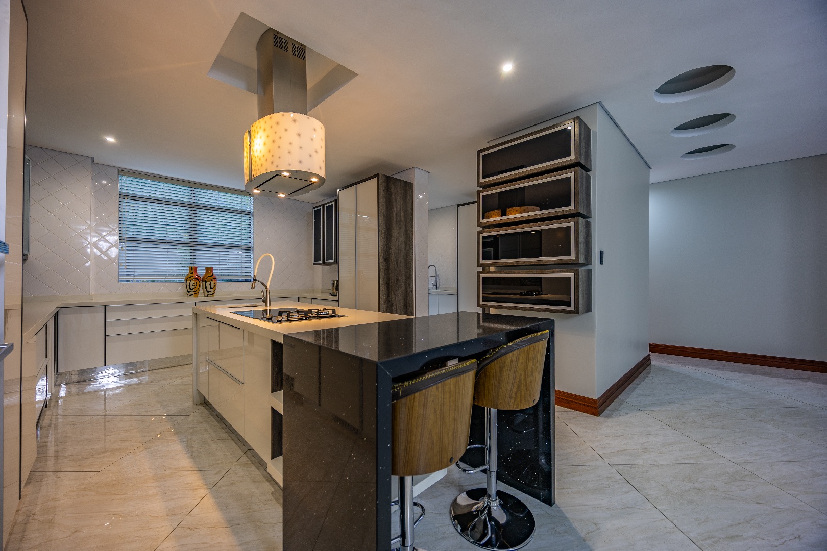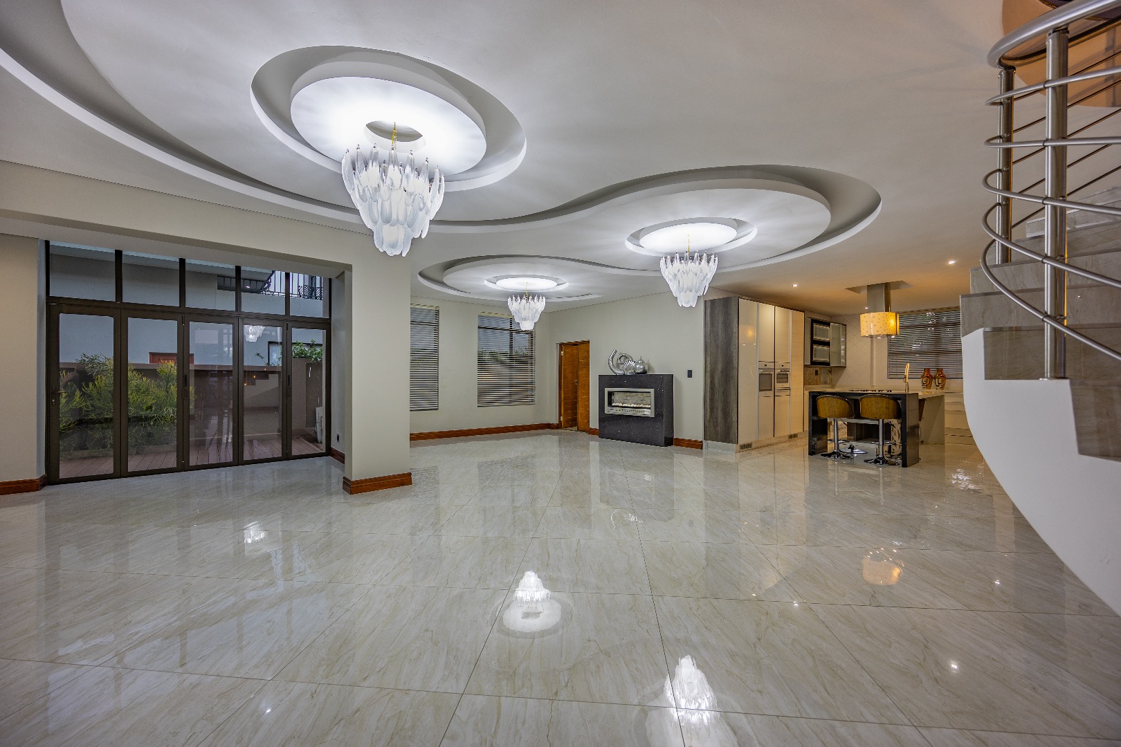 Discover a newly renovated, ultra-modern masterpiece for sale in the prestigious Lombardy Estate, offering exceptional luxury, space, and cutting-edge design. This home welcomes you with a grand entrance featuring a striking spiral staircase that sets the tone for the contemporary elegance found throughout. The expansive open-plan layout connects the designer kitchen, dining area, and double lounge to a sophisticated bar and entertainment area, all flowing seamlessly onto a covered patio overlooking the pool. The home showcases remarkable light installations, including bespoke 3D ceiling remodelling, enhancing its architectural brilliance. It offers five spacious en-suite bedrooms, with the guest suite conveniently located downstairs, while the enormous master bedroom features abundant cupboard space and a dedicated dressing area. The kitchen is a true showpiece, equipped with Miele appliances, special lighting, and a combination of induction and gas cooking.