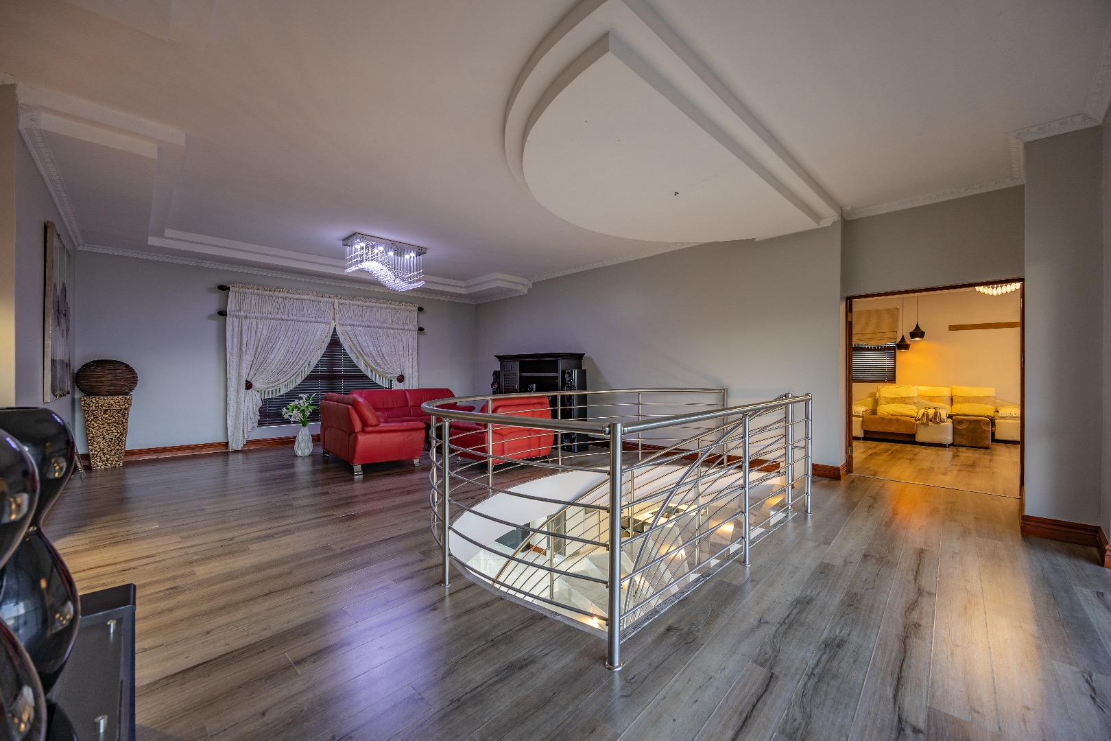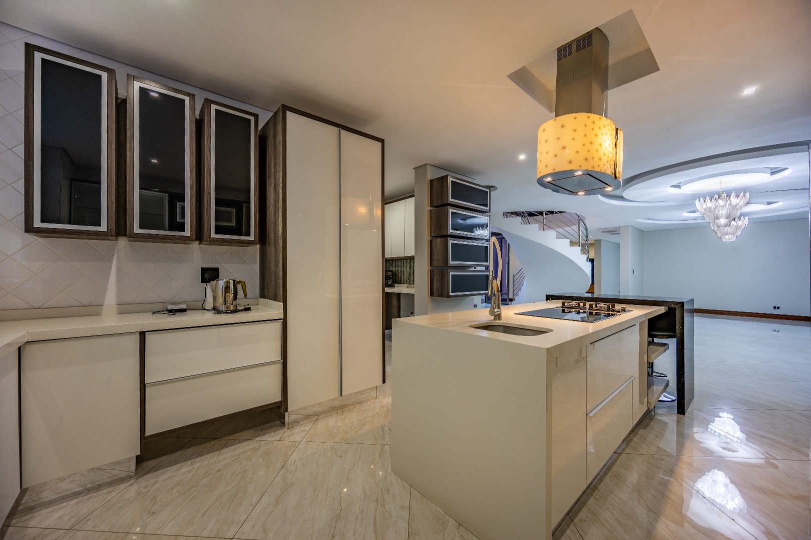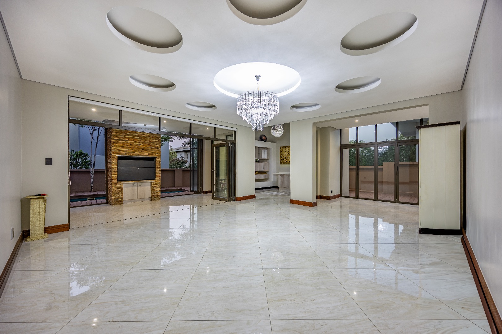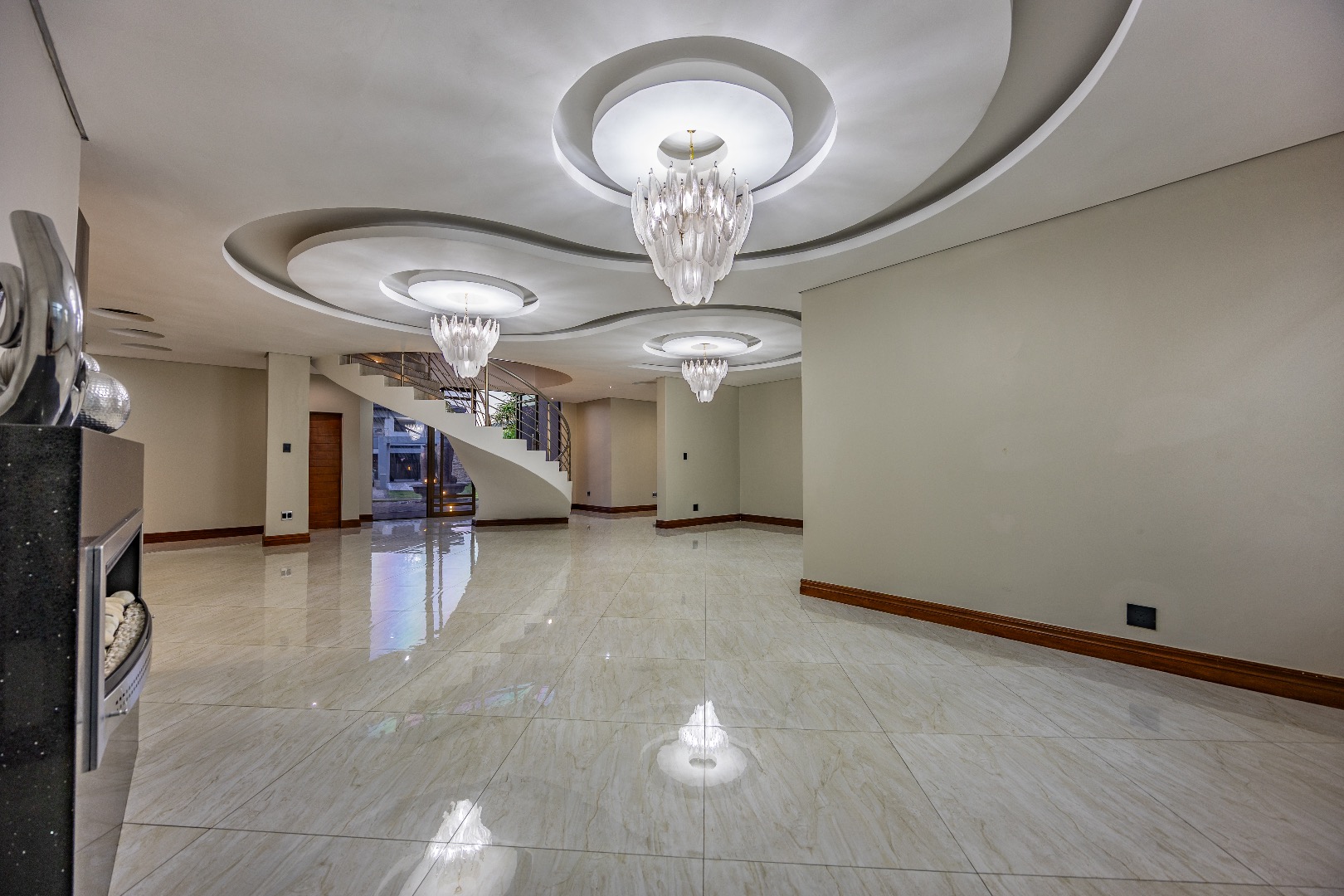 Discover a newly renovated, ultra-modern masterpiece for sale in the prestigious Lombardy Estate, offering exceptional luxury, space, and cutting-edge design. This home welcomes you with a grand entrance featuring a striking spiral staircase that sets the tone for the contemporary elegance found throughout. The expansive open-plan layout connects the designer kitchen, dining area, and double lounge to a sophisticated bar and entertainment area, all flowing seamlessly onto a covered patio overlooking the pool. The home showcases remarkable light installations, including bespoke 3D ceiling remodelling, enhancing its architectural brilliance. It offers five spacious en-suite bedrooms, with the guest suite conveniently located downstairs, while the enormous master bedroom features abundant cupboard space and a dedicated dressing area. The kitchen is a true showpiece, equipped with Miele appliances, special lighting, and a combination of induction and gas cooking.
