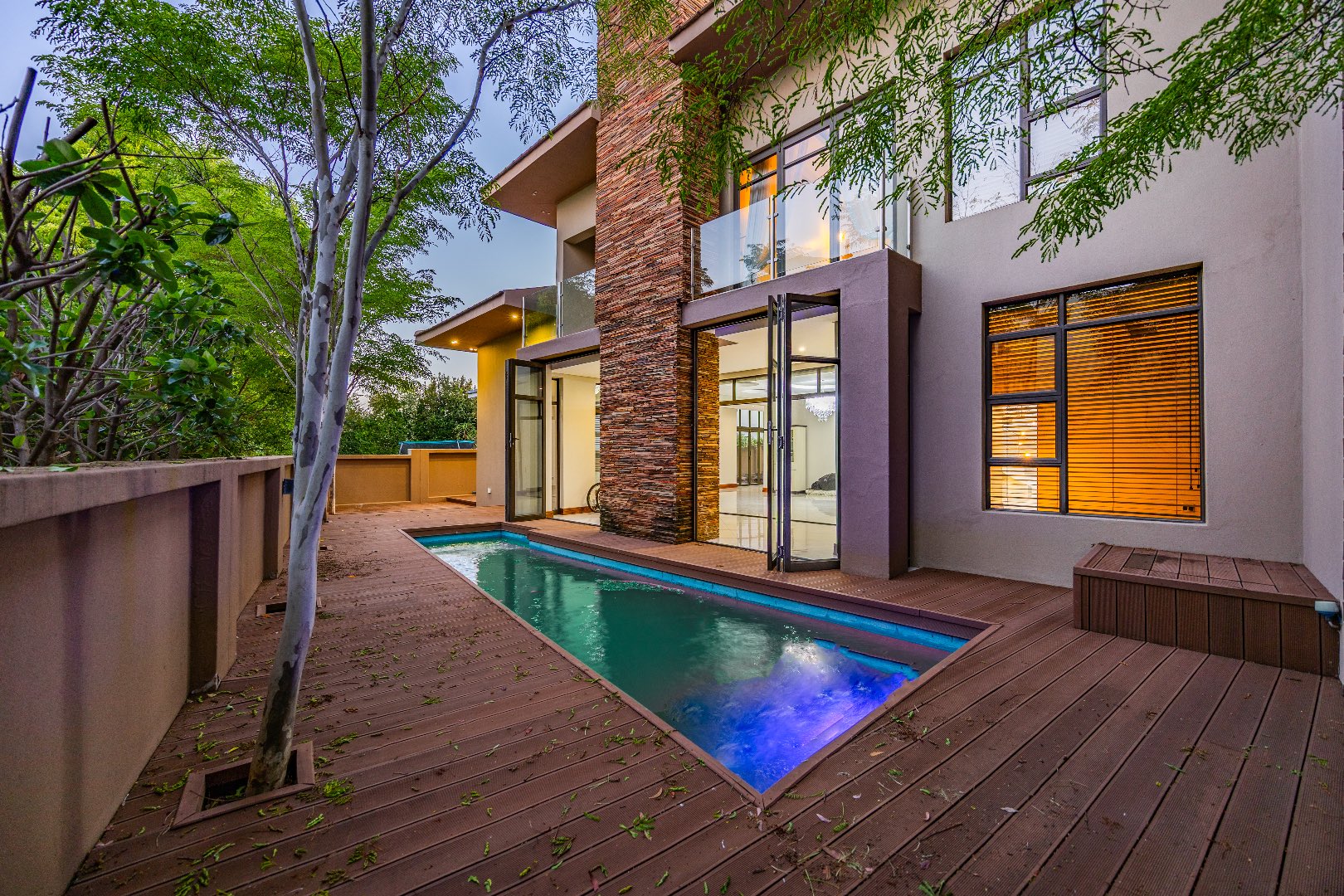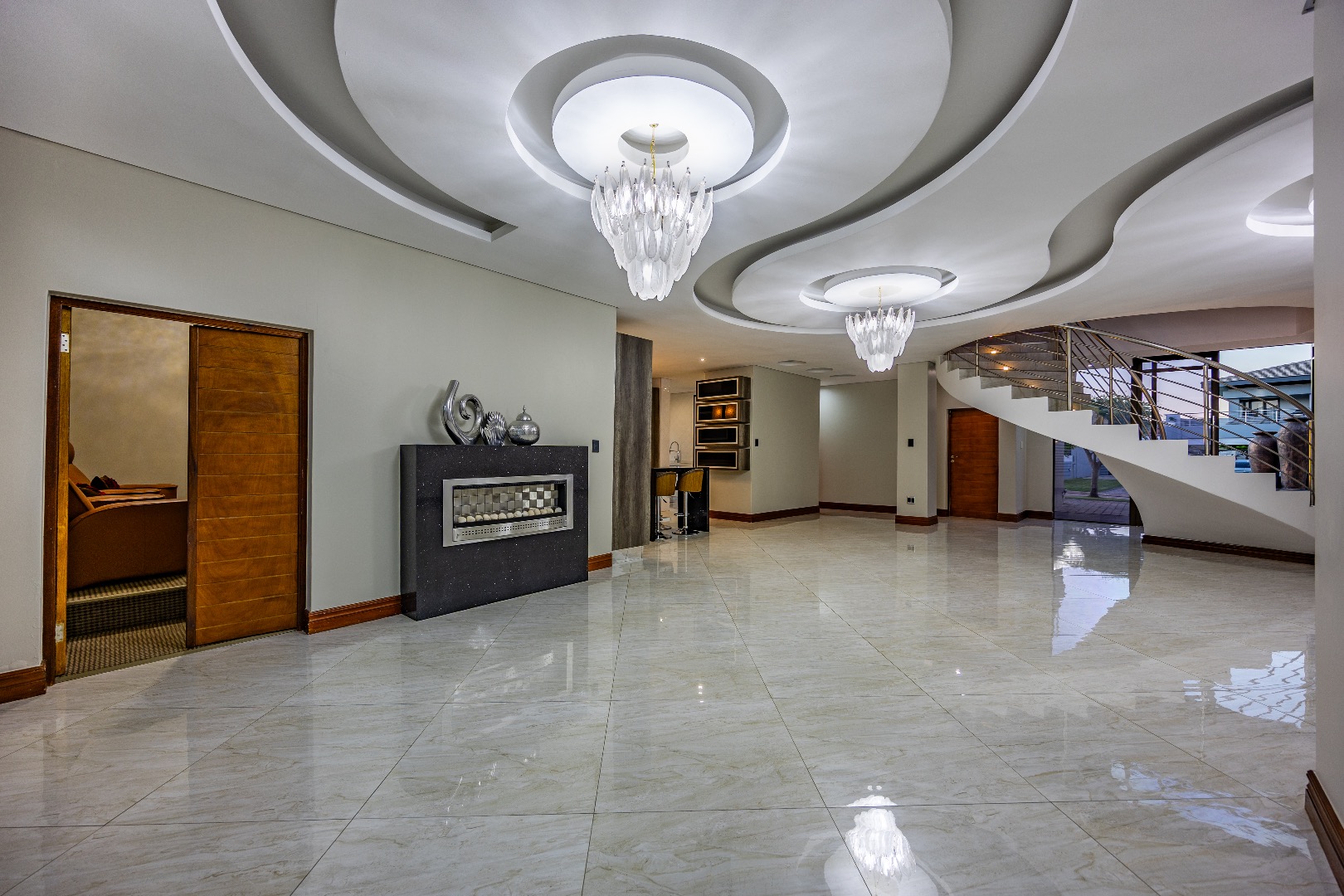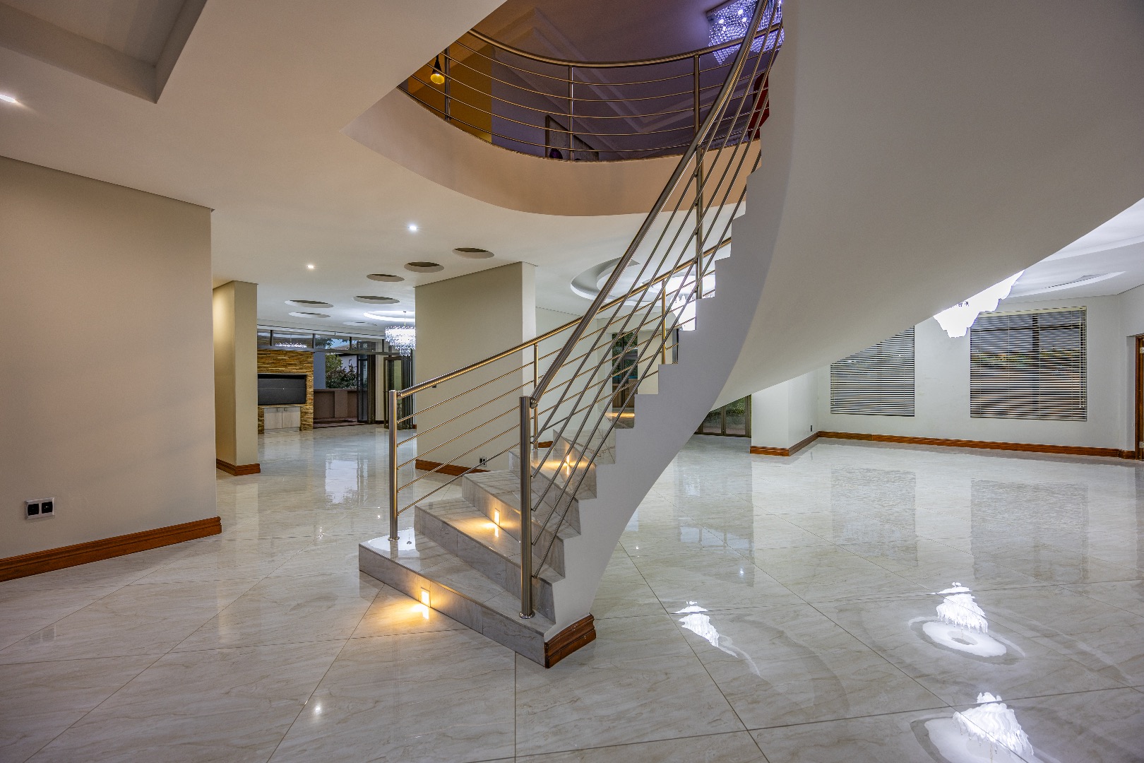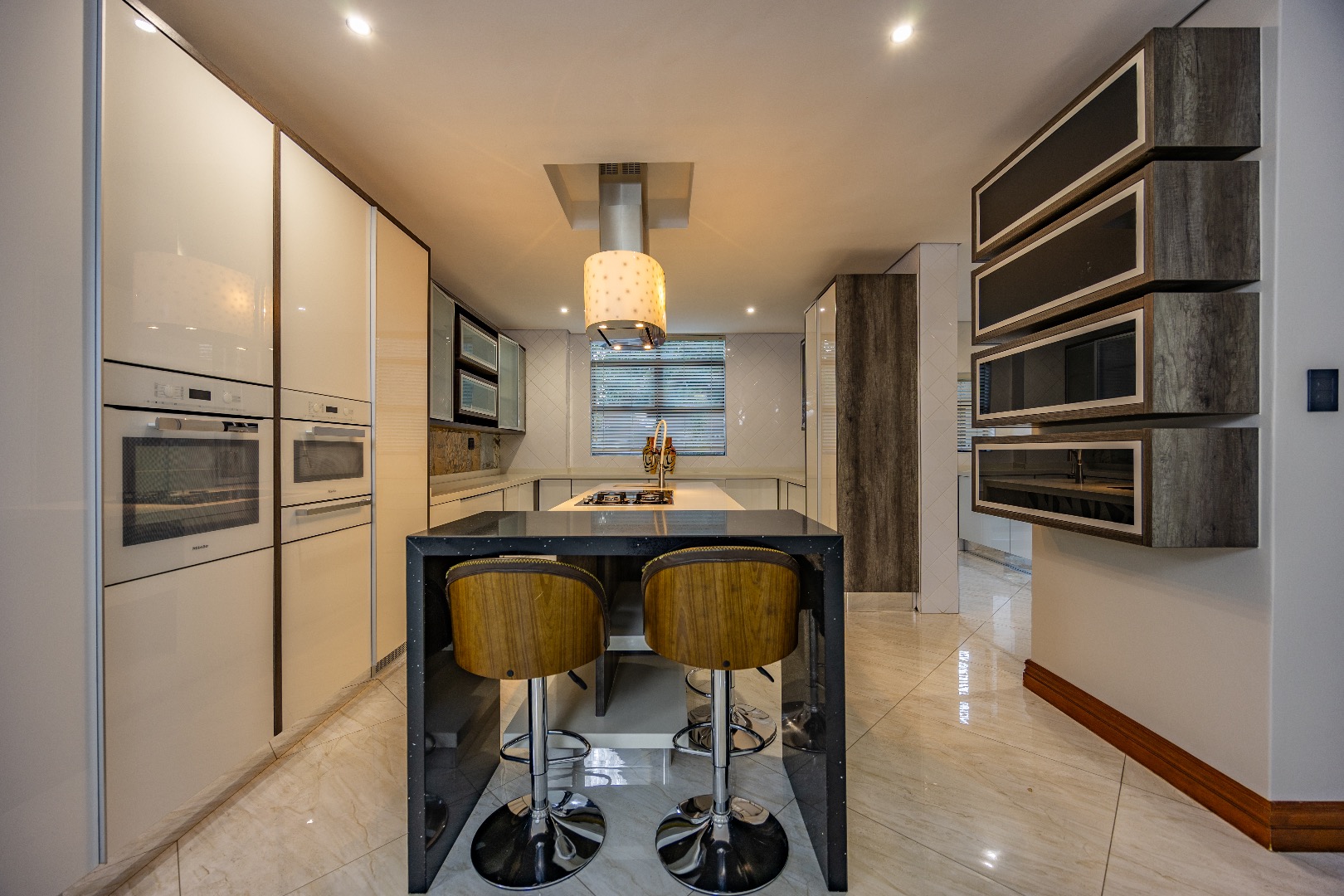 Discover a newly renovated, ultra-modern masterpiece for sale in the prestigious Lombardy Estate, offering exceptional luxury, space, and cutting-edge design. This home welcomes you with a grand entrance featuring a striking spiral staircase that sets the tone for the contemporary elegance found throughout. The expansive open-plan layout connects the designer kitchen, dining area, and double lounge to a sophisticated bar and entertainment area, all flowing seamlessly onto a covered patio overlooking the pool. The home showcases remarkable light installations, including bespoke 3D ceiling remodelling, enhancing its architectural brilliance. It offers five spacious en-suite bedrooms, with the guest suite conveniently located downstairs, while the enormous master bedroom features abundant cupboard space and a dedicated dressing area. The kitchen is a true showpiece, equipped with Miele appliances, special lighting, and a combination of induction and gas cooking.