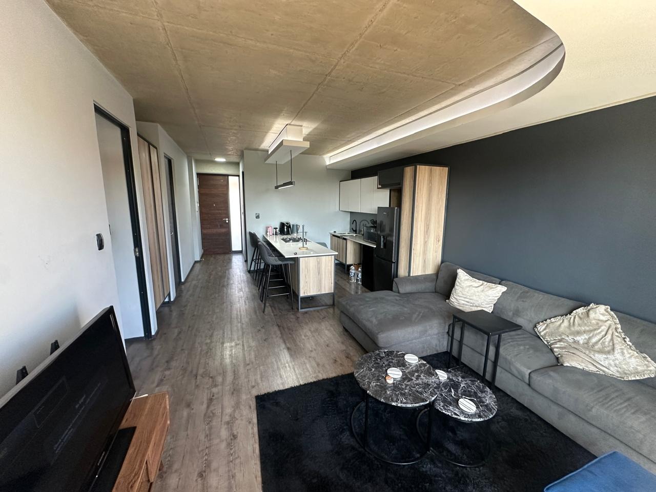 The apartment features two spacious bedrooms and a beautifully finished bathroom, designed with modern touches that complement the overall clean and contemporary look. The open-plan living and dining area flows effortlessly into a sleek kitchen, creating a comfortable and inviting space for everyday living or entertaining guests.