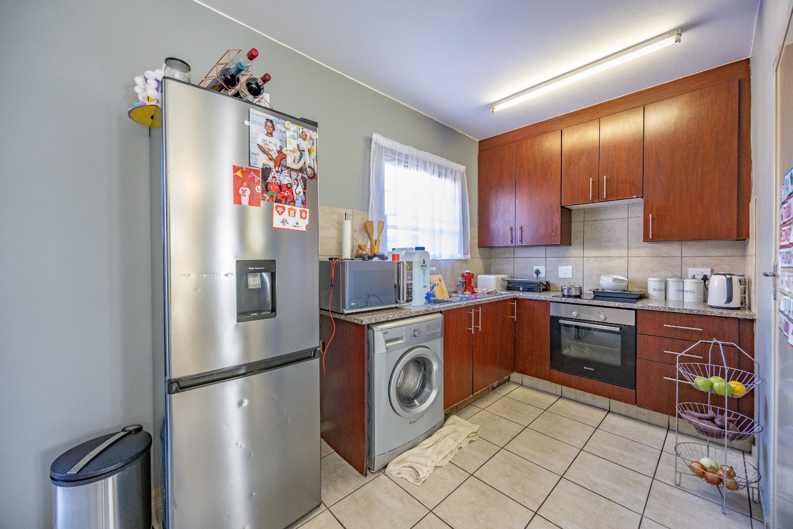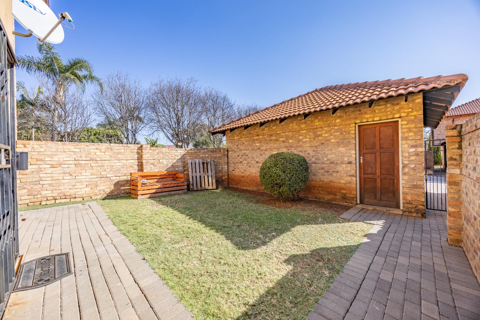 Step inside to a welcoming open-plan living and dining area, ideal for relaxing or entertaining guests. The kitchen is neatly designed and includes a convenient storage room—perfect for pantry items or additional household goods. The unit opens out to a private back garden, ideal for pets, gardening, or weekend braais. A manual double garage adds secure parking and extra storage space.
