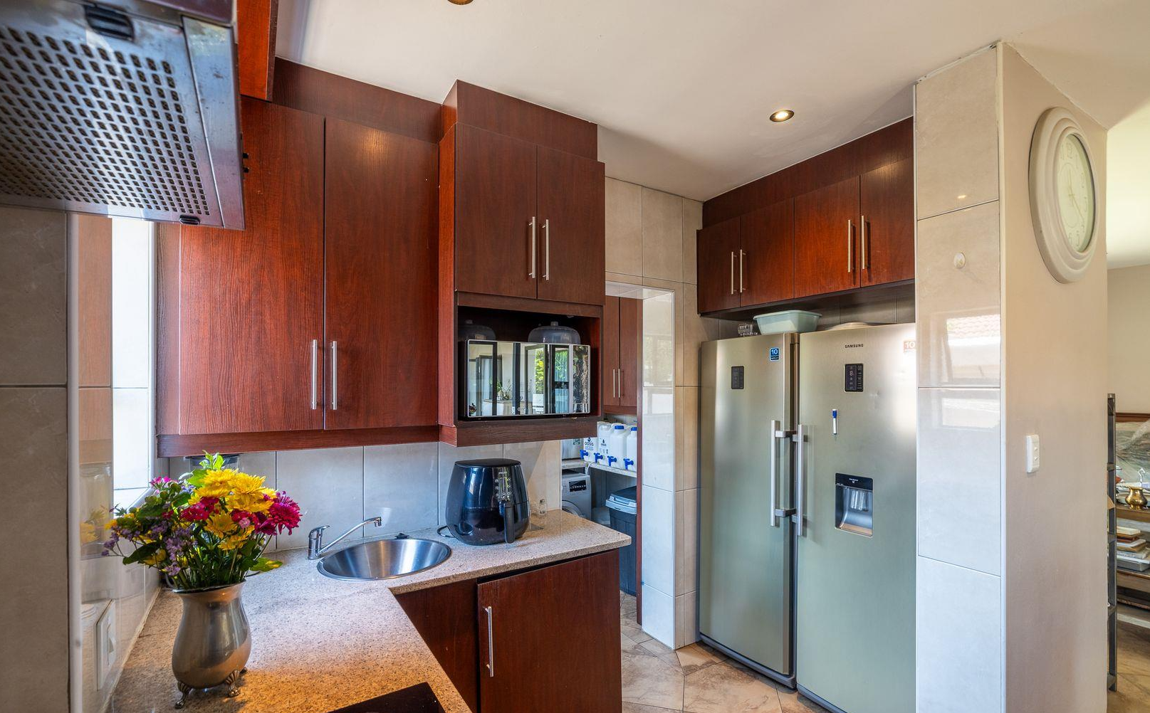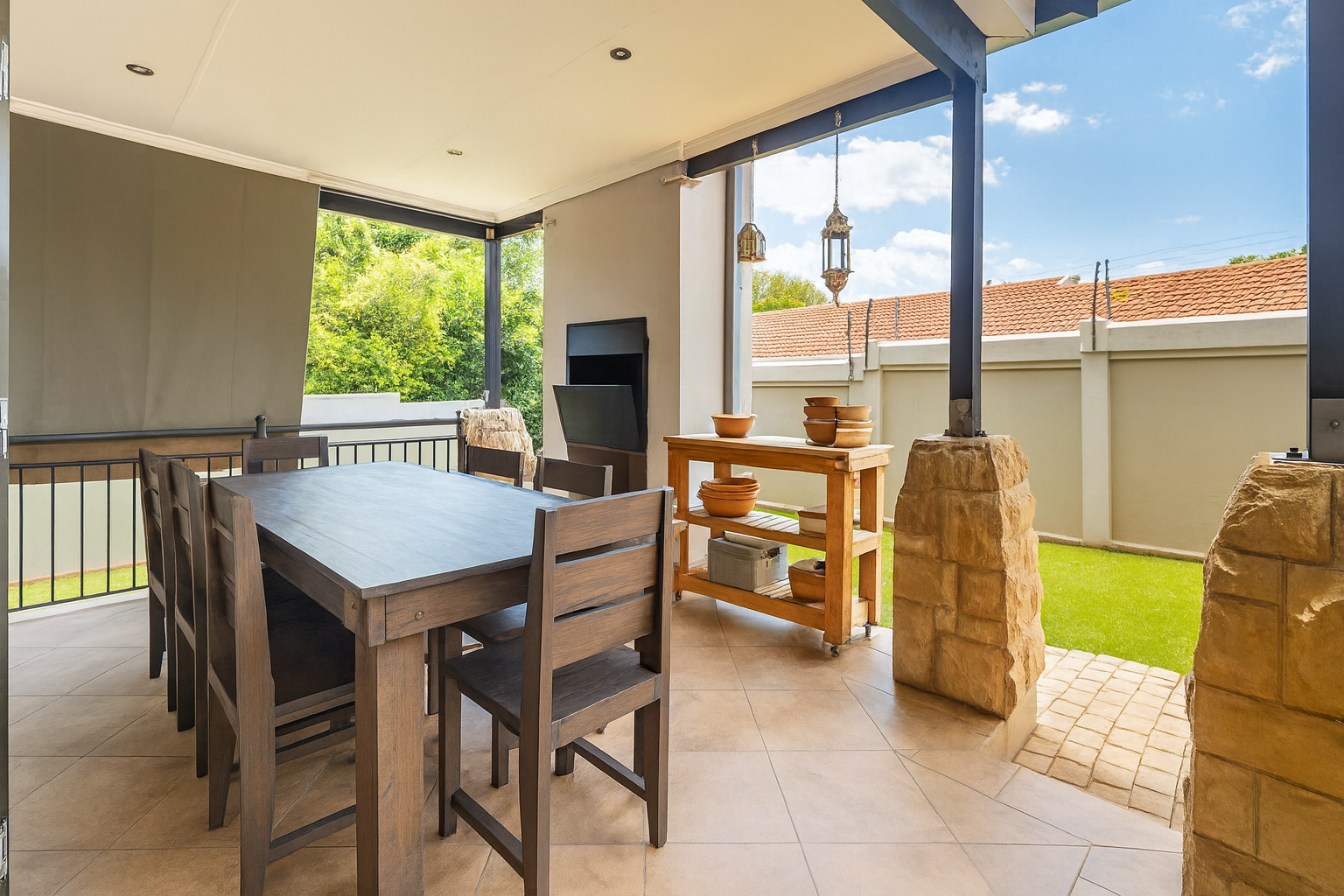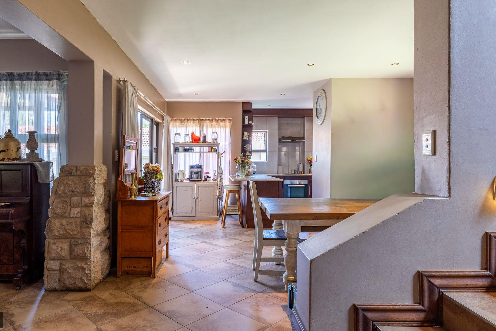 This beautifully maintained double-storey home in Mooikloof Gardens Estate offers a practical, inviting layout perfect for modern family living. The ground floor features a seamless flow between the family room, dining room, and kitchen—ideal for everyday comfort and easy entertaining. A stacking door opens the family room onto a covered patio, while the kitchen offers generous preparation space, a prep bowl, a breakfast seating area, and a separate scullery for added convenience.