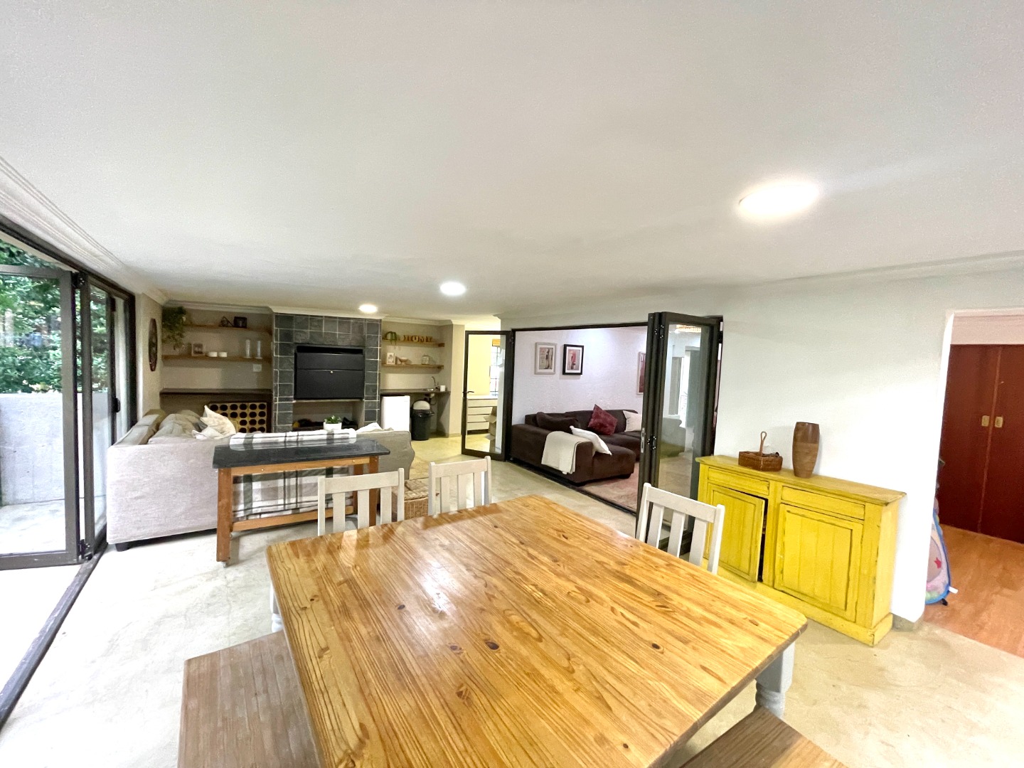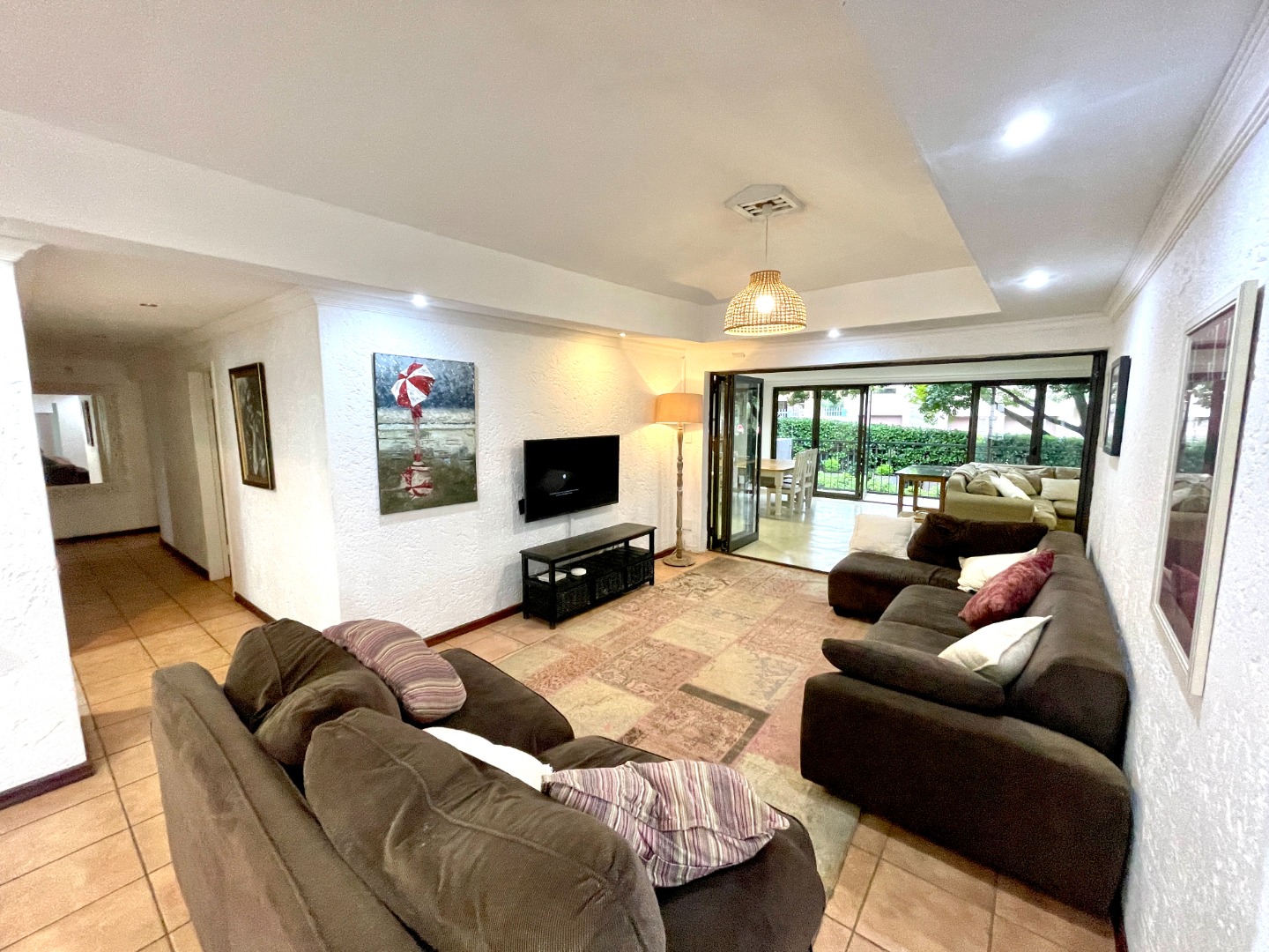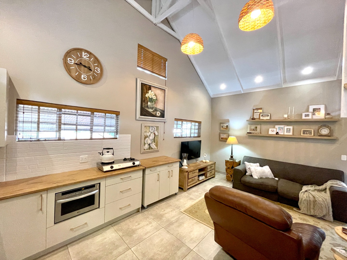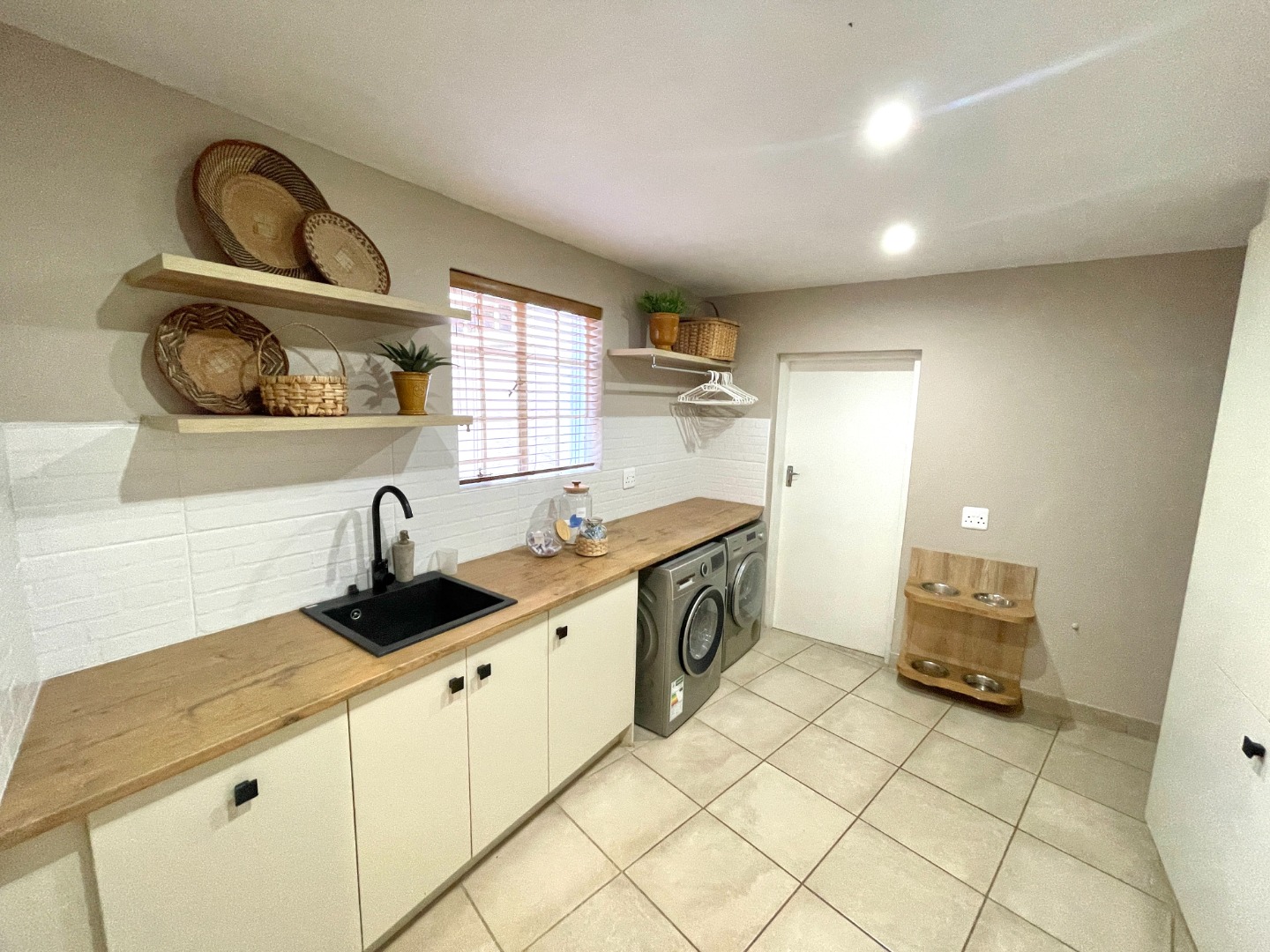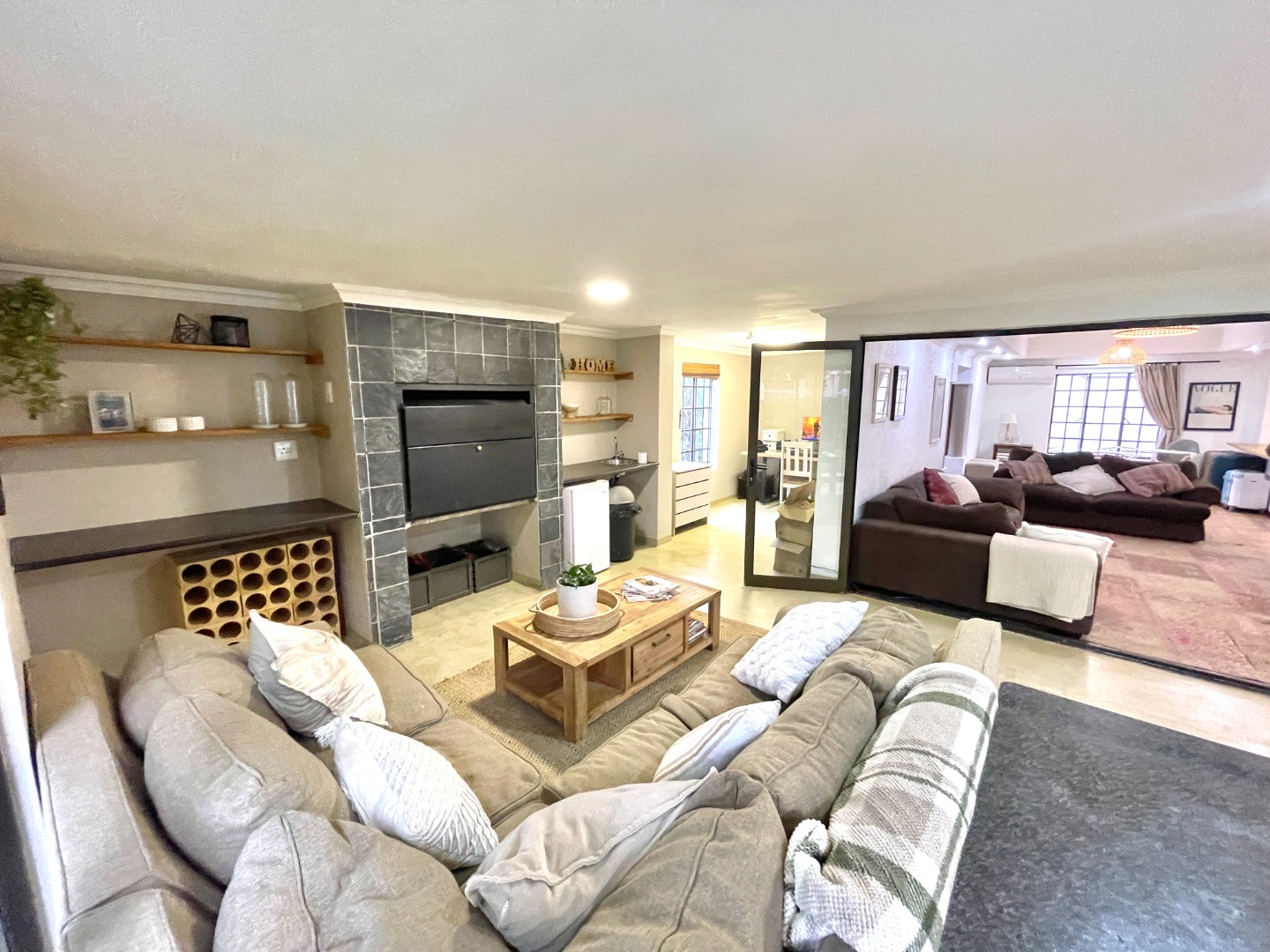 The living and dining areas flow seamlessly into an enclosed entertainment room with stack doors on three sides creating a true all-season indoor-outdoor experience. With a built-in braai, manicured garden, automated irrigation, wendy house, and a 3-vehicle carport, the home is designed for easy living and effortless entertaining.