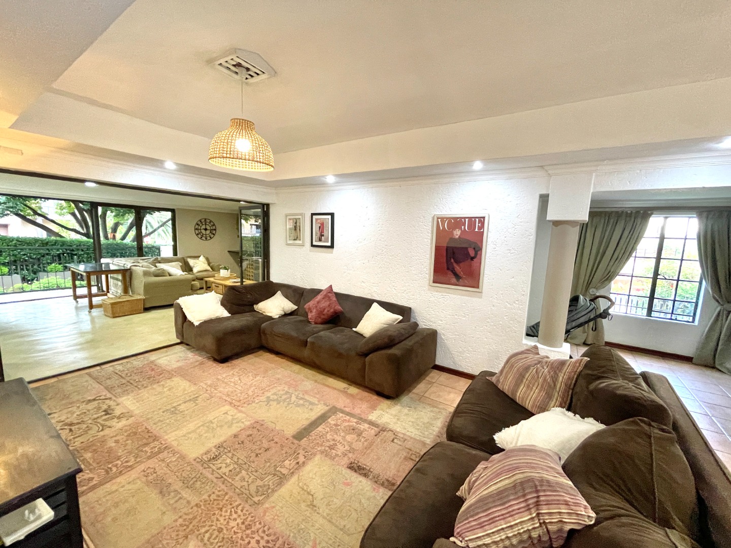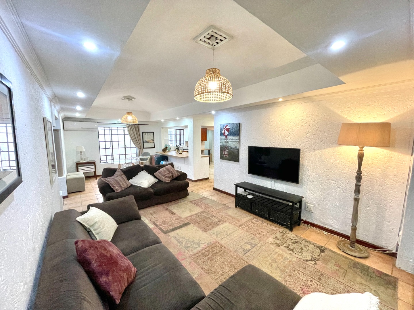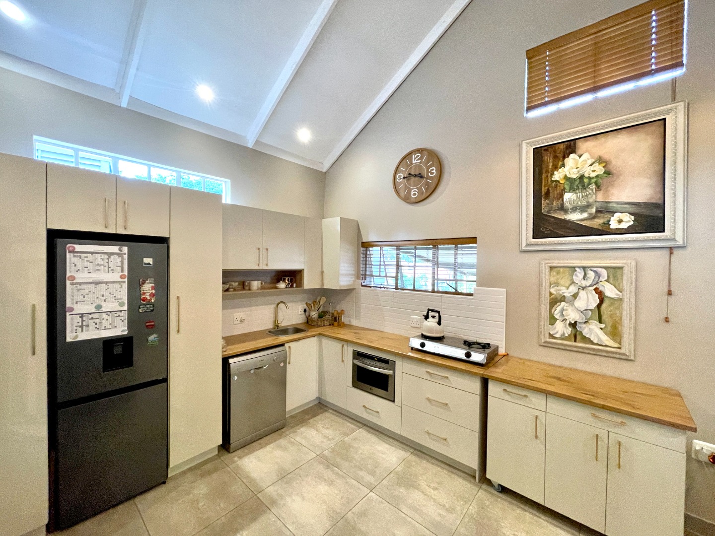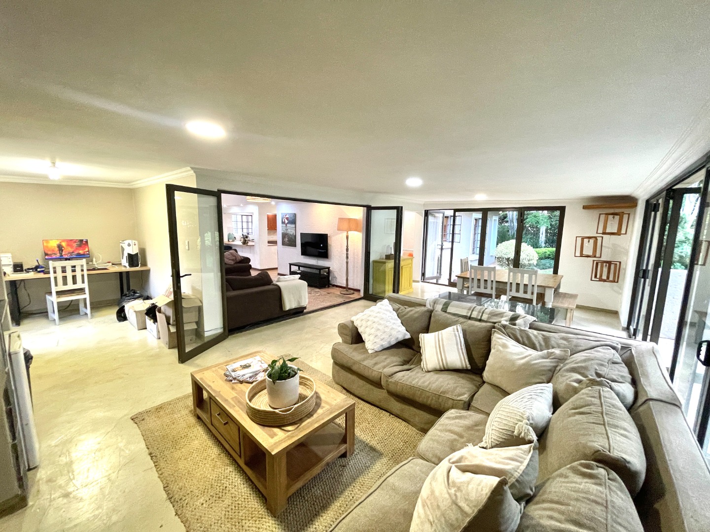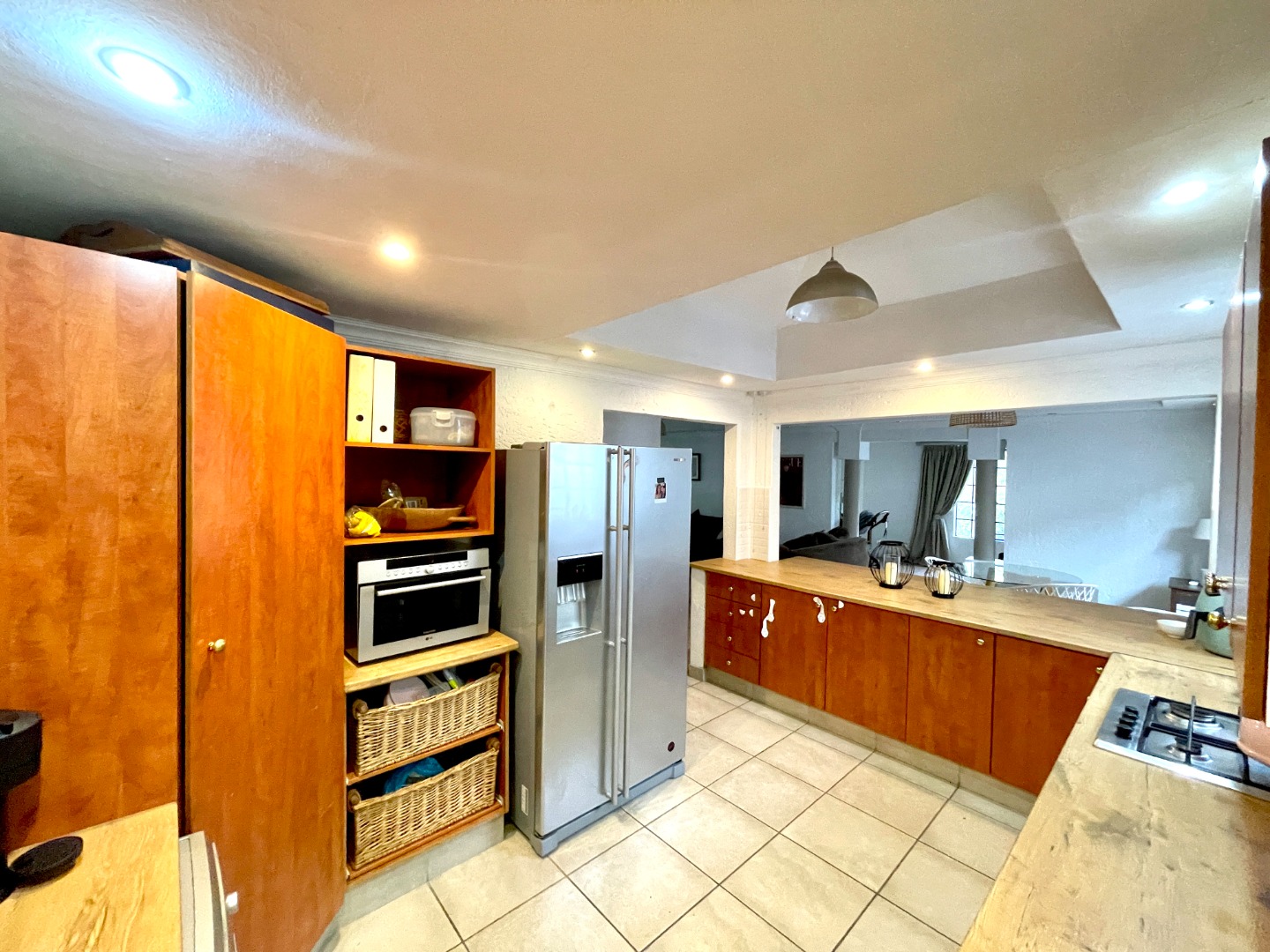 The living and dining areas flow seamlessly into an enclosed entertainment room with stack doors on three sides creating a true all-season indoor-outdoor experience. With a built-in braai, manicured garden, automated irrigation, wendy house, and a 3-vehicle carport, the home is designed for easy living and effortless entertaining.