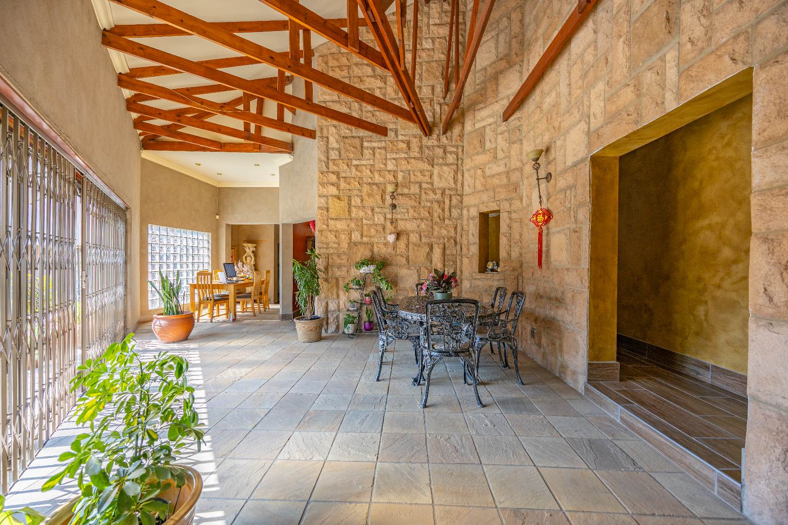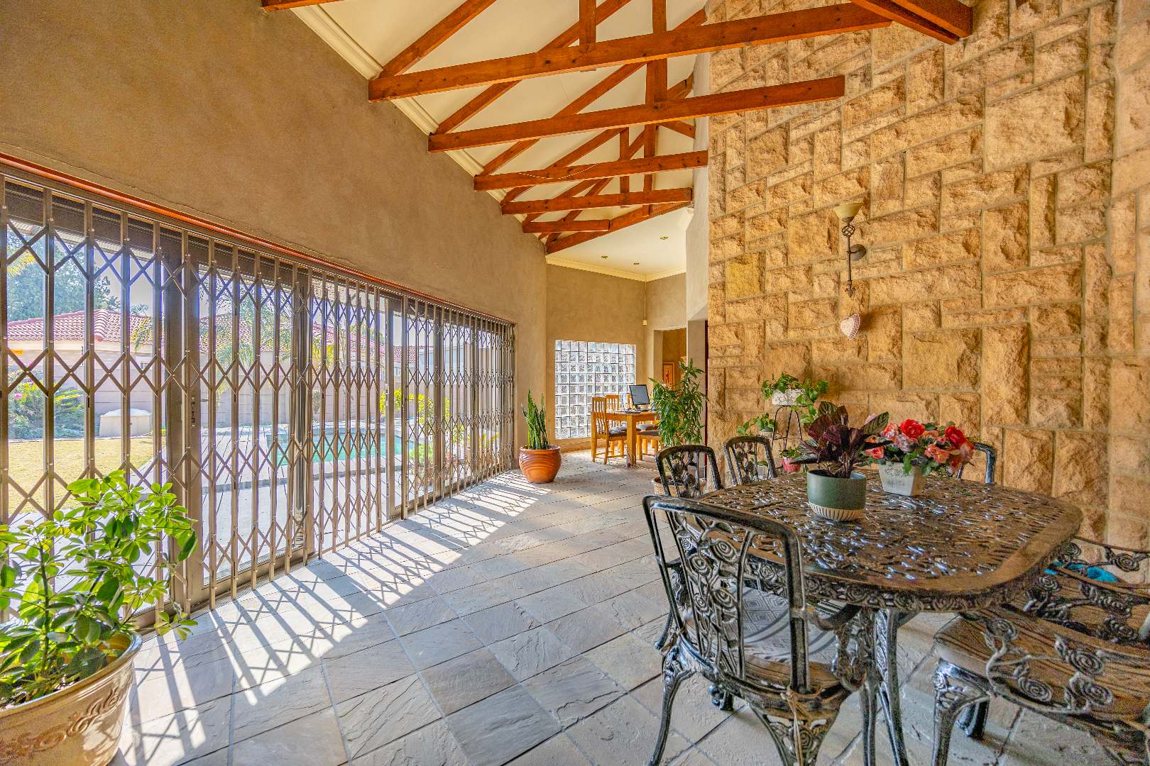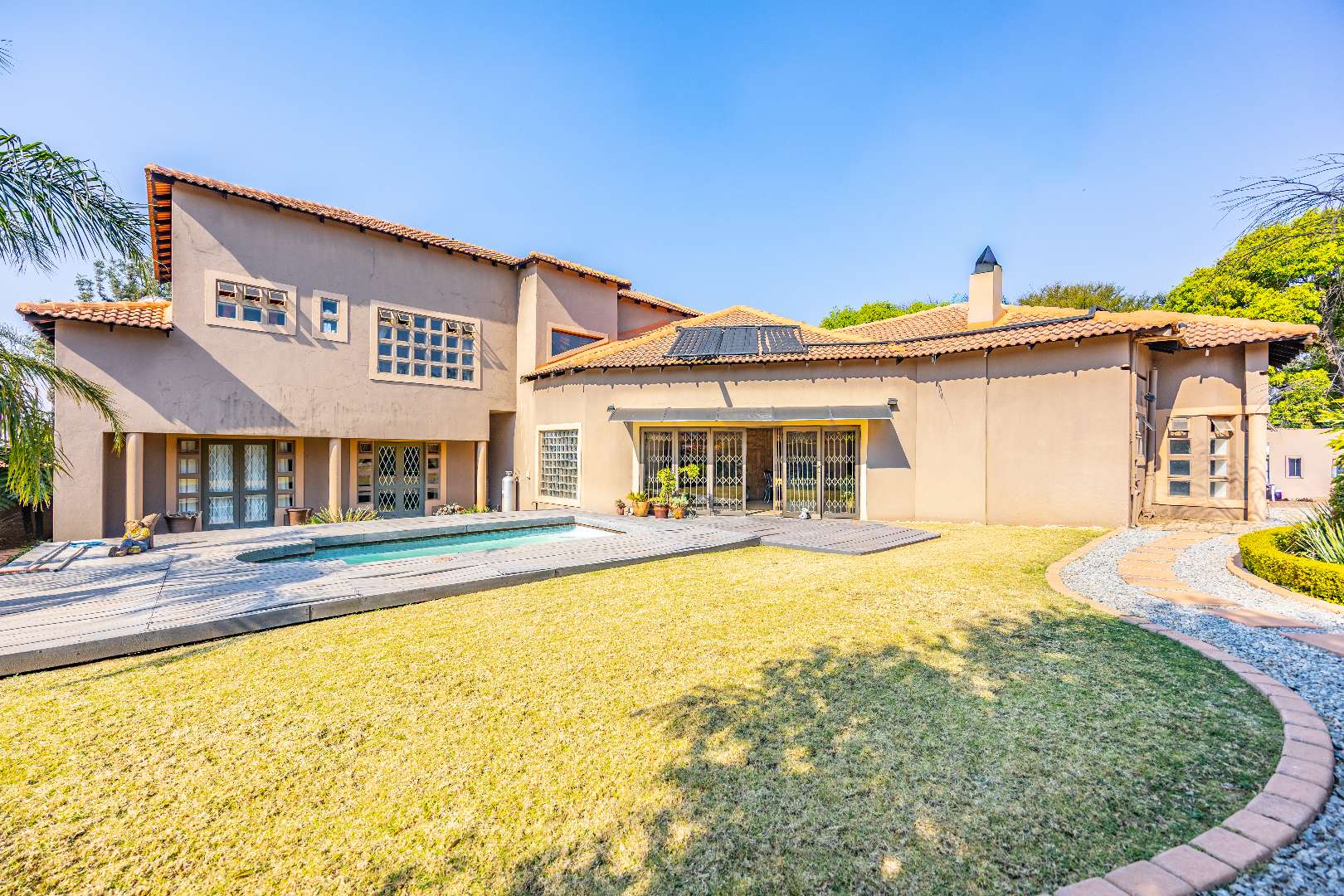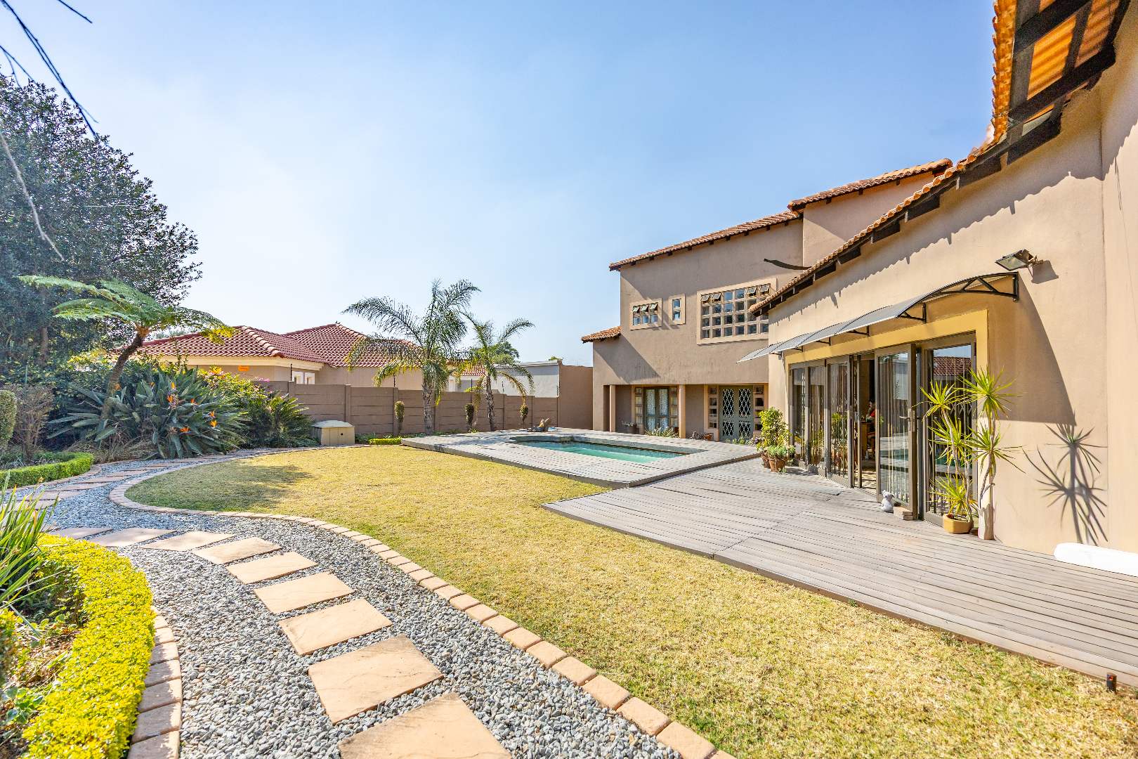 The heart of the home boasts a gourmet kitchen with granite finishes, two pantries, and a separate scullery. Stacking doors open to the lush garden, where a sparkling swimming pool and sun deck create the ultimate outdoor retreat. An indoor braai ensures year-round entertainment, while a dedicated office space provides the perfect setting for remote work or studies.