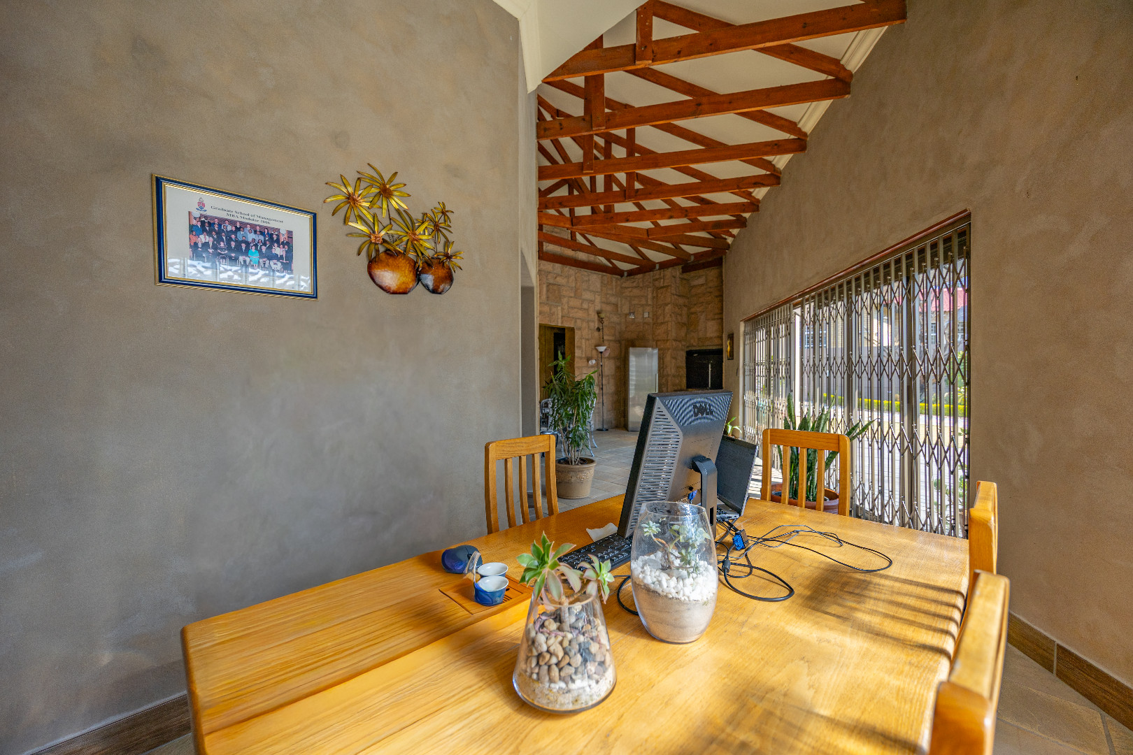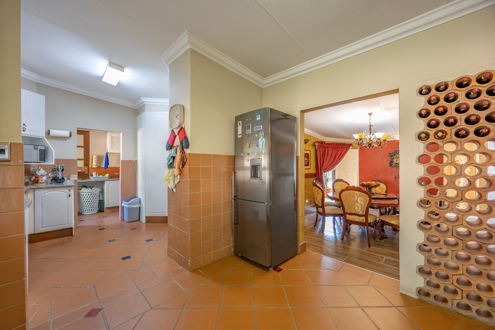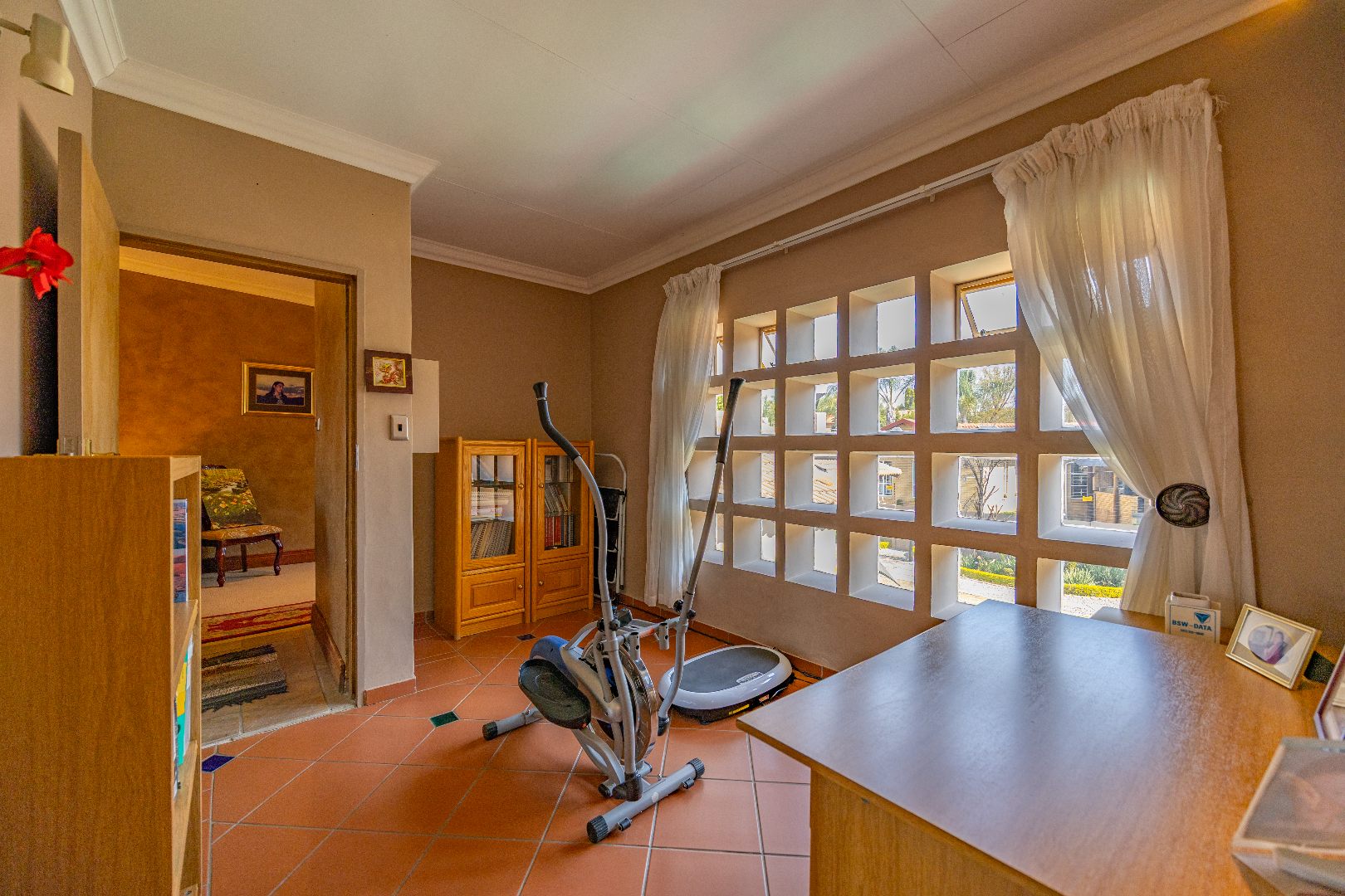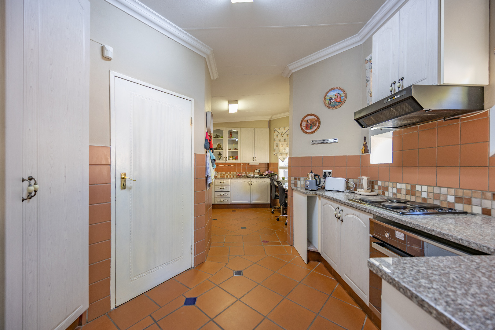The heart of the home boasts a gourmet kitchen with granite finishes, two pantries, and a separate scullery. Stacking doors open to the lush garden, where a sparkling swimming pool and sun deck create the ultimate outdoor retreat. An indoor braai ensures year-round entertainment, while a dedicated office space provides the perfect setting for remote work or studies.