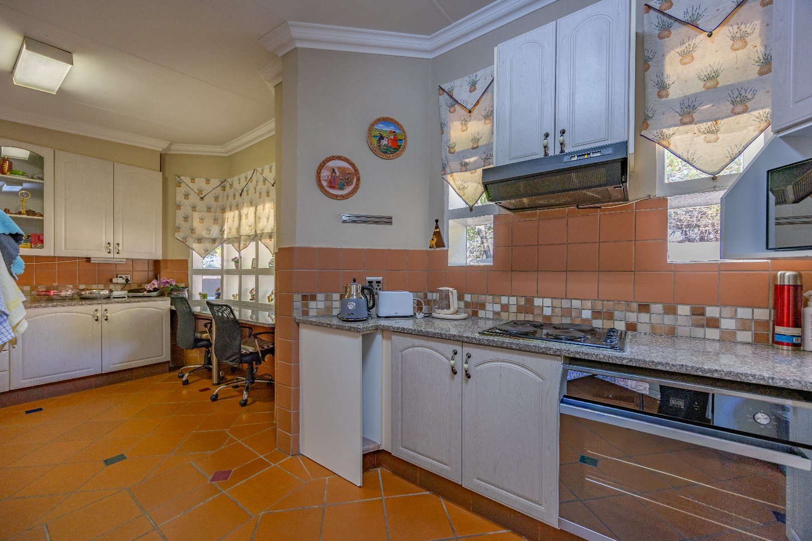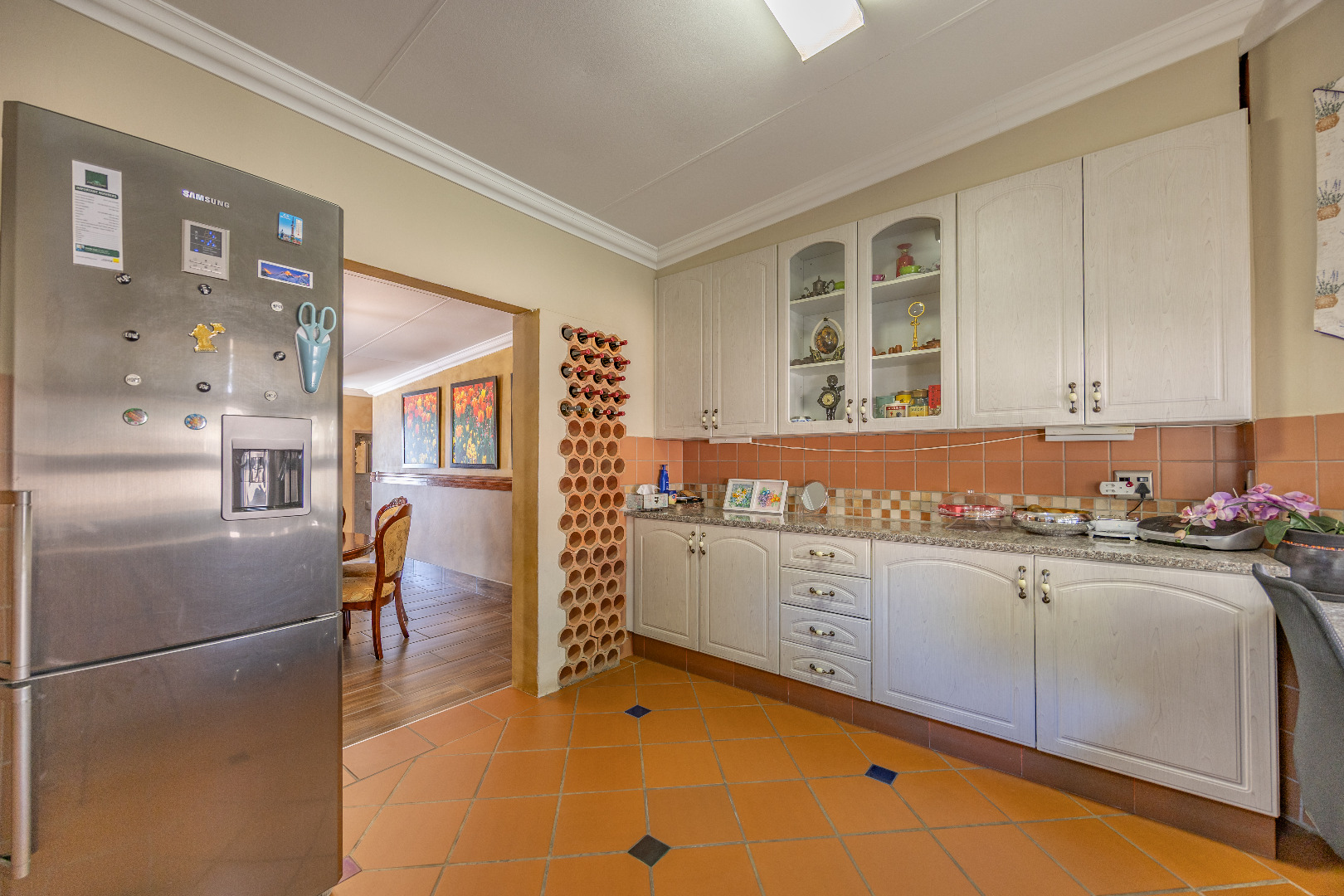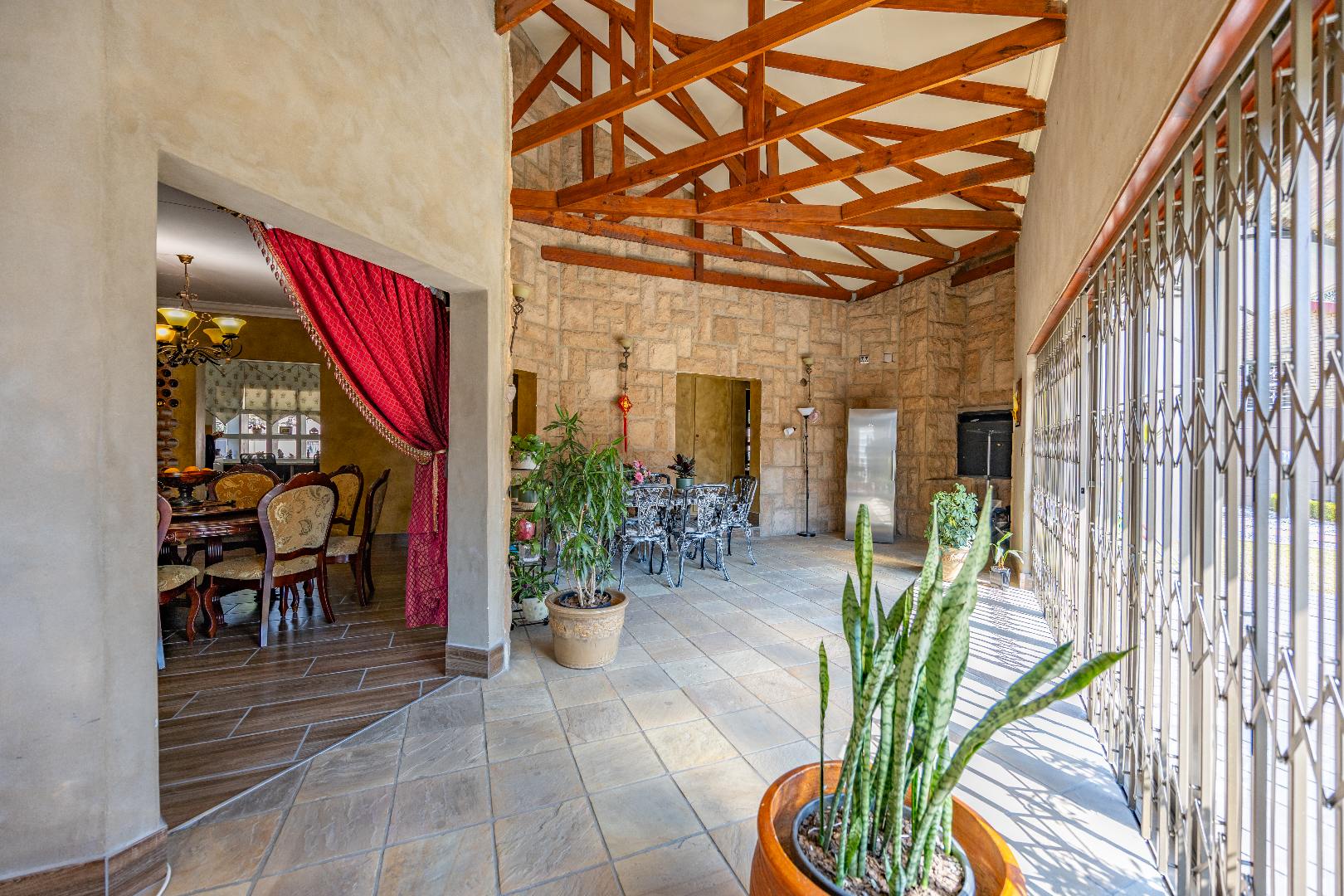 The heart of the home boasts a gourmet kitchen with granite finishes, two pantries, and a separate scullery. Stacking doors open to the lush garden, where a sparkling swimming pool and sun deck create the ultimate outdoor retreat. An indoor braai ensures year-round entertainment, while a dedicated office space provides the perfect setting for remote work or studies.