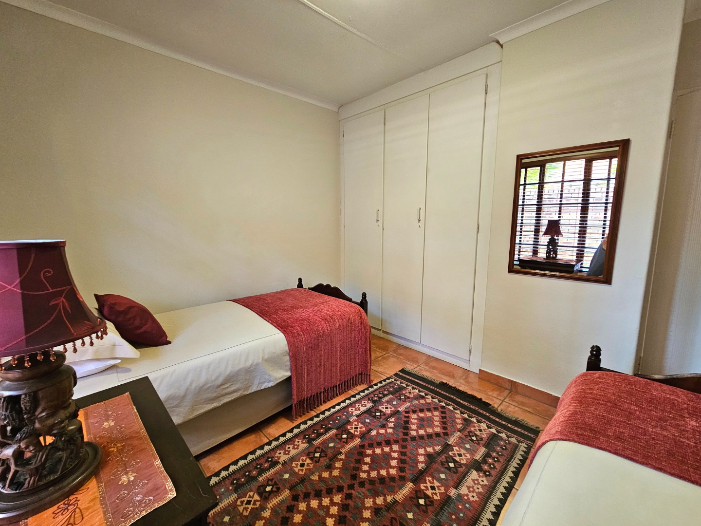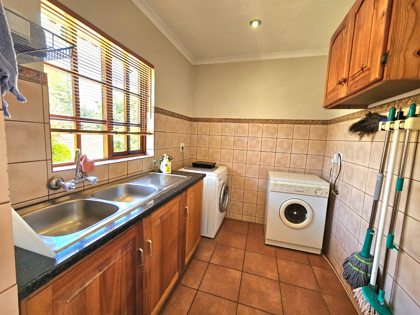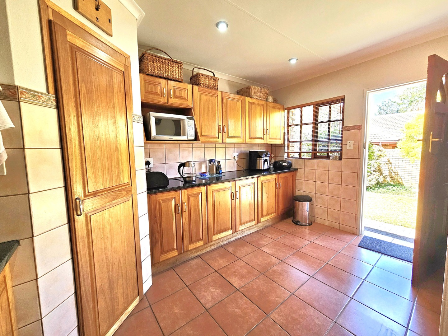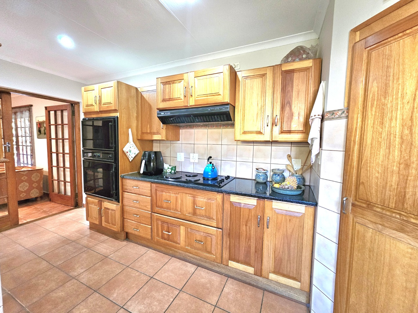 The well-equipped kitchen is both functional and inviting, offering ample cupboard space, granite countertops, and a pantry—ideal for anyone who enjoys cooking and hosting. A separate scullery provides space for double fridges, a dishwasher, a top-loader washing machine, and a tumble dryer, ensuring effortless convenience. From the kitchen and lounge, doors open onto an enclosed patio with a built-in braai and extends to a lovely veranda overlooking the garden—the perfect spot for relaxing or spending time with family and friends.