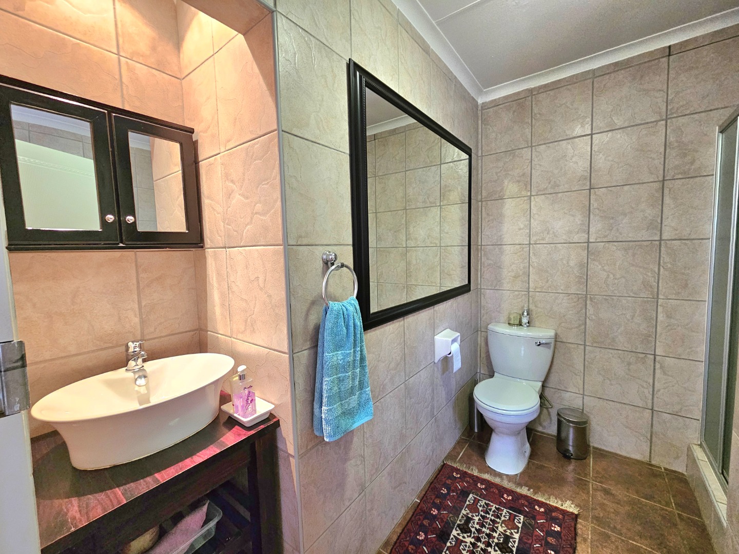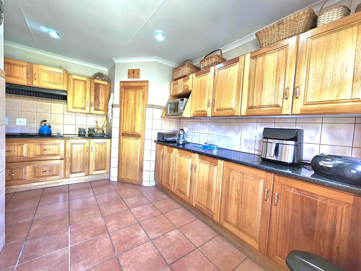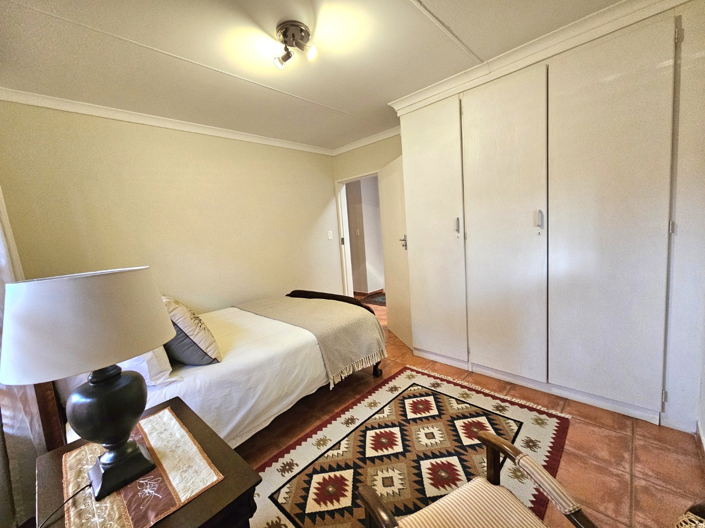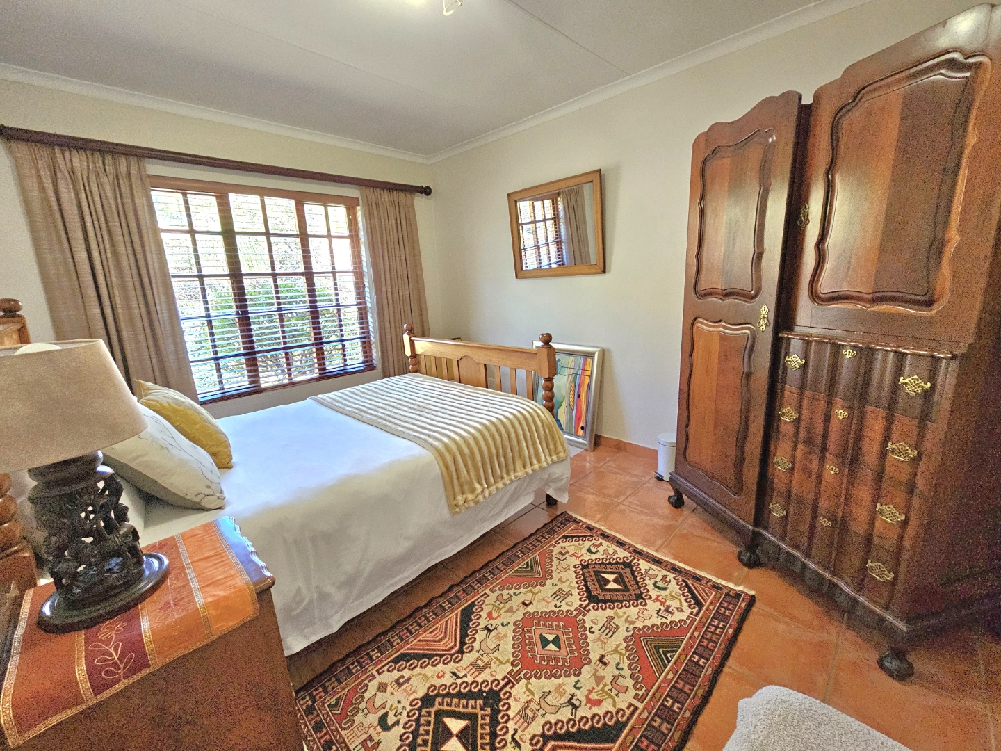 The well-equipped kitchen is both functional and inviting, offering ample cupboard space, granite countertops, and a pantry—ideal for anyone who enjoys cooking and hosting. A separate scullery provides space for double fridges, a dishwasher, a top-loader washing machine, and a tumble dryer, ensuring effortless convenience. From the kitchen and lounge, doors open onto an enclosed patio with a built-in braai and extends to a lovely veranda overlooking the garden—the perfect spot for relaxing or spending time with family and friends.